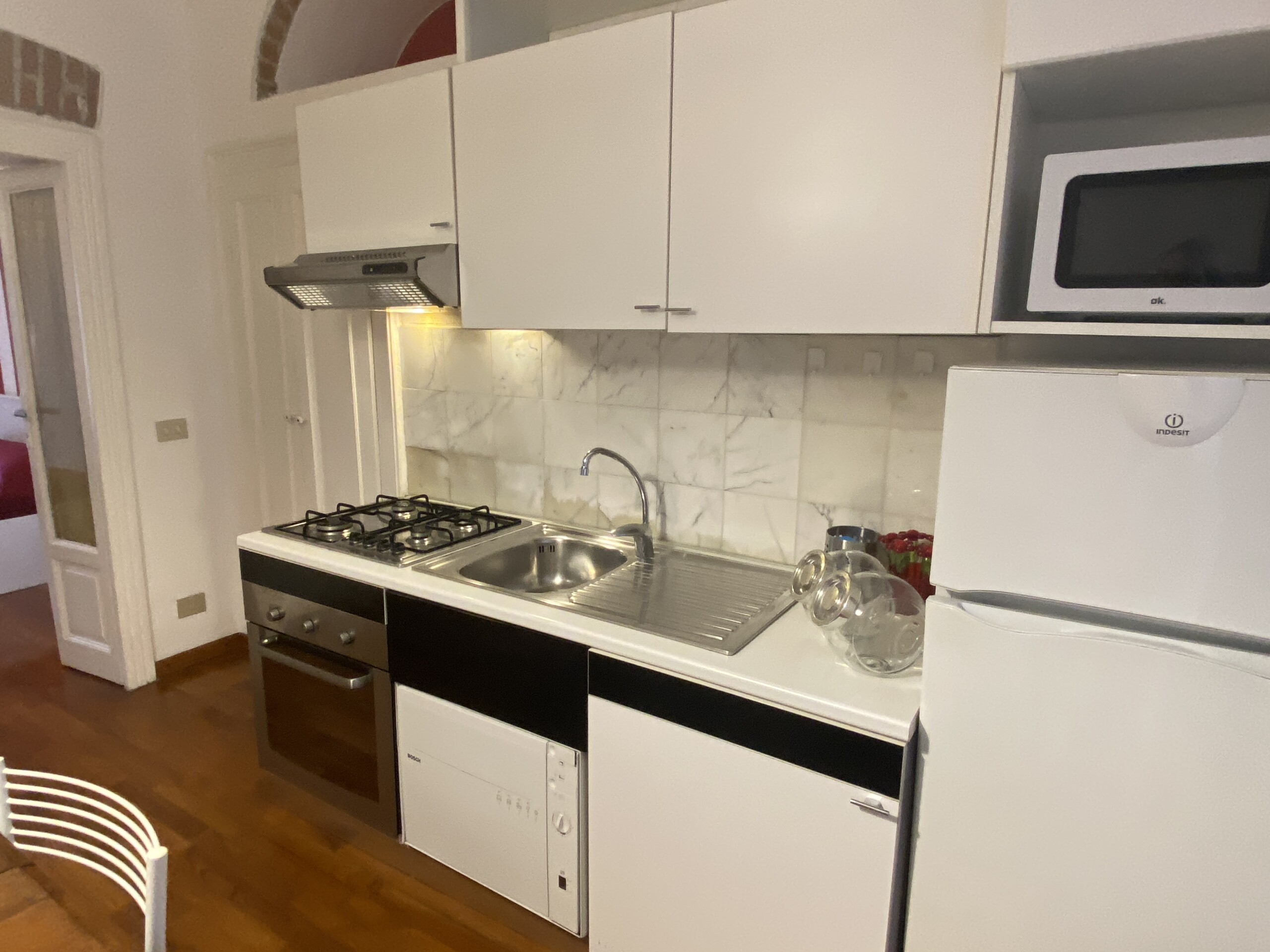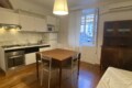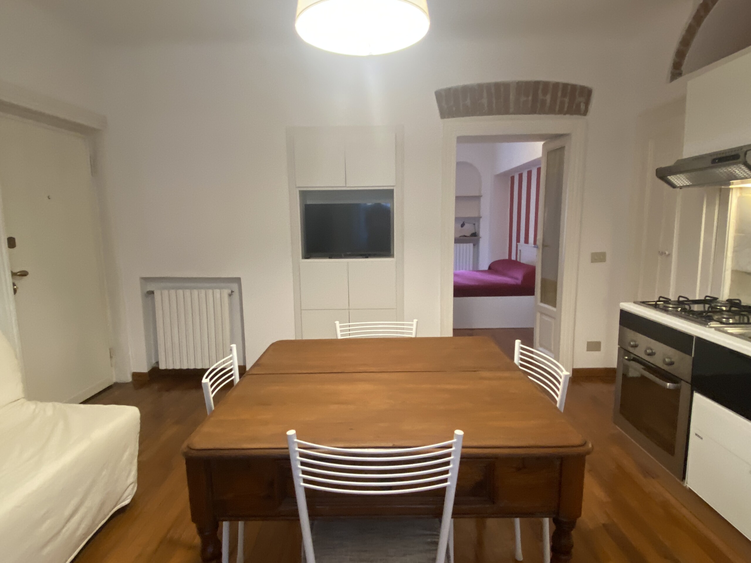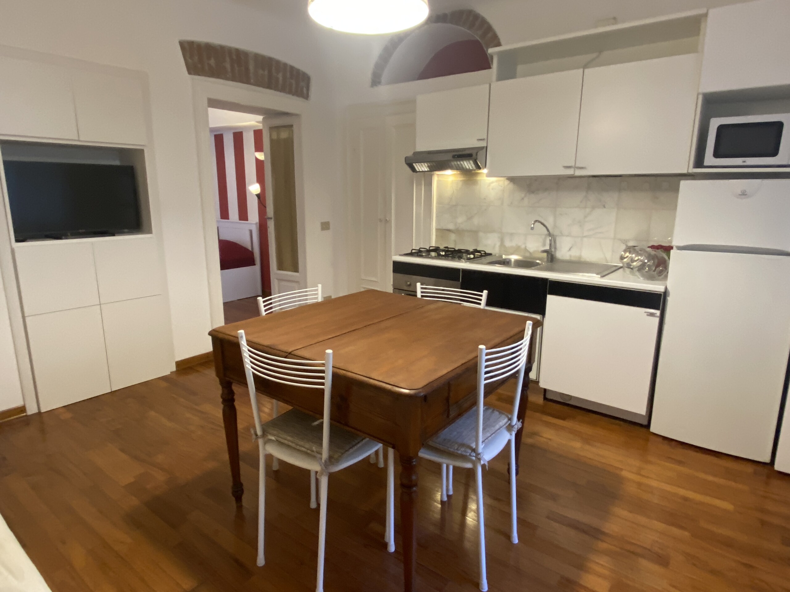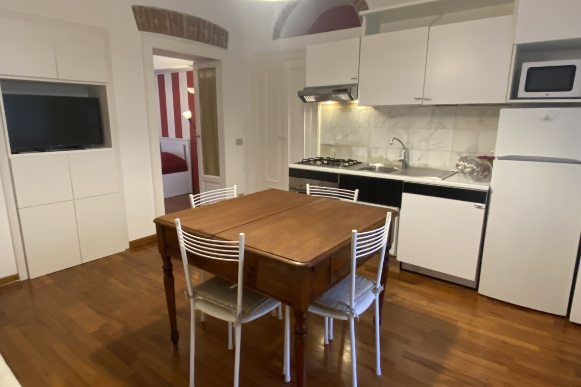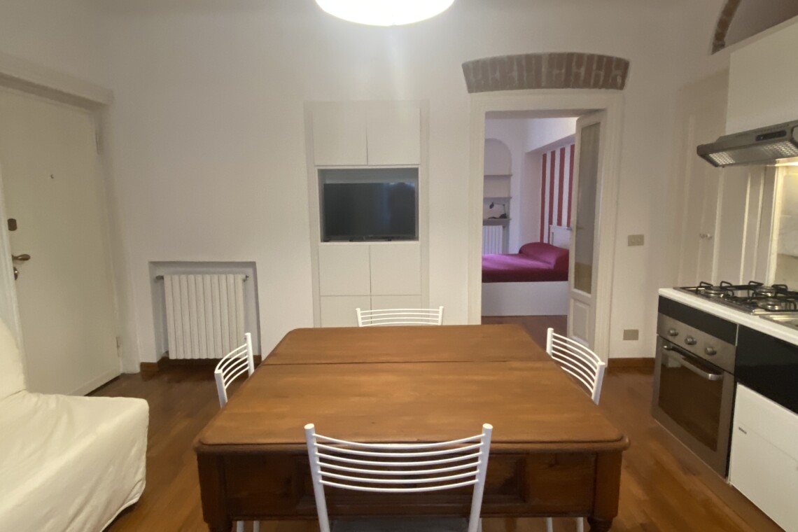 Inside, you’ll find elegant wooden parquet flooring and a welcoming living room with a sofa bed (sleeps 1–1.5 people), TV, extendible dining table with chairs, and a fully equipped open-plan kitchen featuring a gas cooktop, electric oven, microwave, and a small dishwasher. The window overlooks the quiet internal courtyard, and the apartment is fitted with air conditioning.