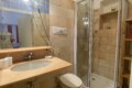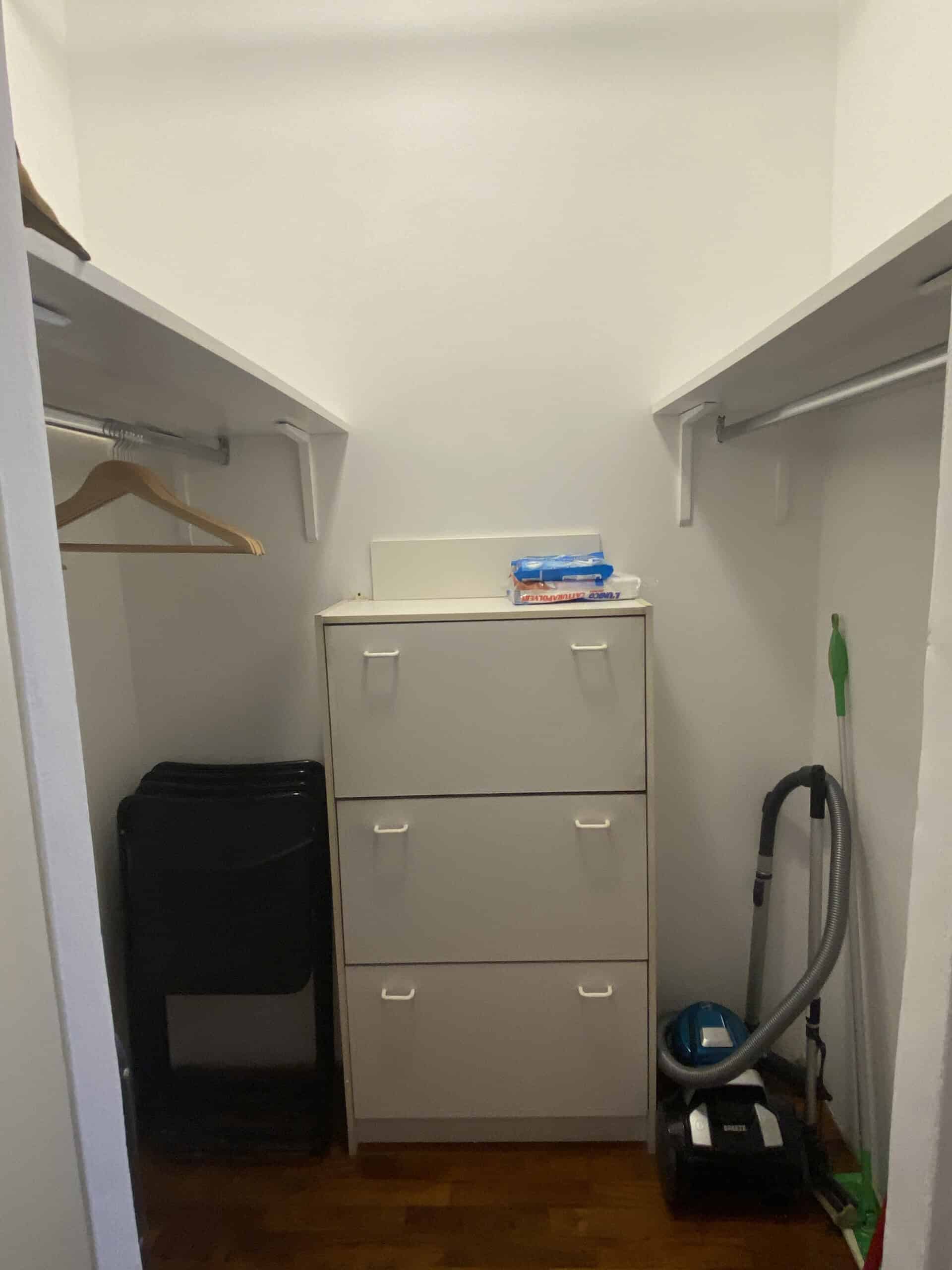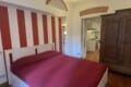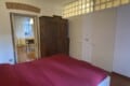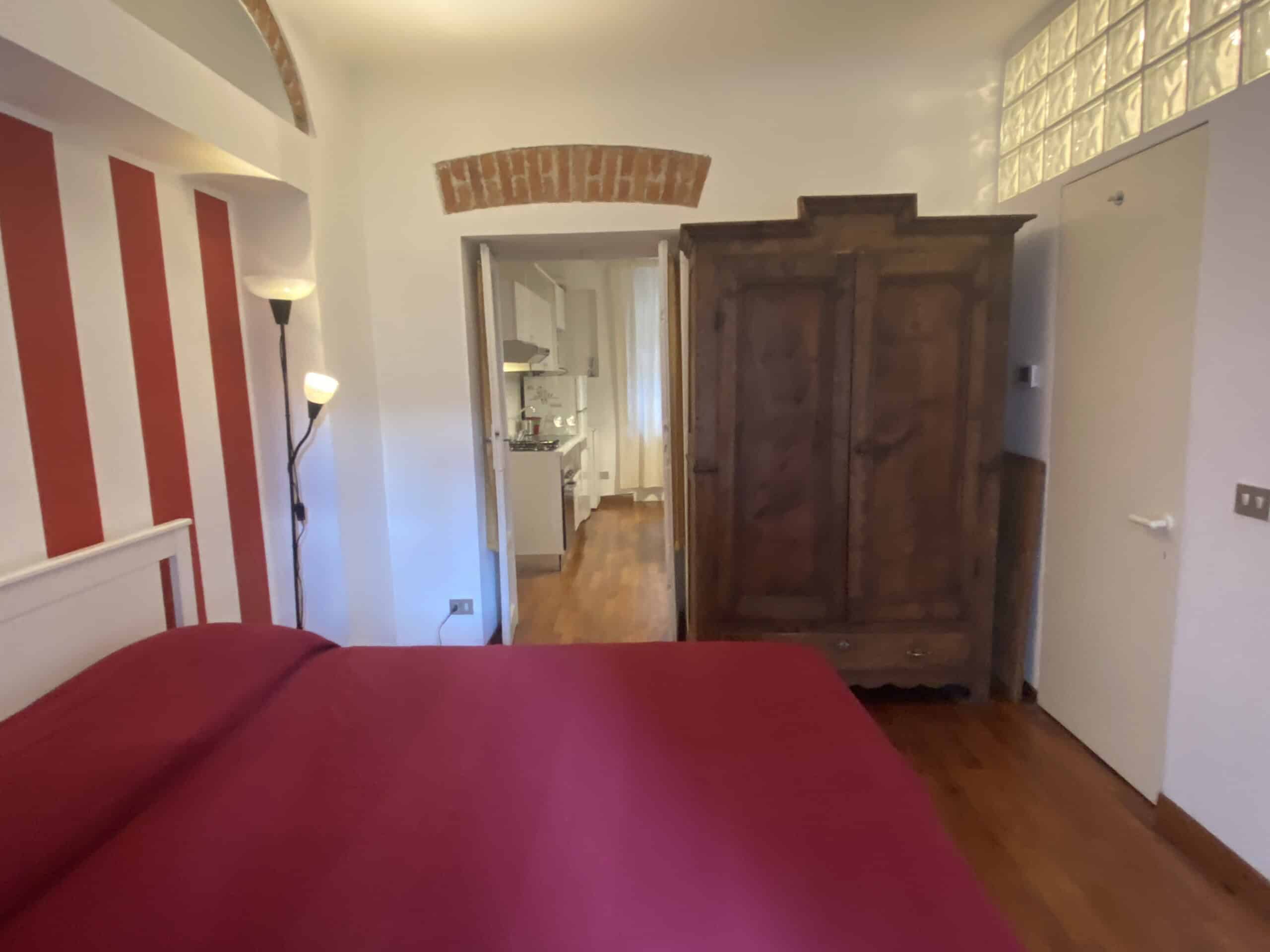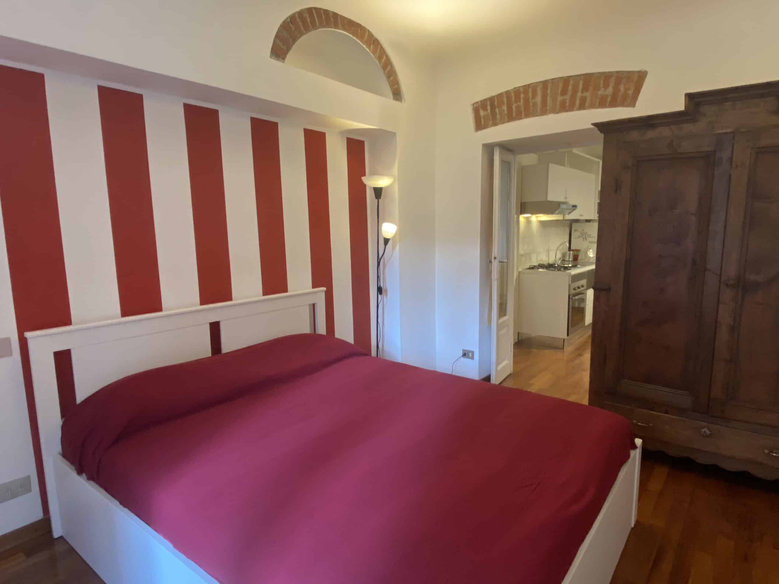 The bedroom is warm and inviting, with decorative red accents on the walls that give it a romantic touch. It offers a double bed, a wardrobe, and a spacious walk-in closet. The bathroom includes a shower, an air extractor (as there is no window), and a toilet with integrated bidet function.