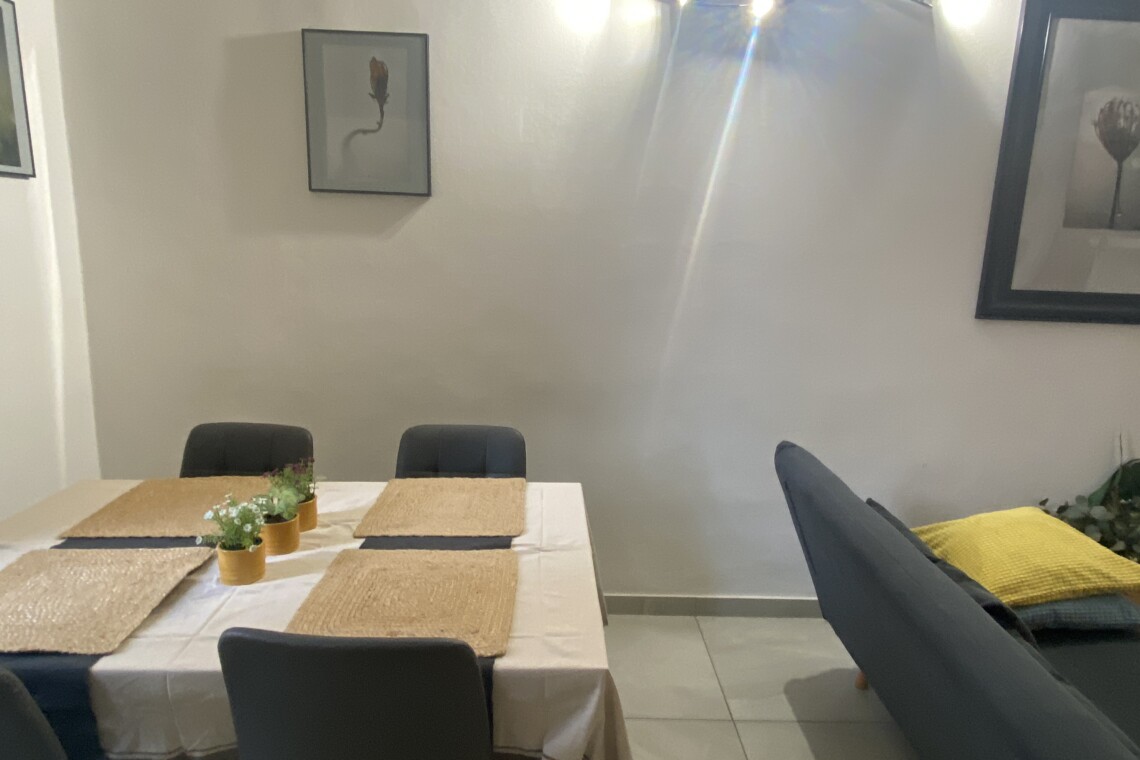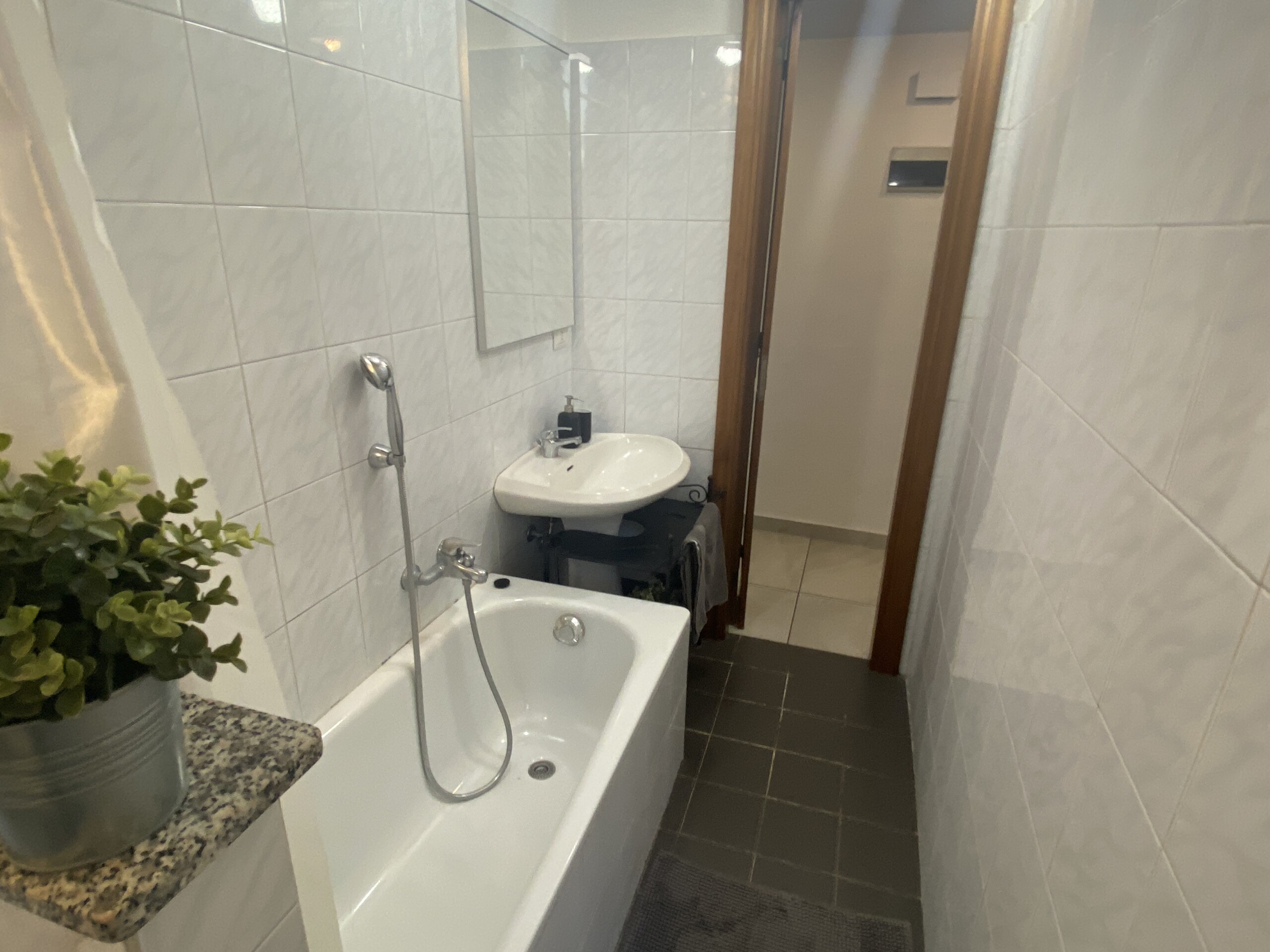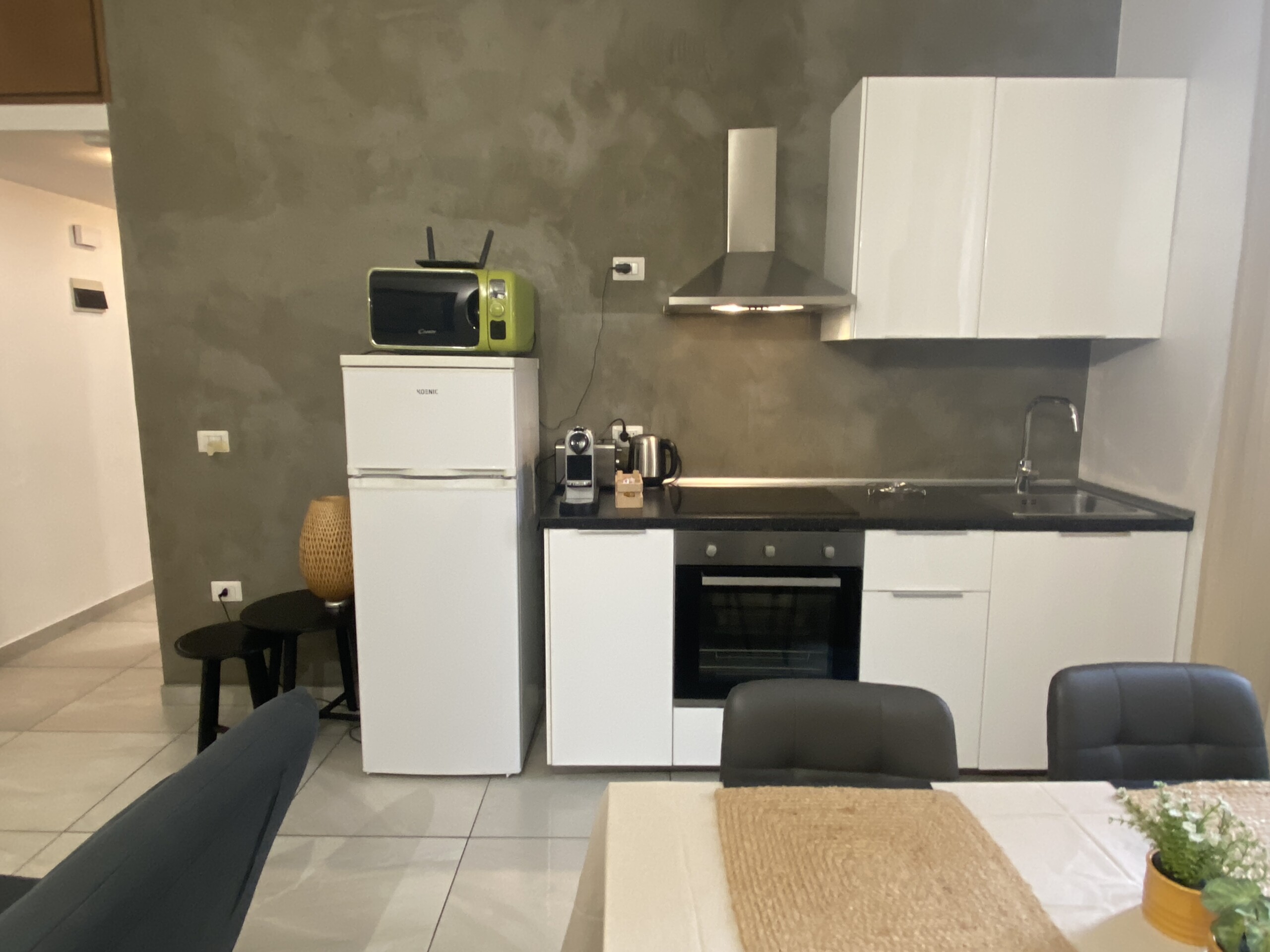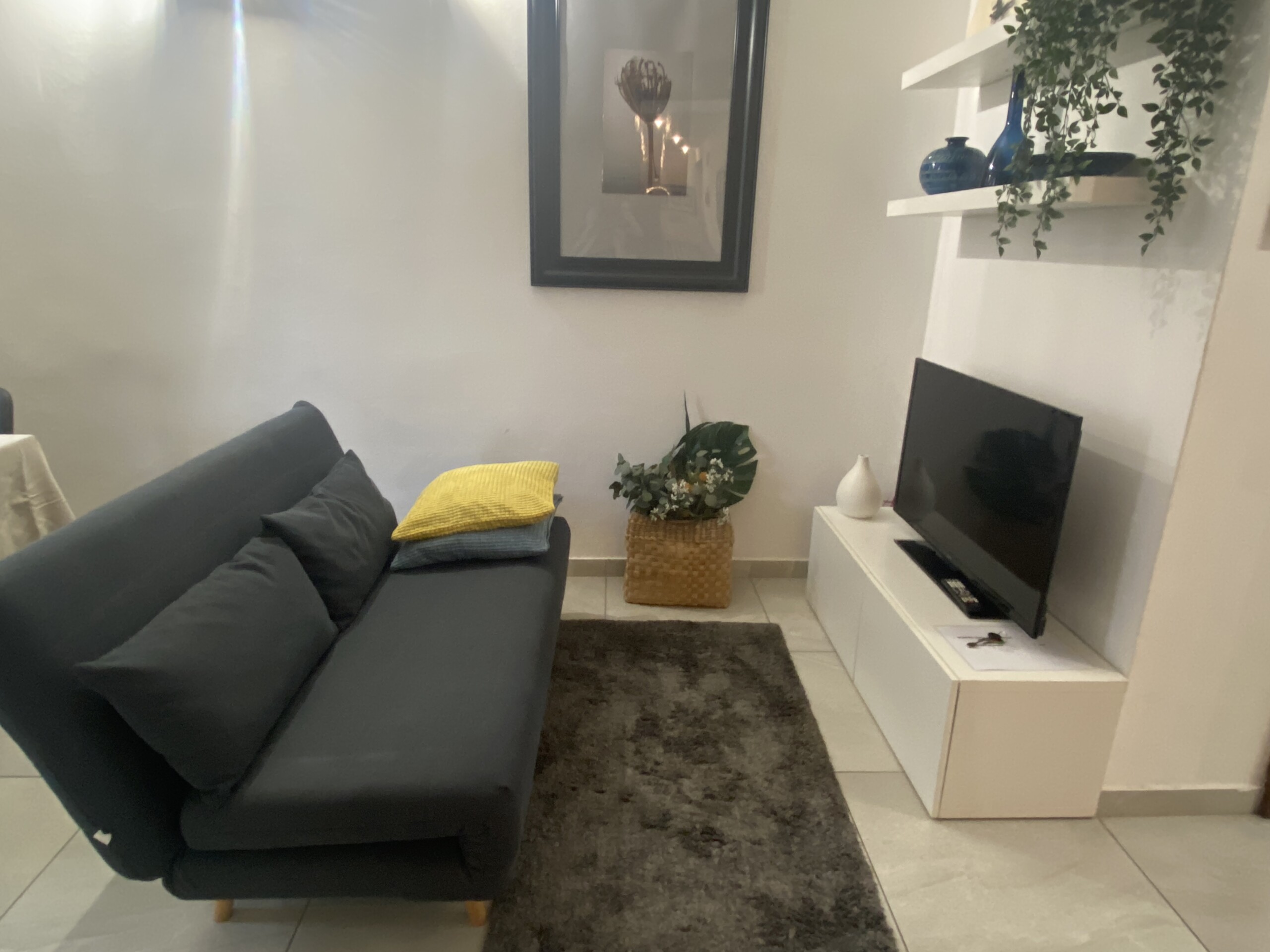 From the hall you access the bright living room, furnished with a comfortable sofa and TV. The modern, fully equipped kitchen includes induction hobs, electric oven, microwave oven, fridge-freezer, and a dining table with chairs, offering everything needed for everyday living.