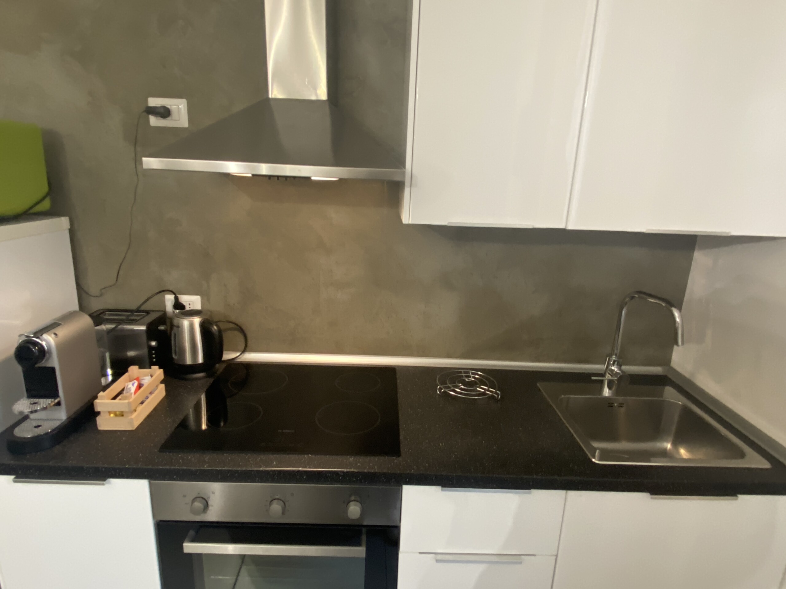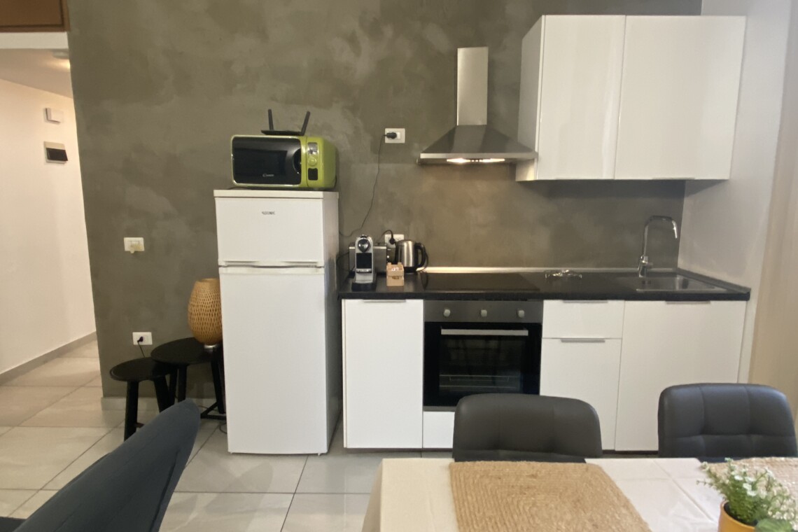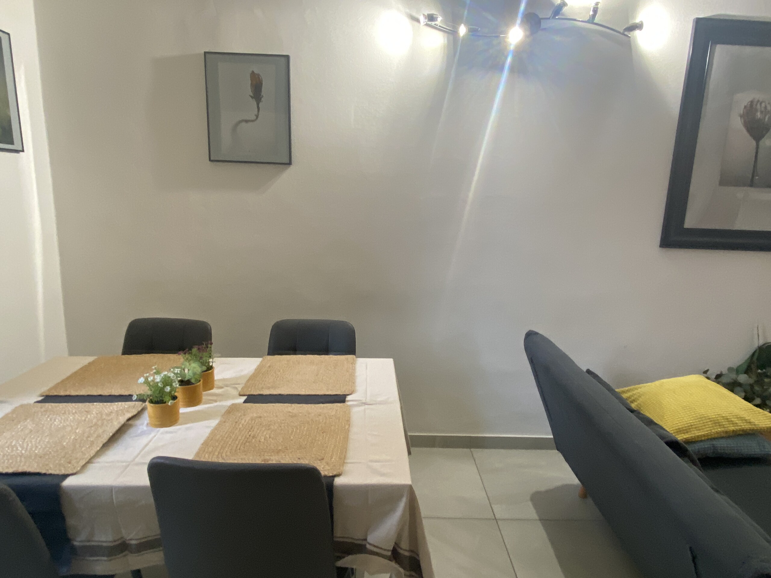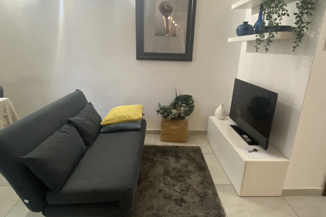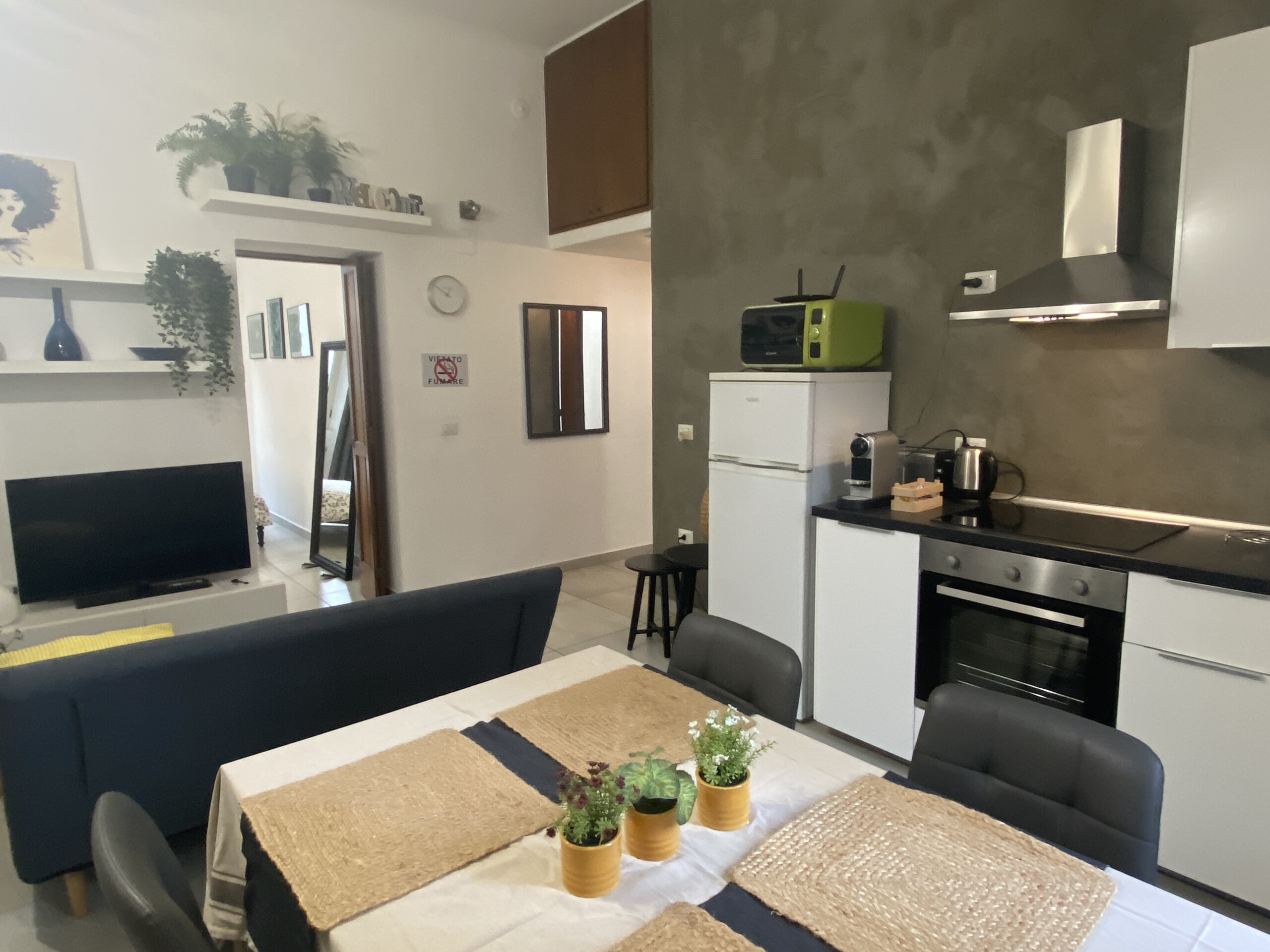 From the hall you access the bright living room, furnished with a comfortable sofa and TV. The modern, fully equipped kitchen includes induction hobs, electric oven, microwave oven, fridge-freezer, and a dining table with chairs, offering everything needed for everyday living.