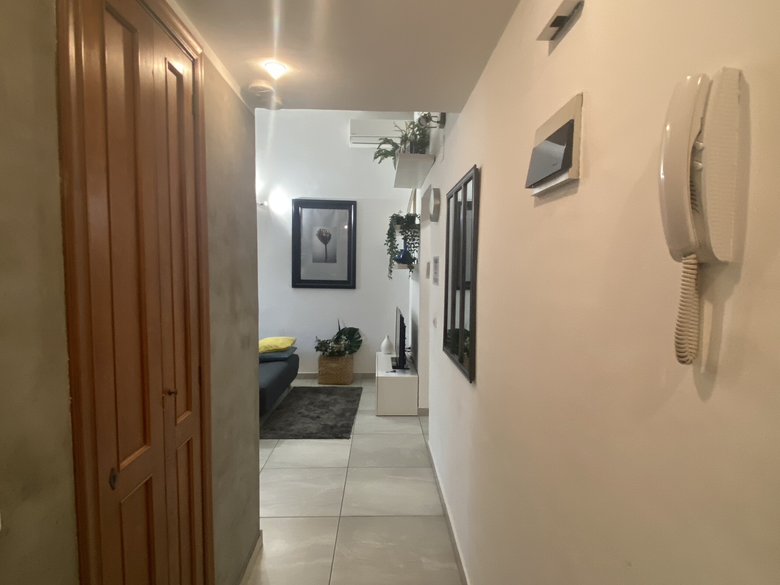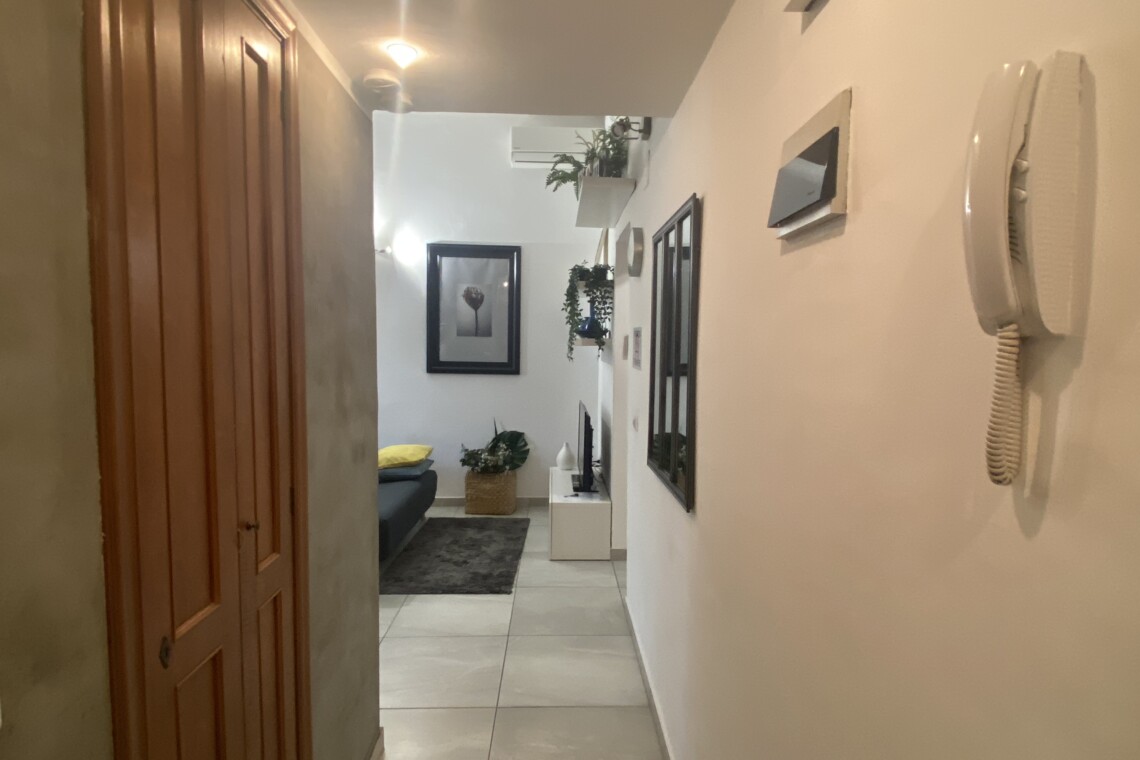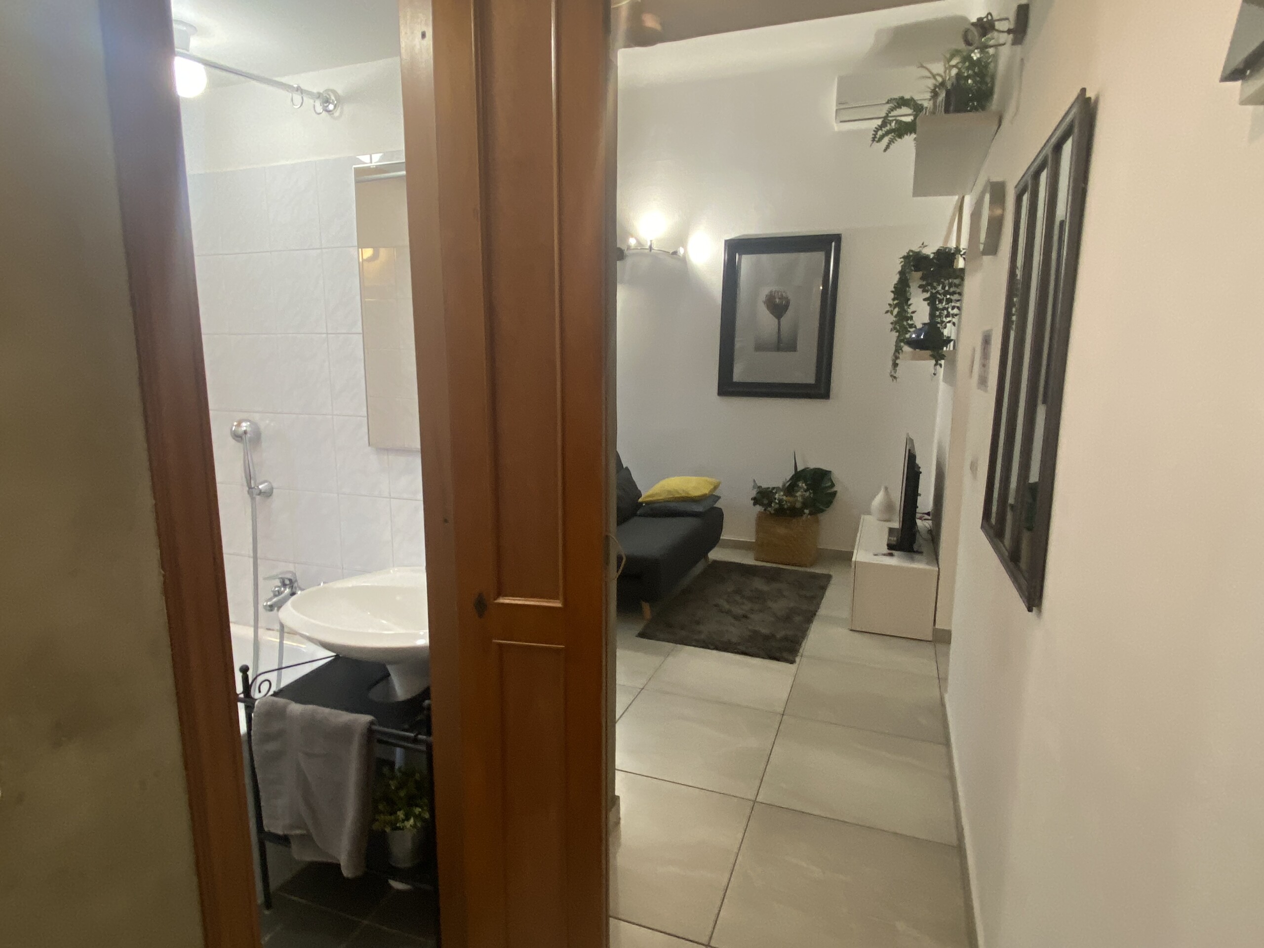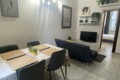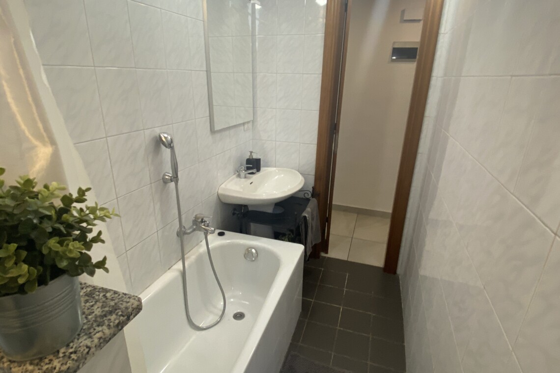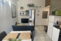 From the hall you access the bright living room, furnished with a comfortable sofa and TV. The modern, fully equipped kitchen includes induction hobs, electric oven, microwave oven, fridge-freezer, and a dining table with chairs, offering everything needed for everyday living.