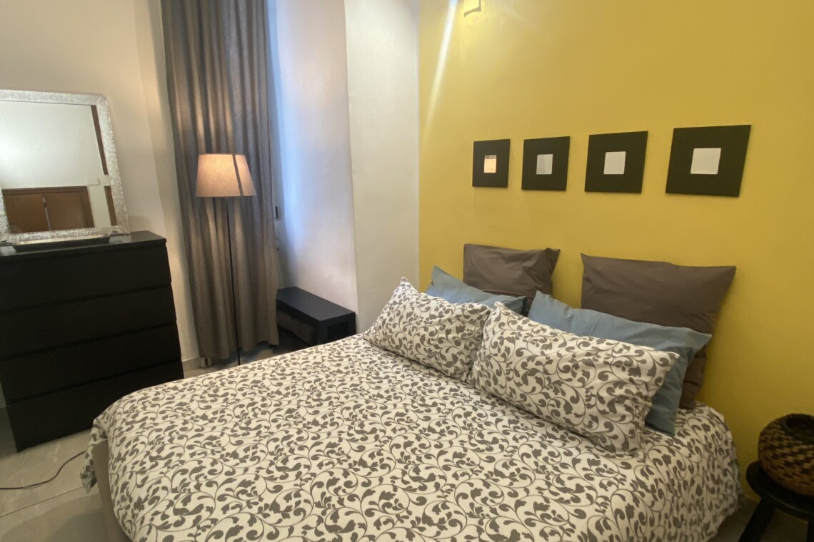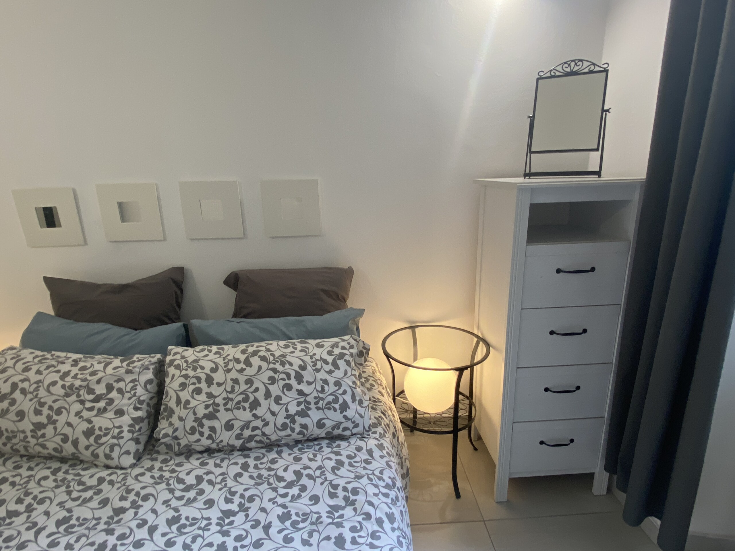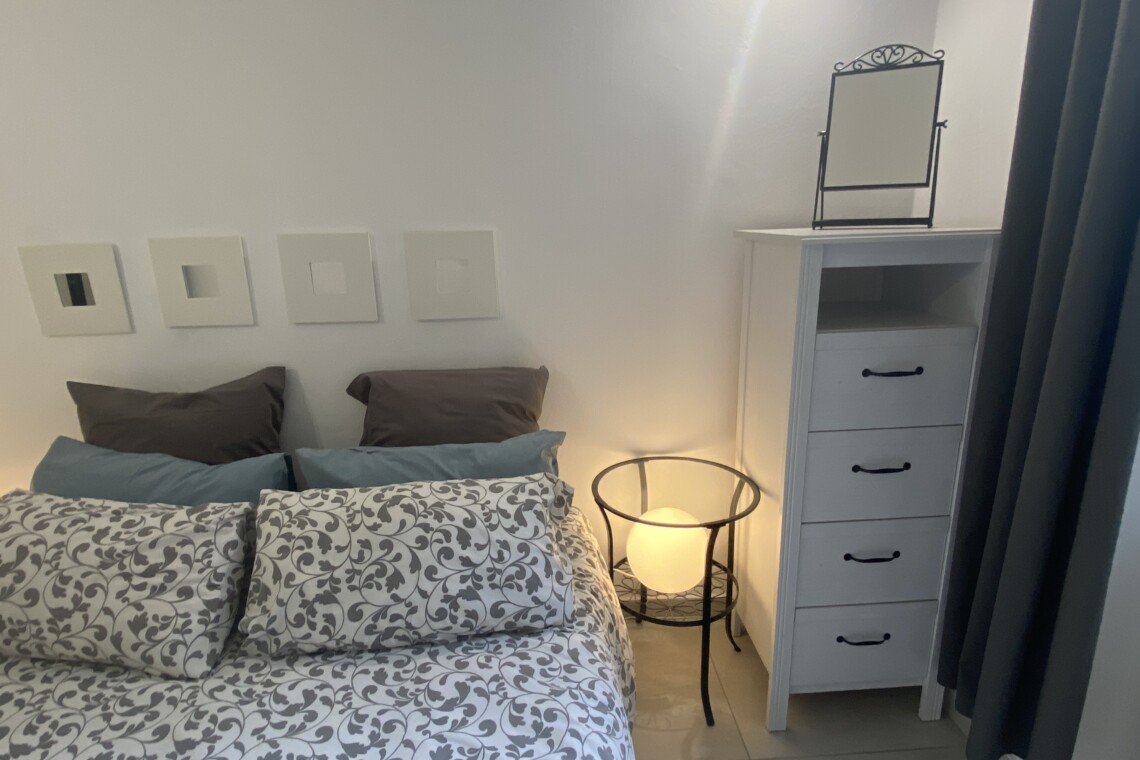 From the living room you enter the second bedroom, furnished with a double bed and a wardrobe.