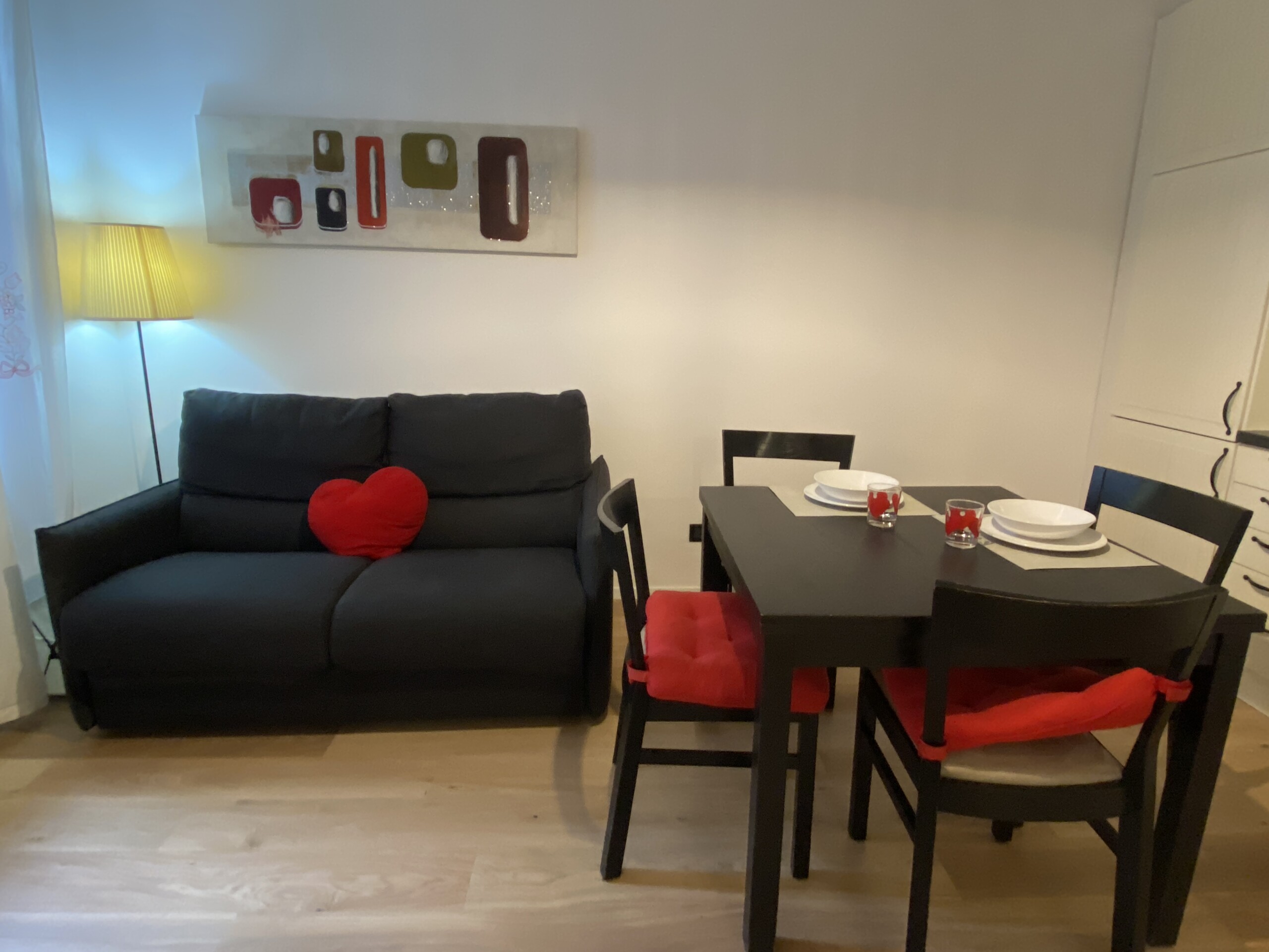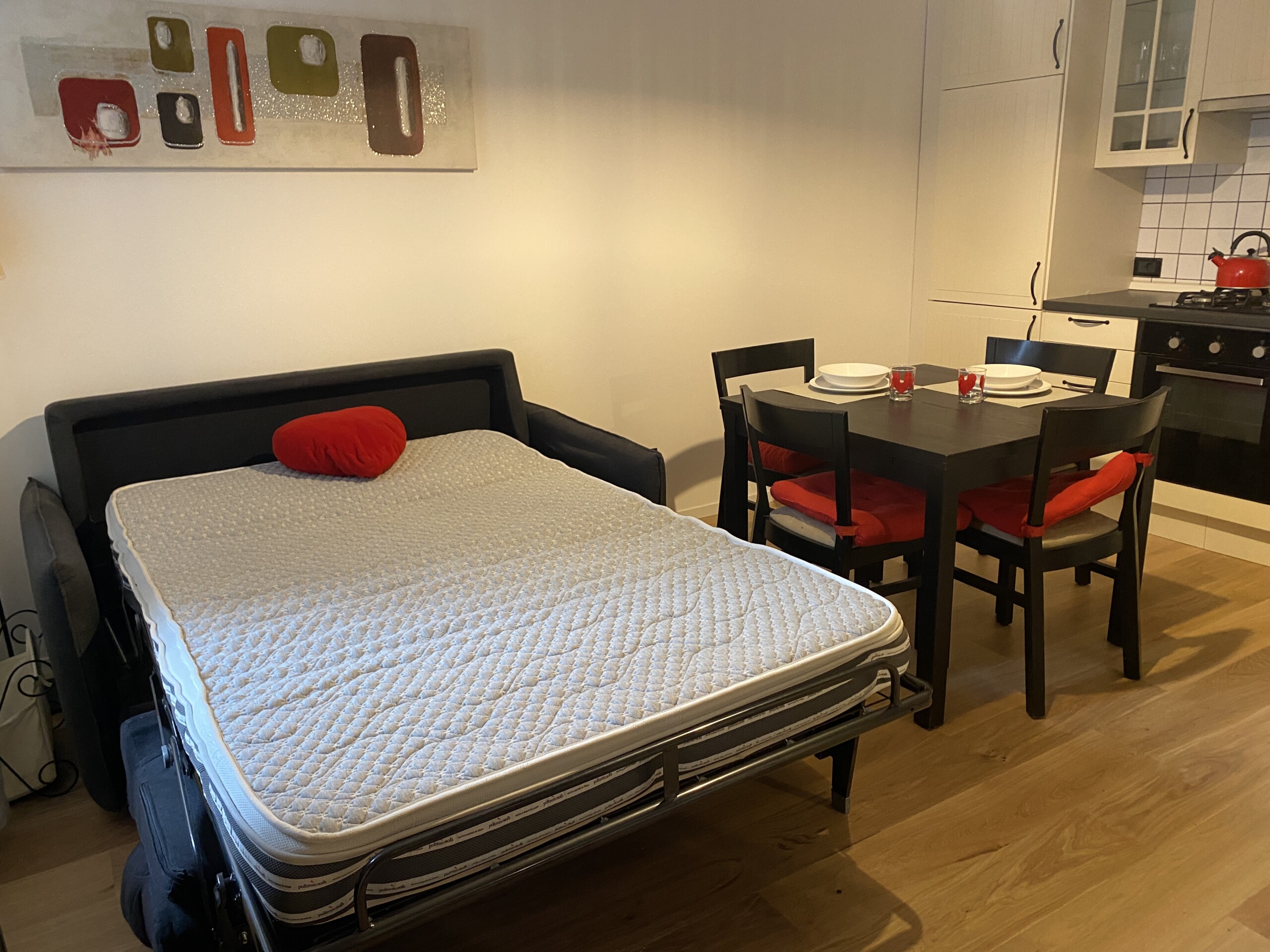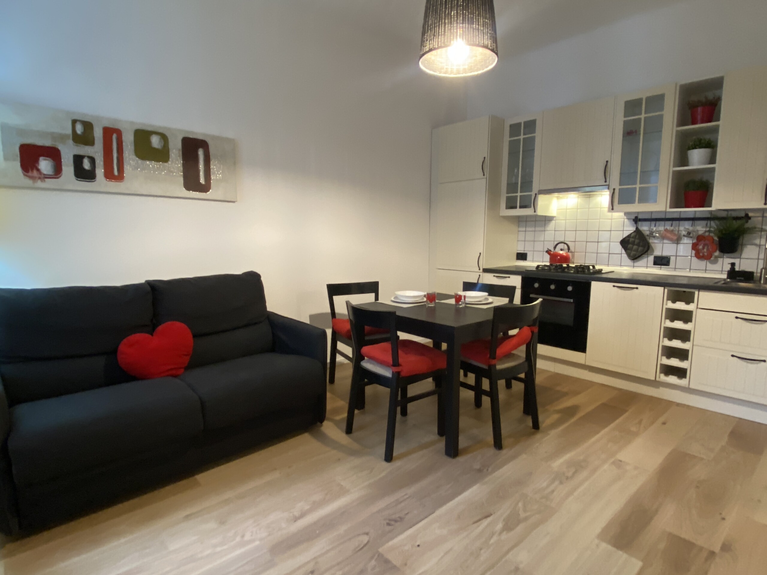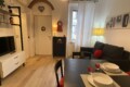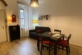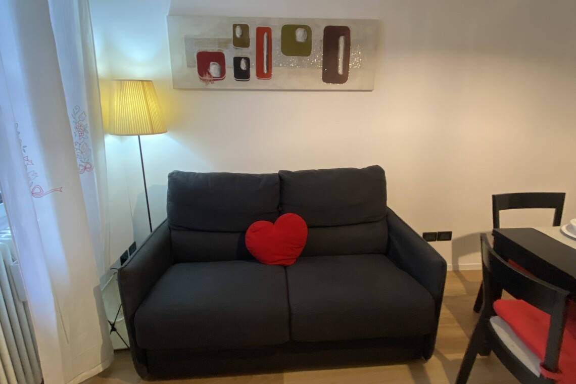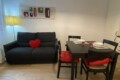 The apartment opens onto a welcoming living area with an open-plan kitchen, well exposed to natural light. The living room is furnished with a double sofa bed, TV, dining table, and chairs. The kitchen is fully equipped with an gas hob, dish washer, electric oven, microwave, fridge, and freezer.