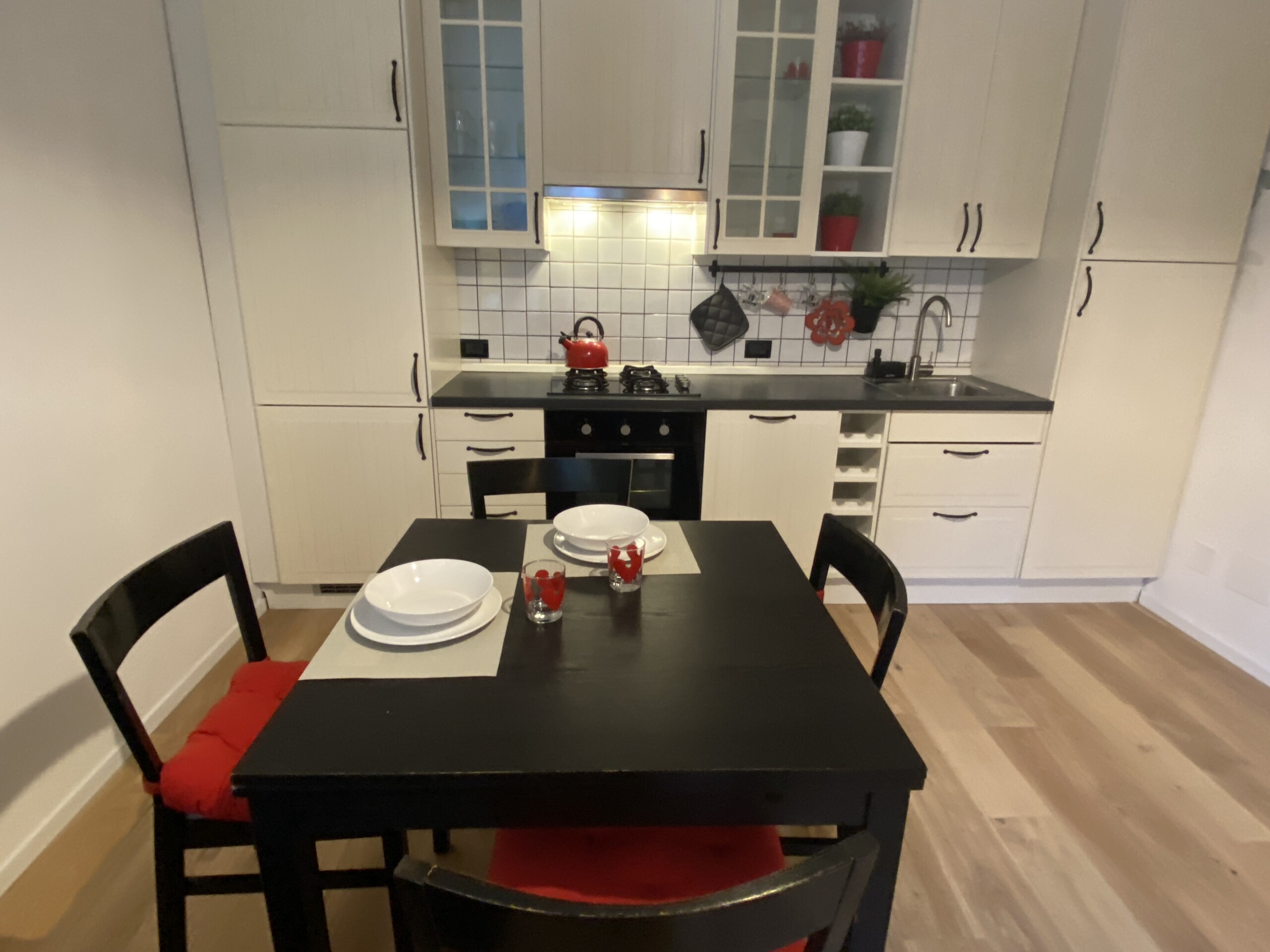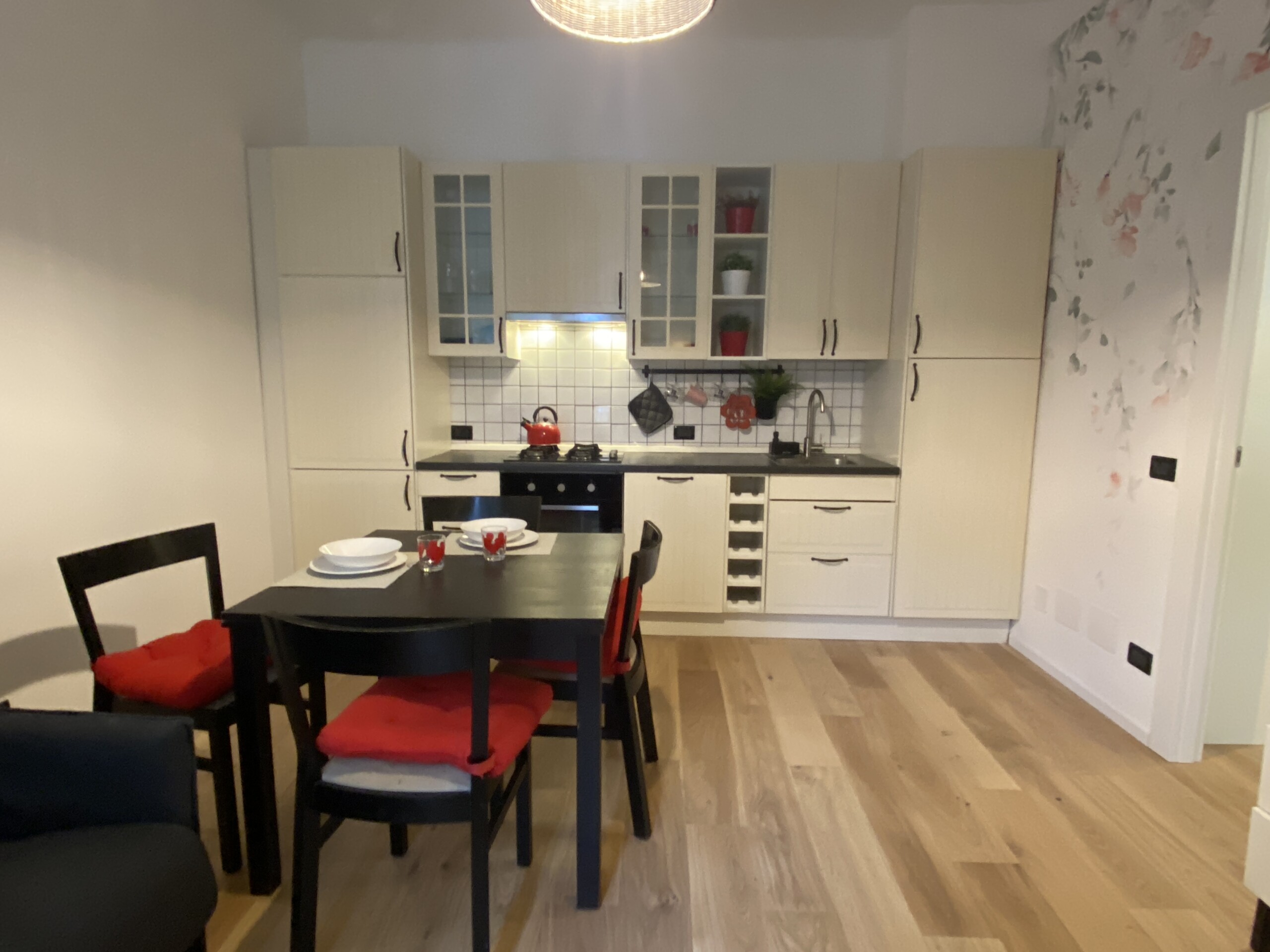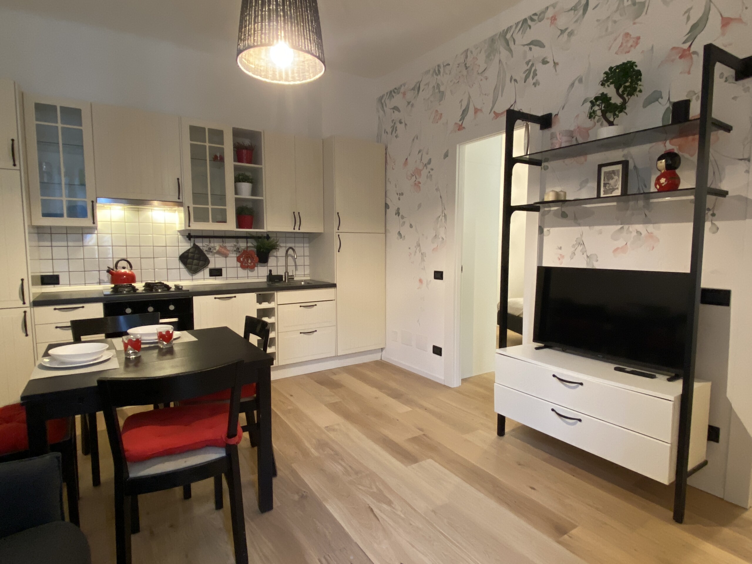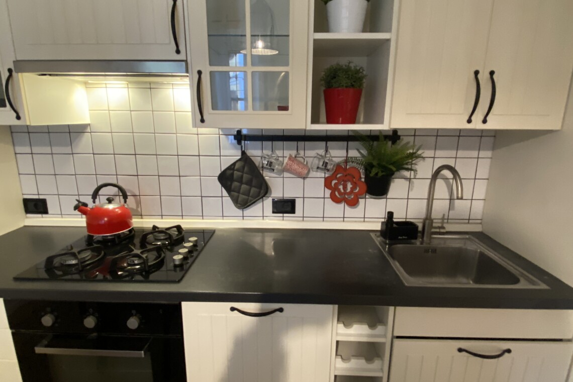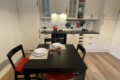 The apartment opens onto a welcoming living area with an open-plan kitchen, well exposed to natural light. The living room is furnished with a double sofa bed, TV, dining table, and chairs. The kitchen is fully equipped with an gas hob, dish washer, electric oven, microwave, fridge, and freezer.