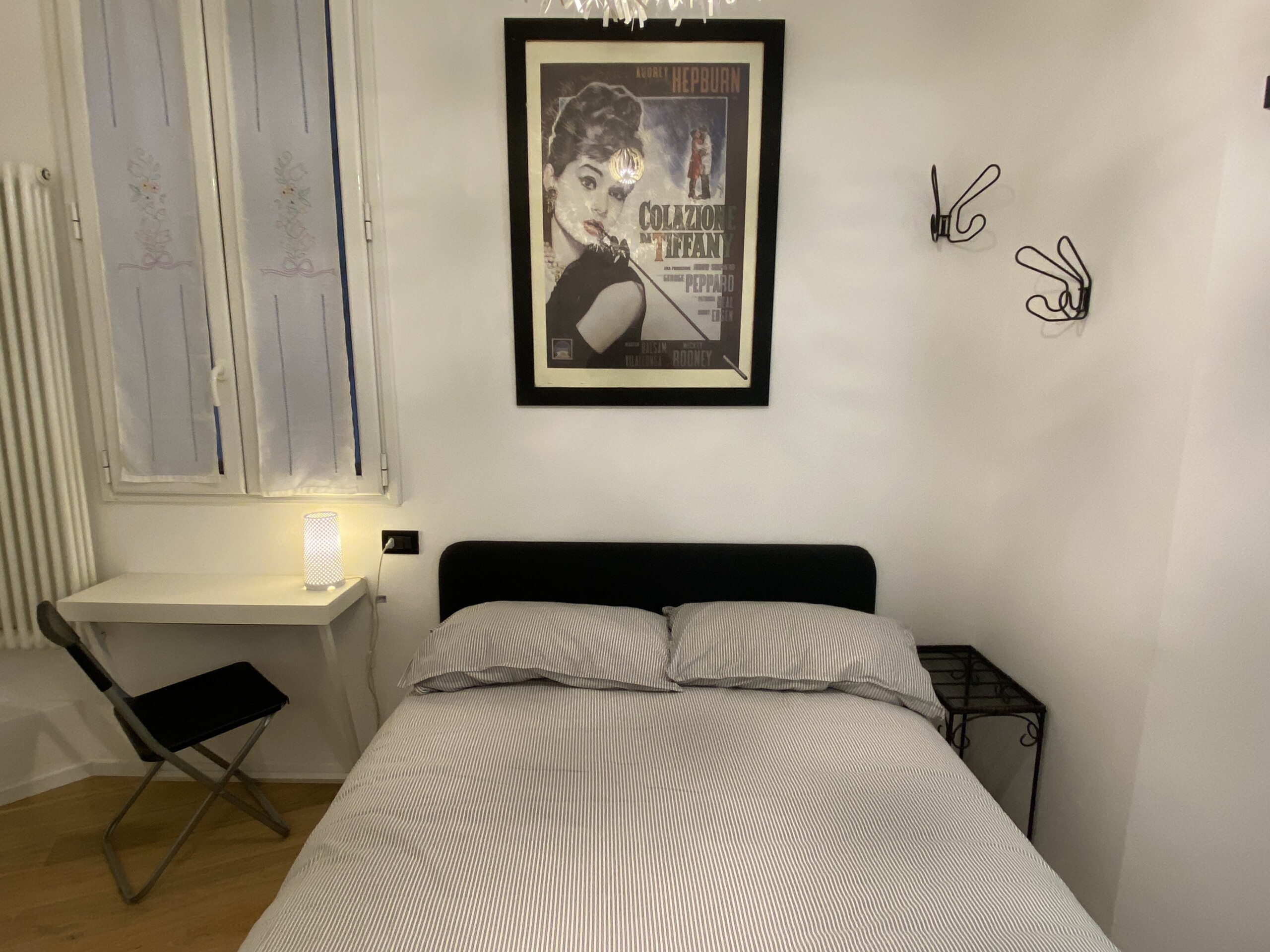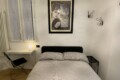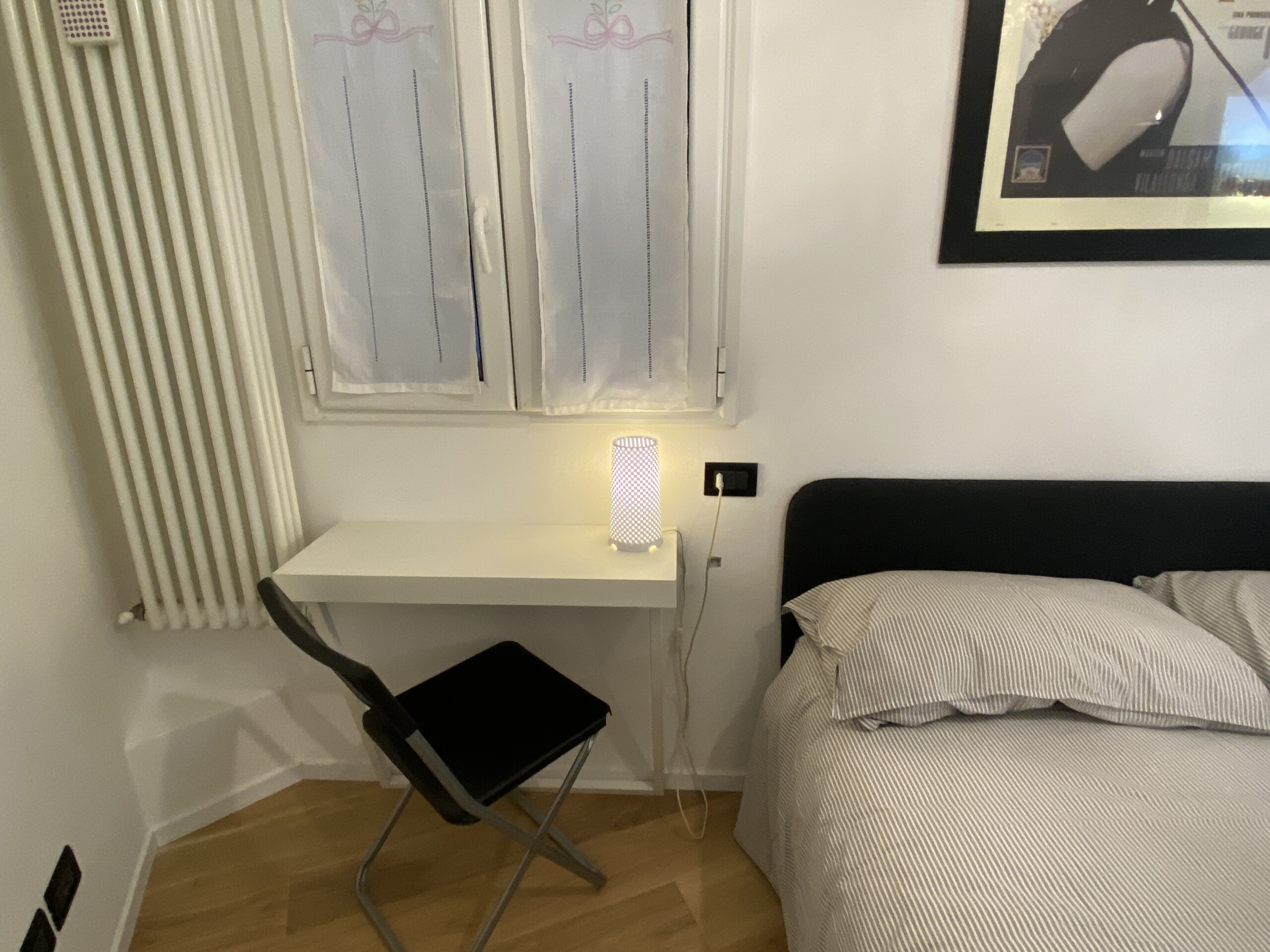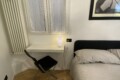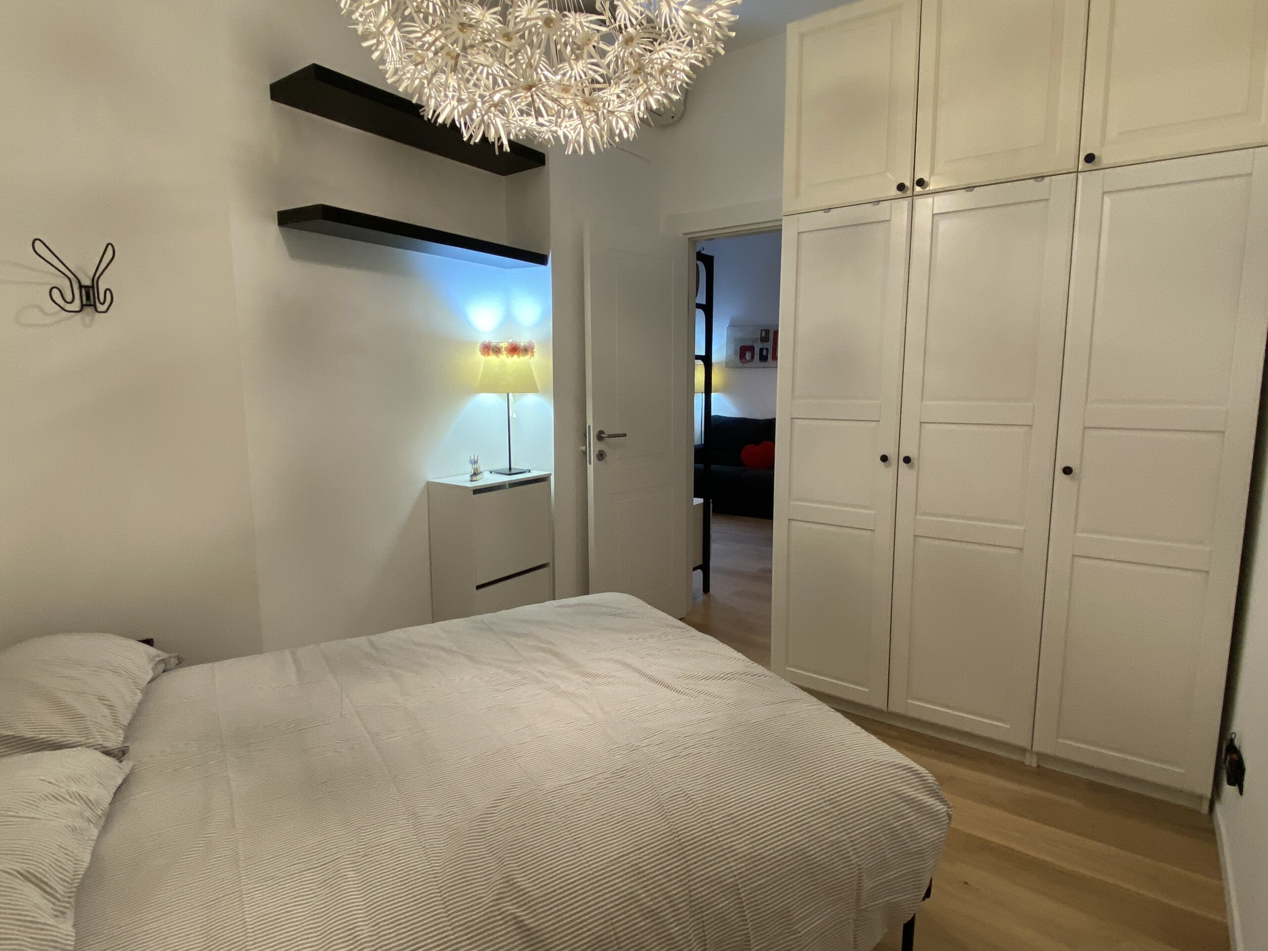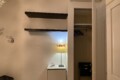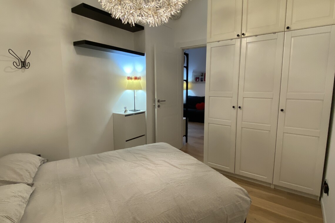 To the right of the living area are two doors: one leads to the bedroom, which is spacious and overlooks the building’s internal courtyard, ensuring maximum quiet. The bedroom features a double bed, a wardrobe, an additional built-in closet, a desk, shelving, and a small bookcase.