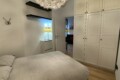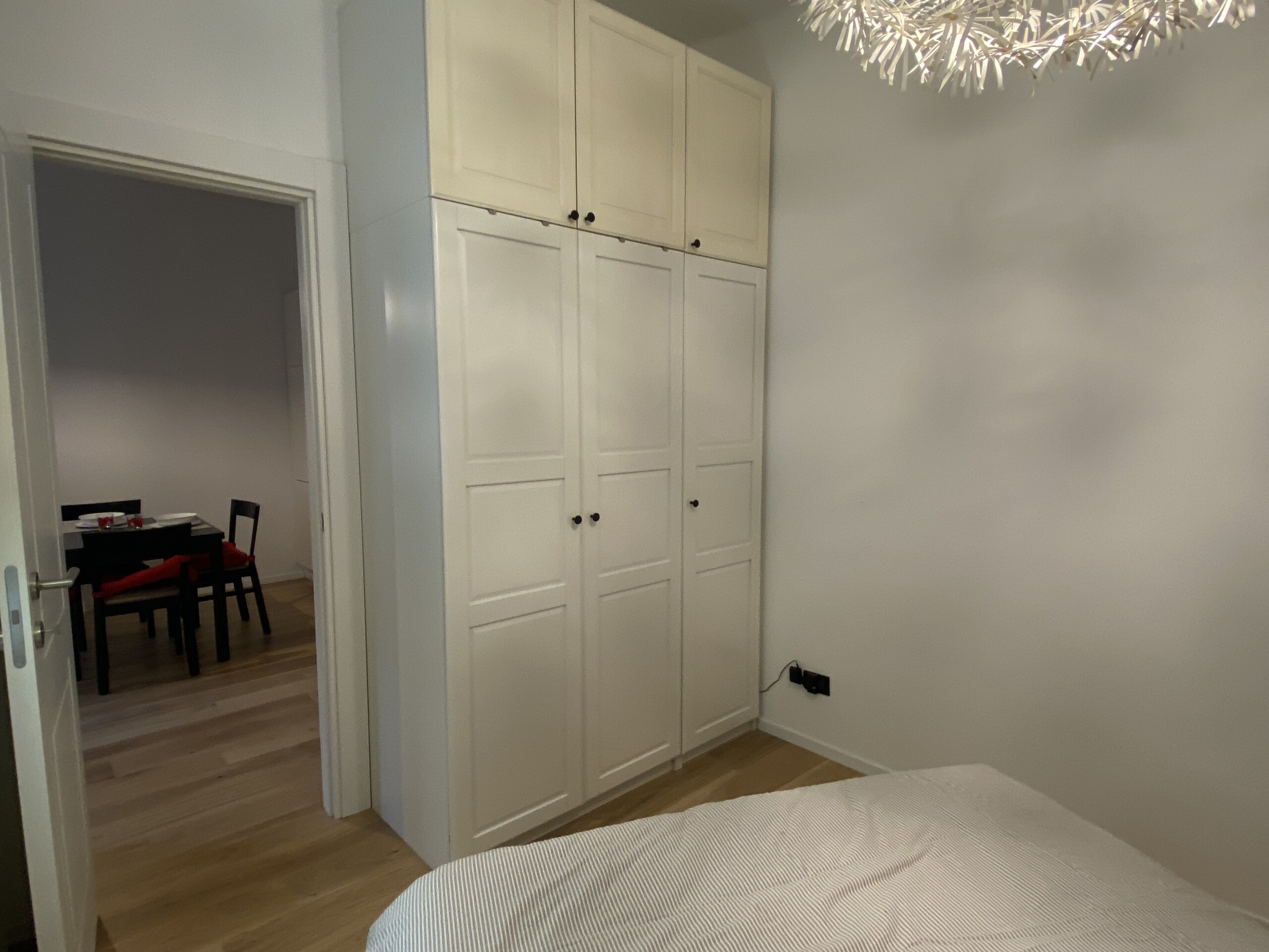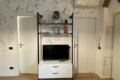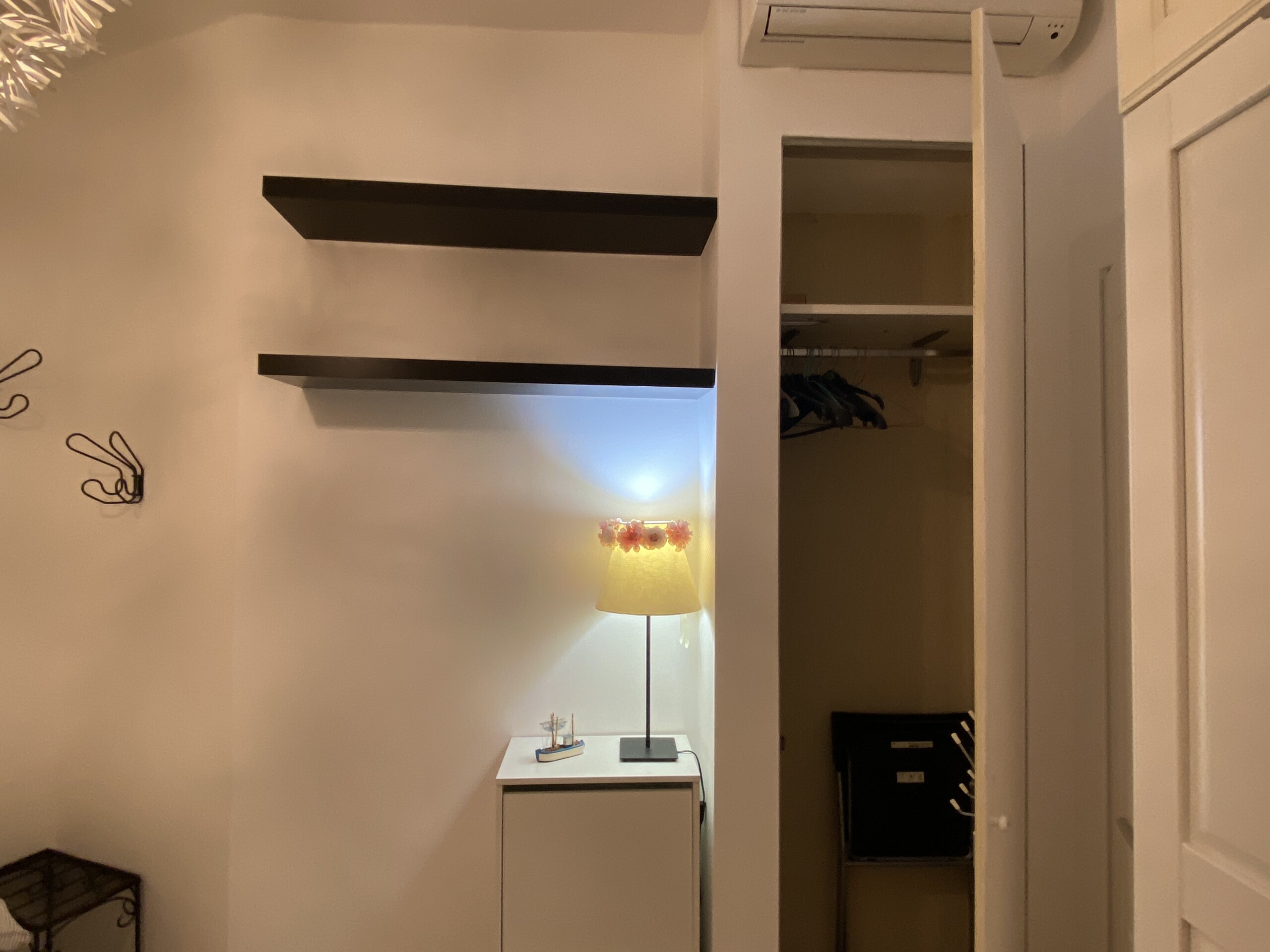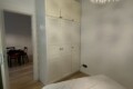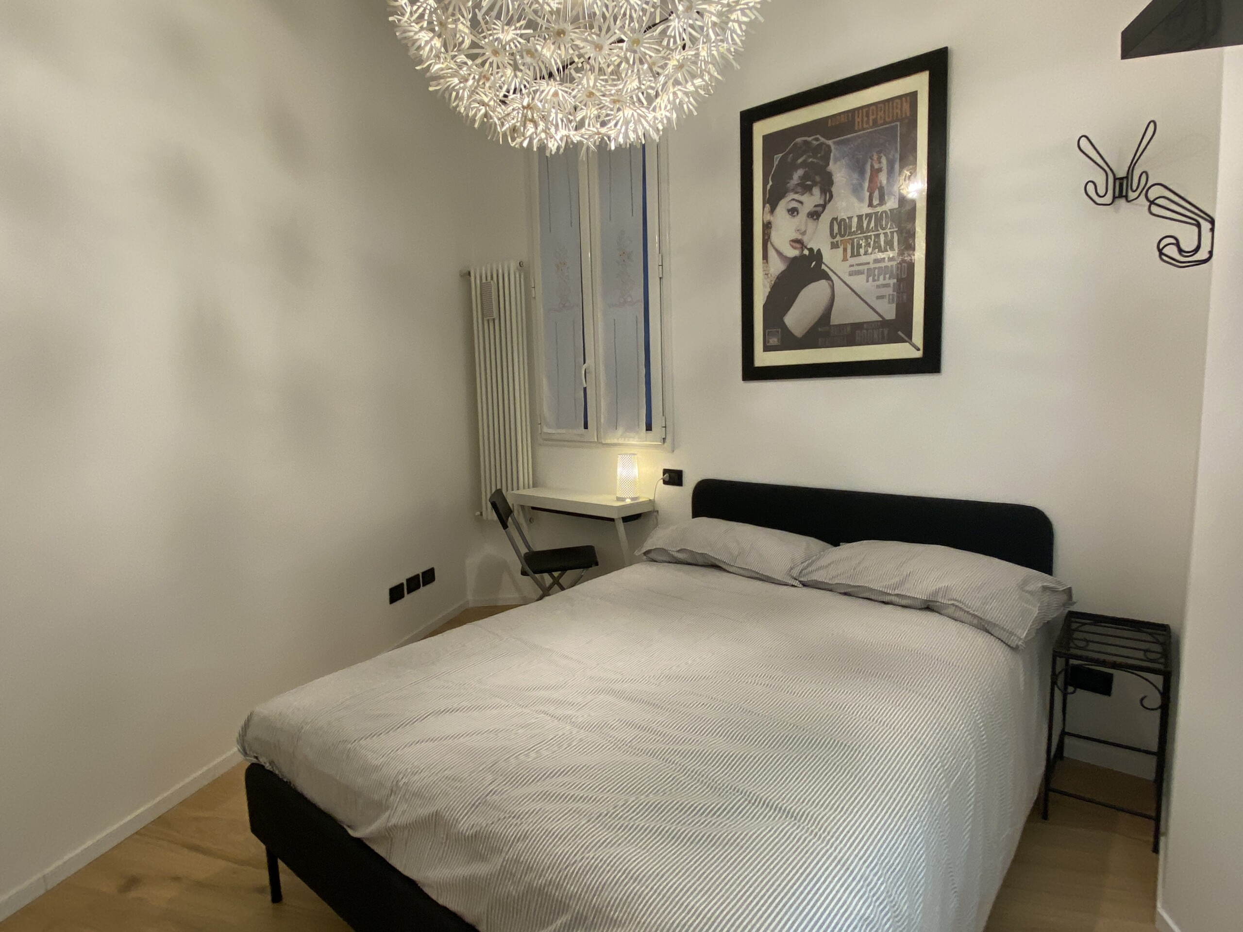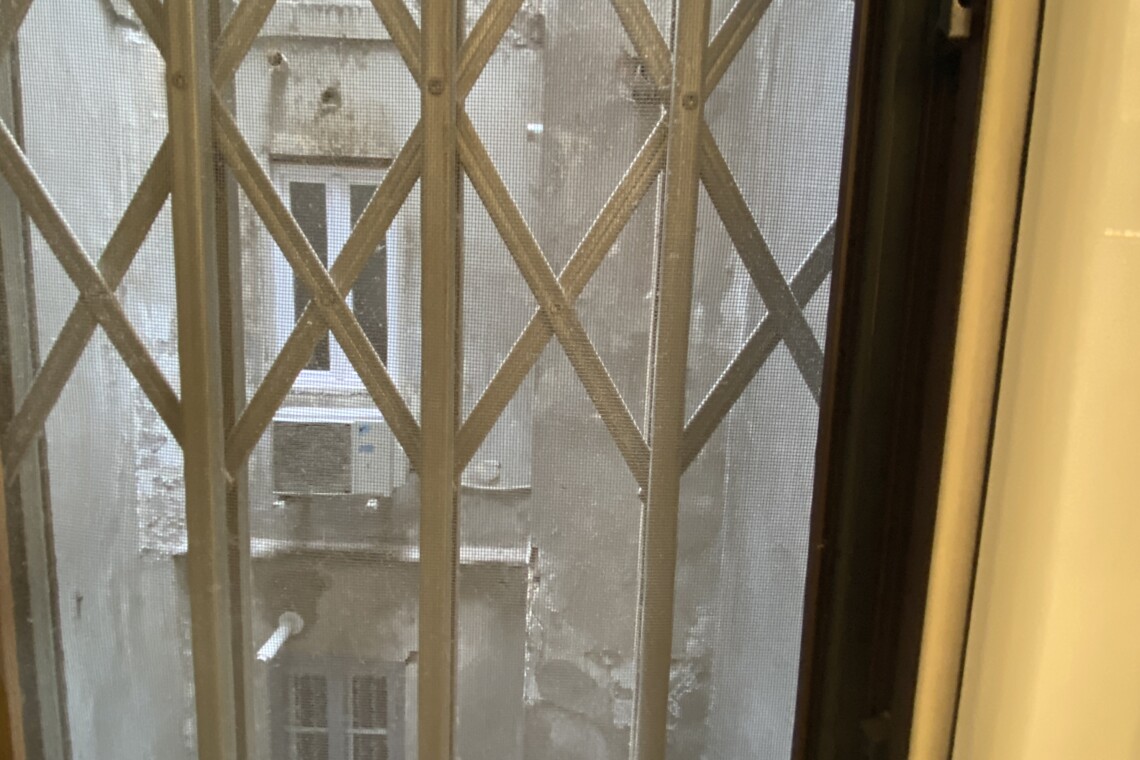 To the right of the living area are two doors: one leads to the bedroom, which is spacious and overlooks the building’s internal courtyard, ensuring maximum quiet. The bedroom features a double bed, a wardrobe, an additional built-in closet, a desk, shelving, and a small bookcase.