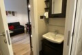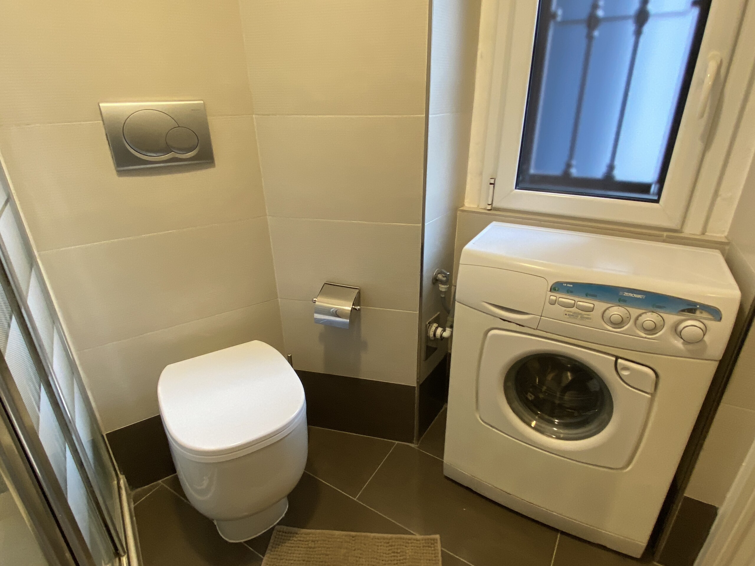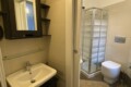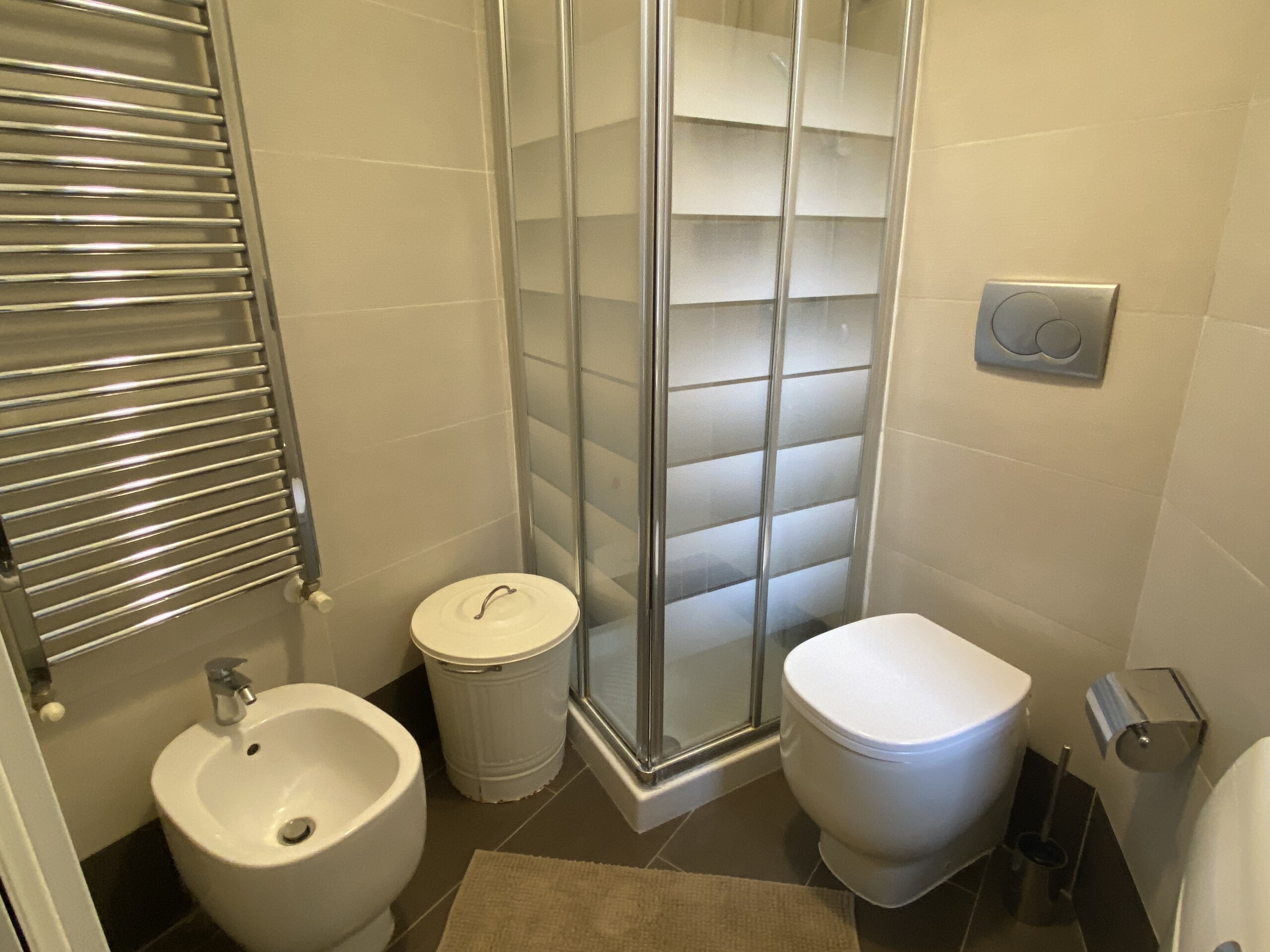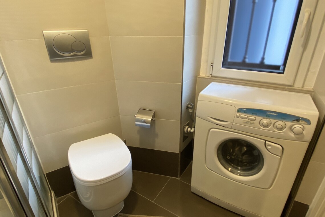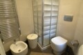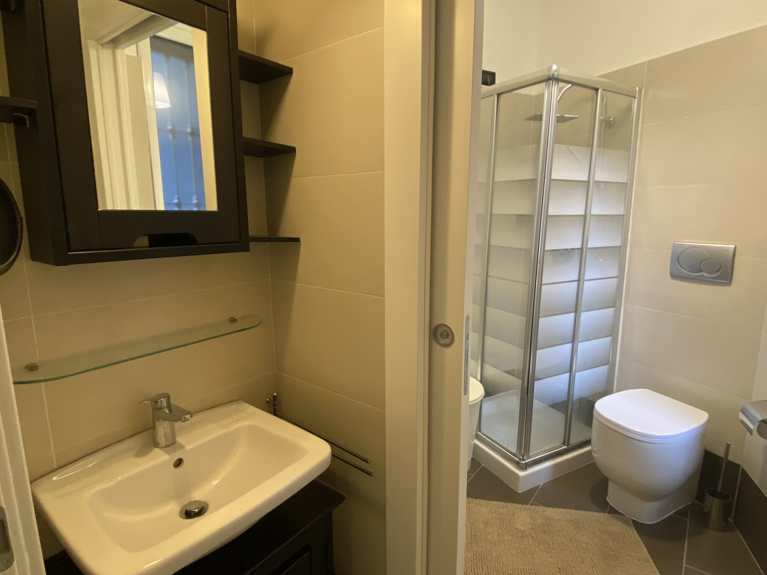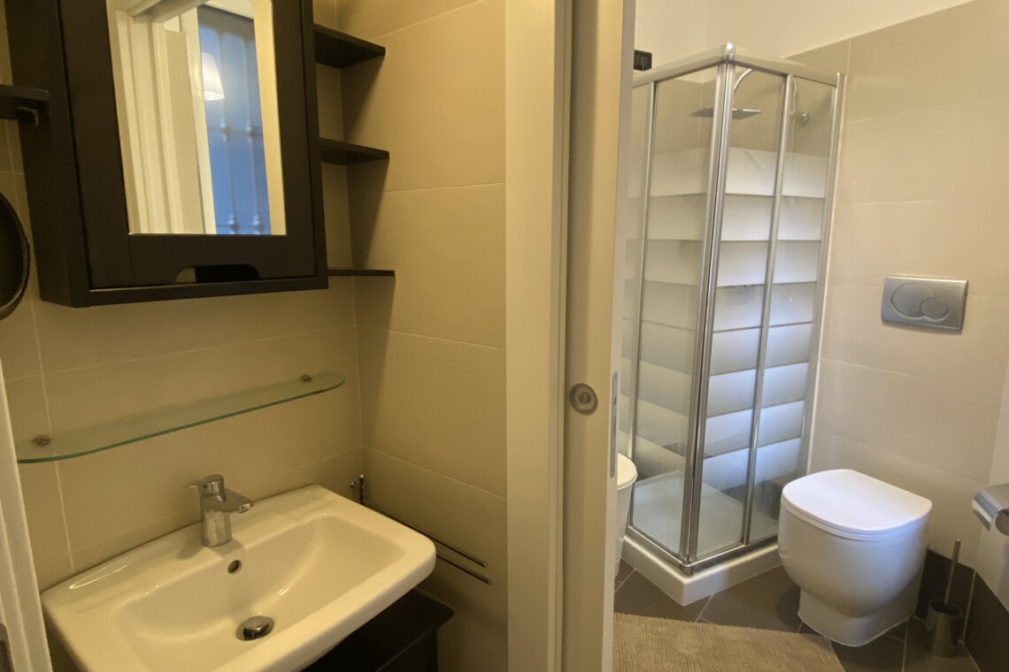 The modern bathroom is windowed and well designed, with a practical separation between the sink area and the shower and sanitary area. It is equipped with a shower, WC, and bidet.