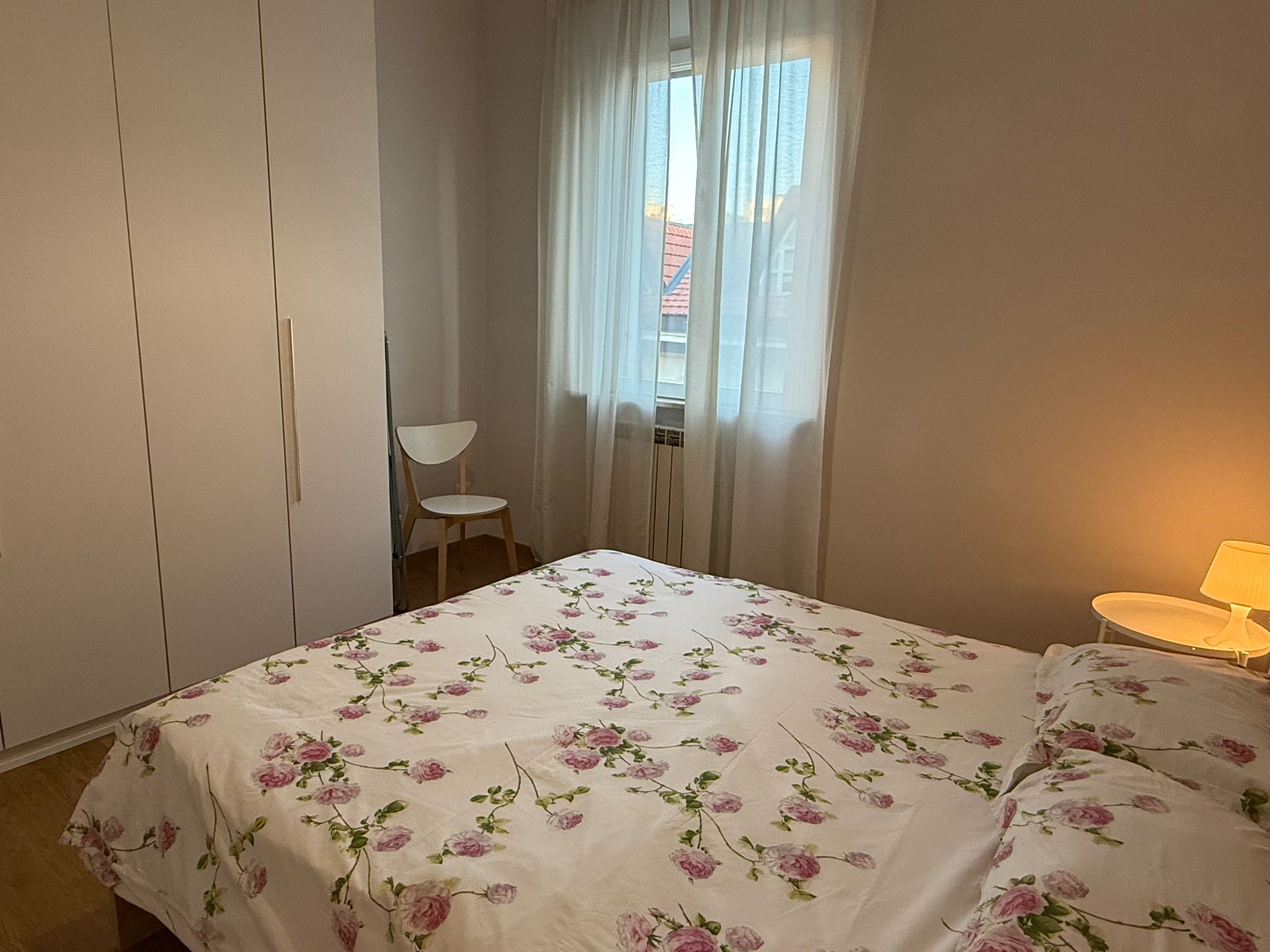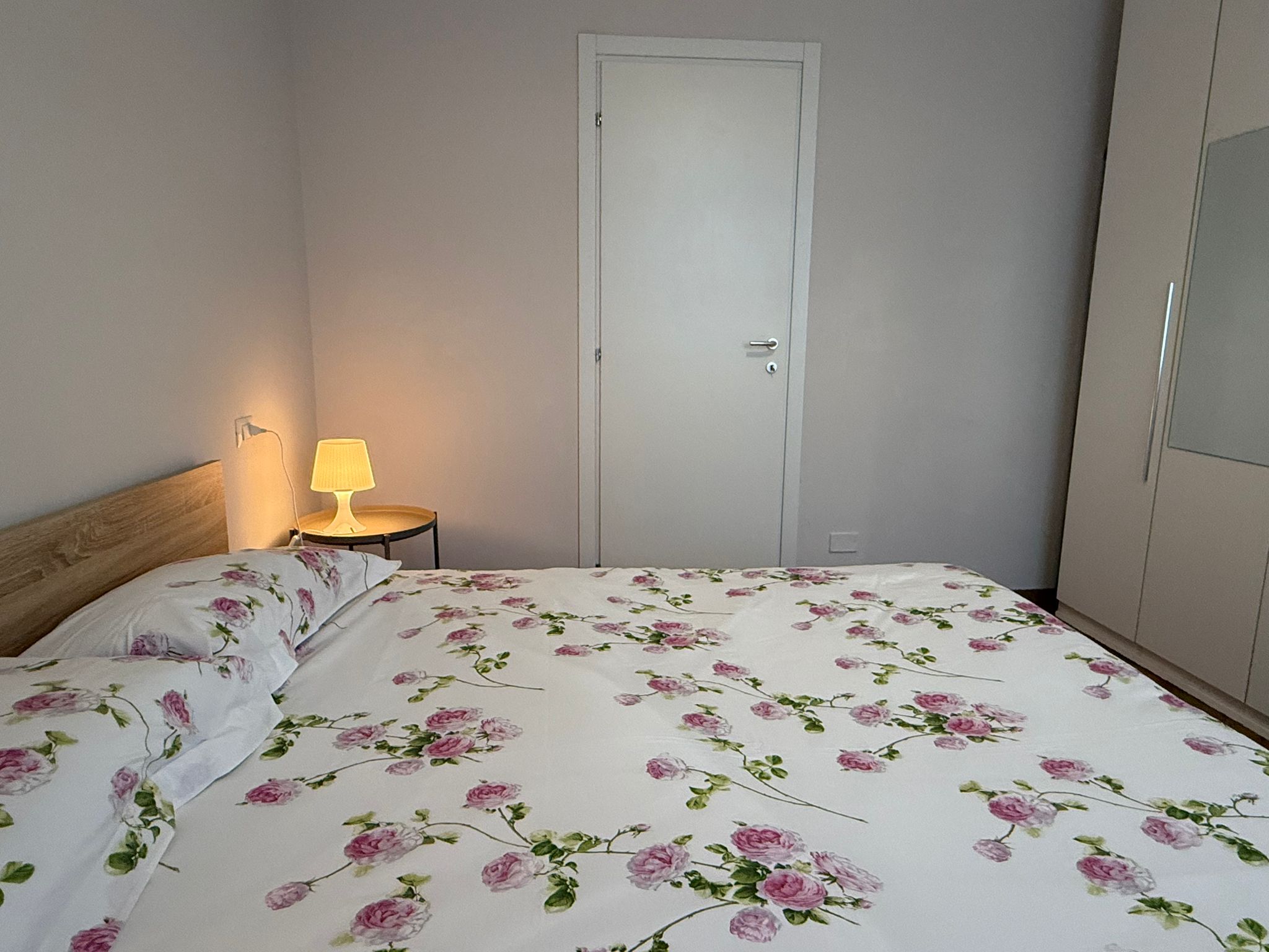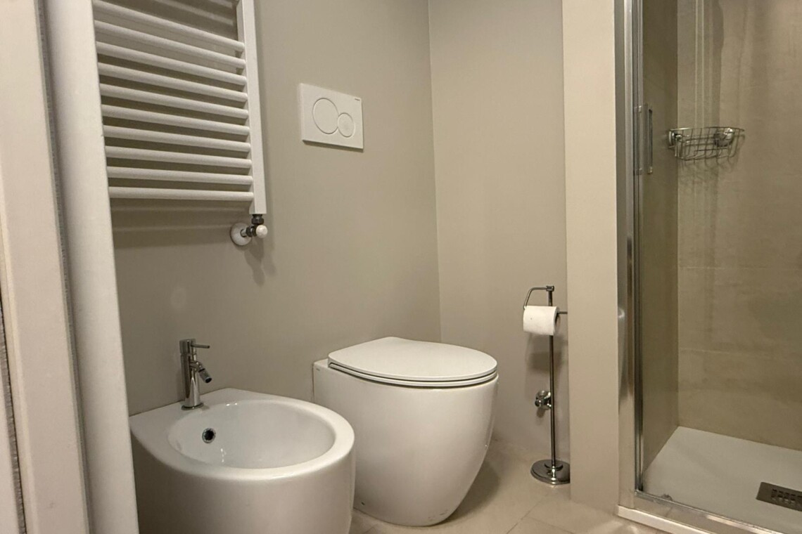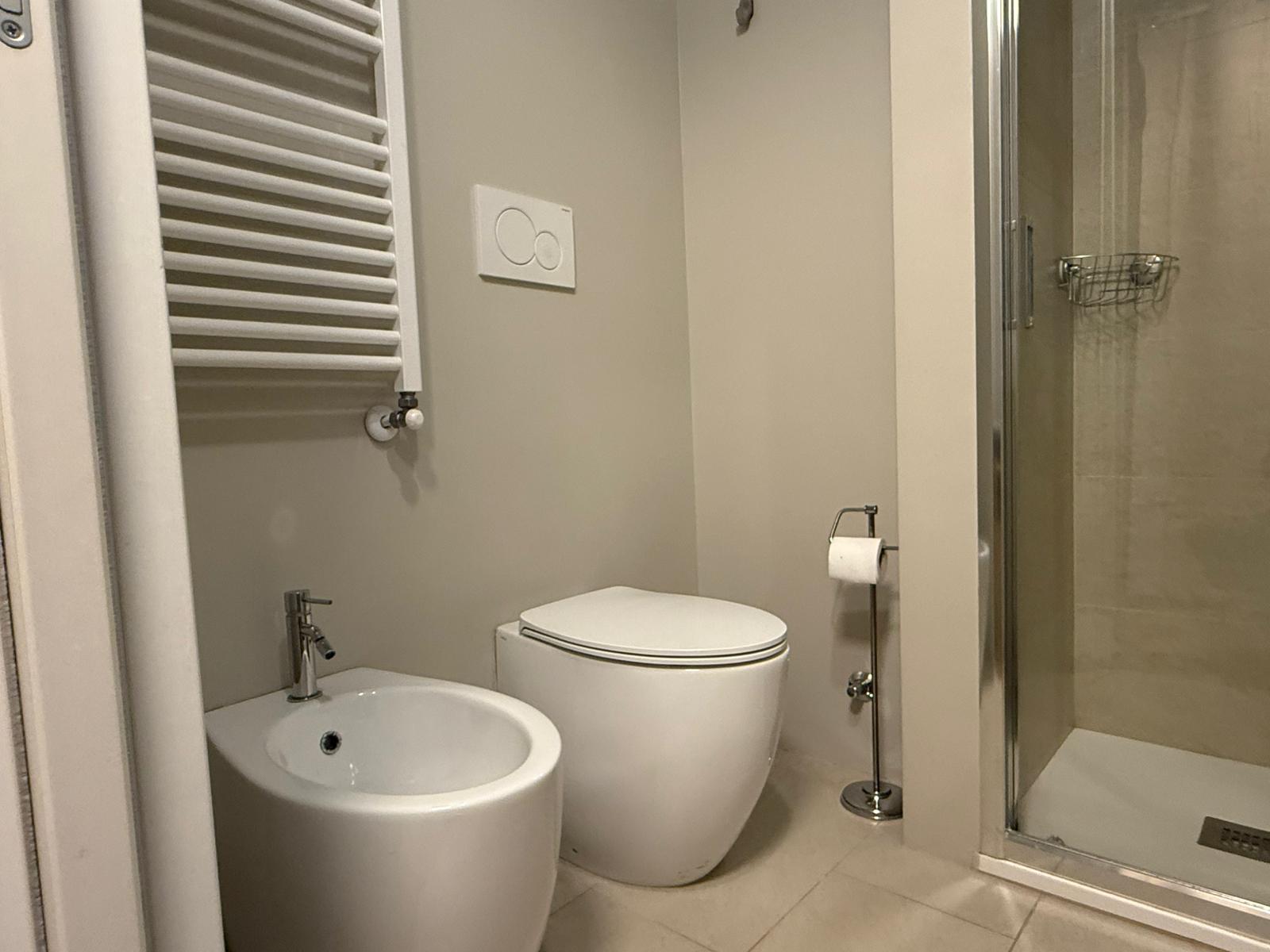 The bedroom offers a double bed and a spacious wardrobe, while the modern bathroom includes a shower and bidet.