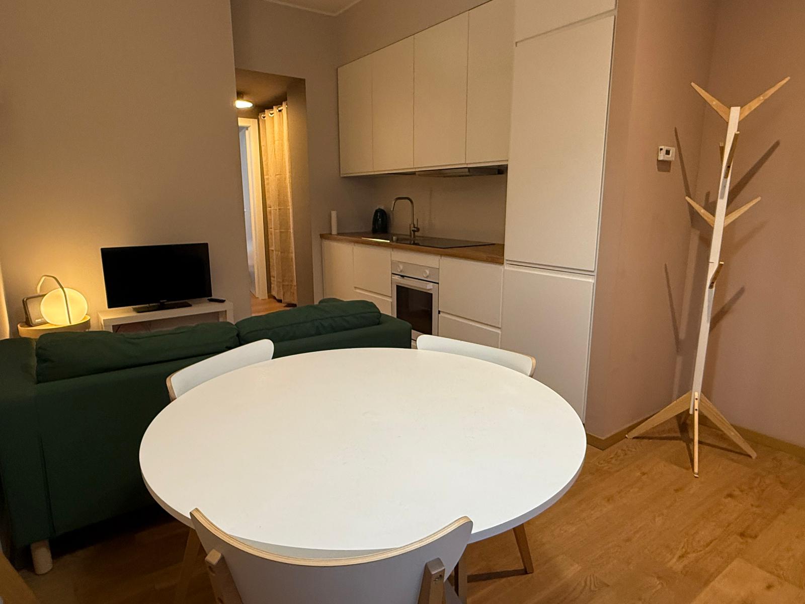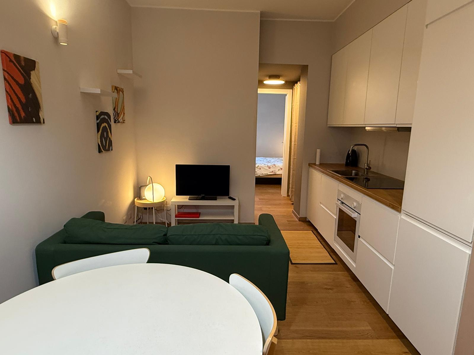 The living area features an open-plan kitchen, a comfortable sofa, a TV, a dining table, and chairs. The kitchen is fully equipped with an electric oven, induction hob, dish washer, fridge, and freezer.