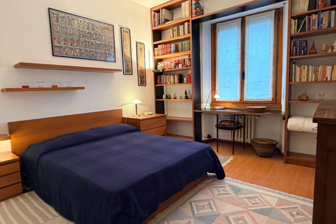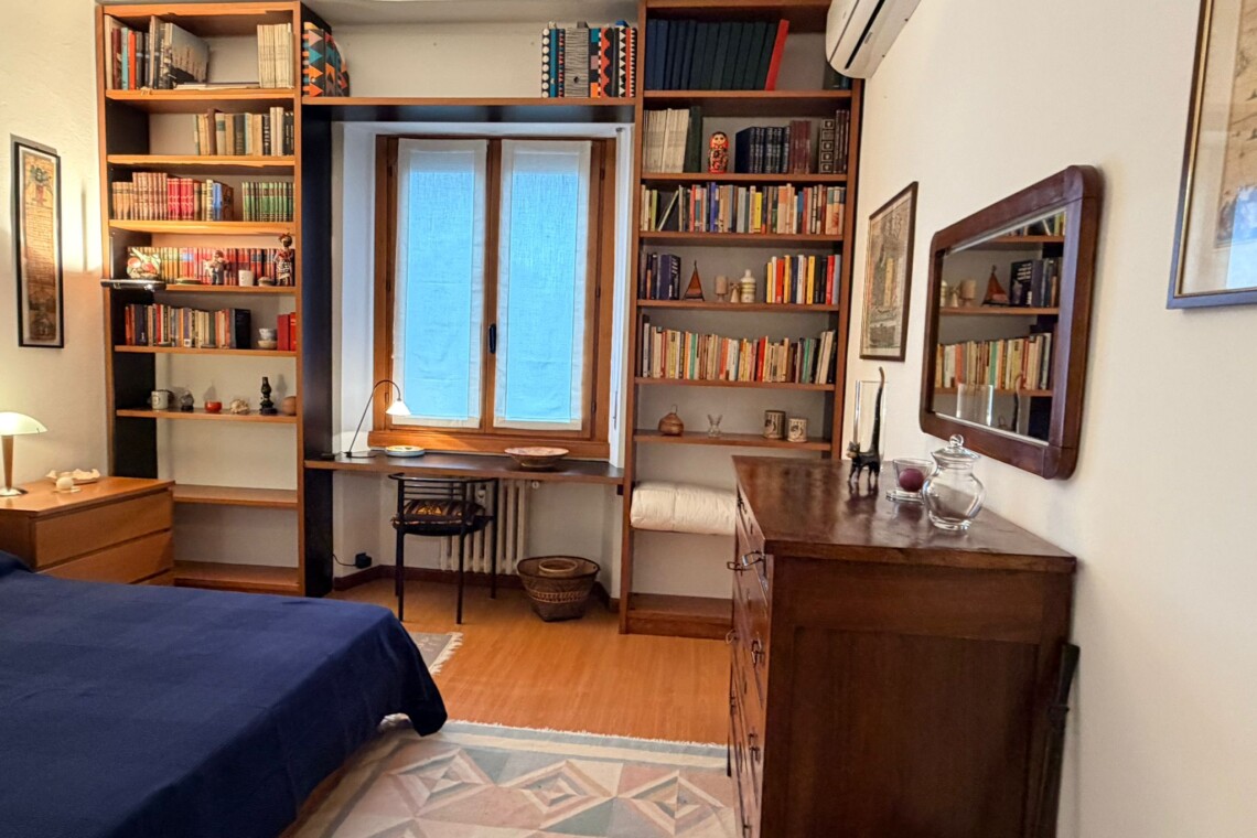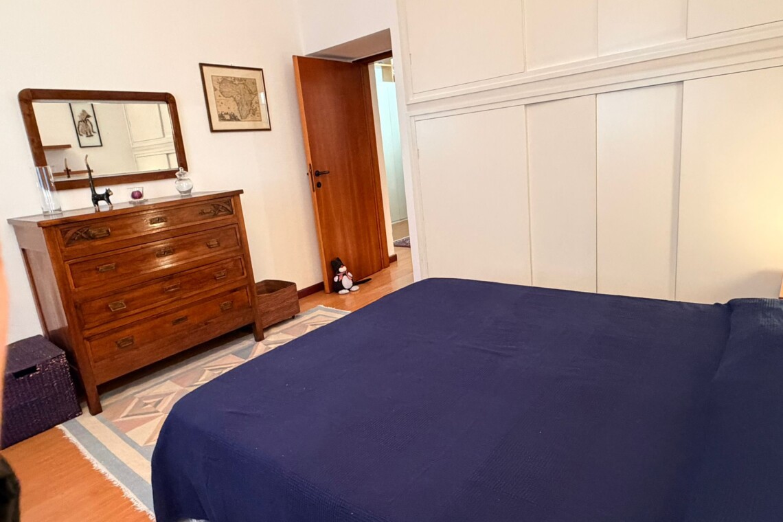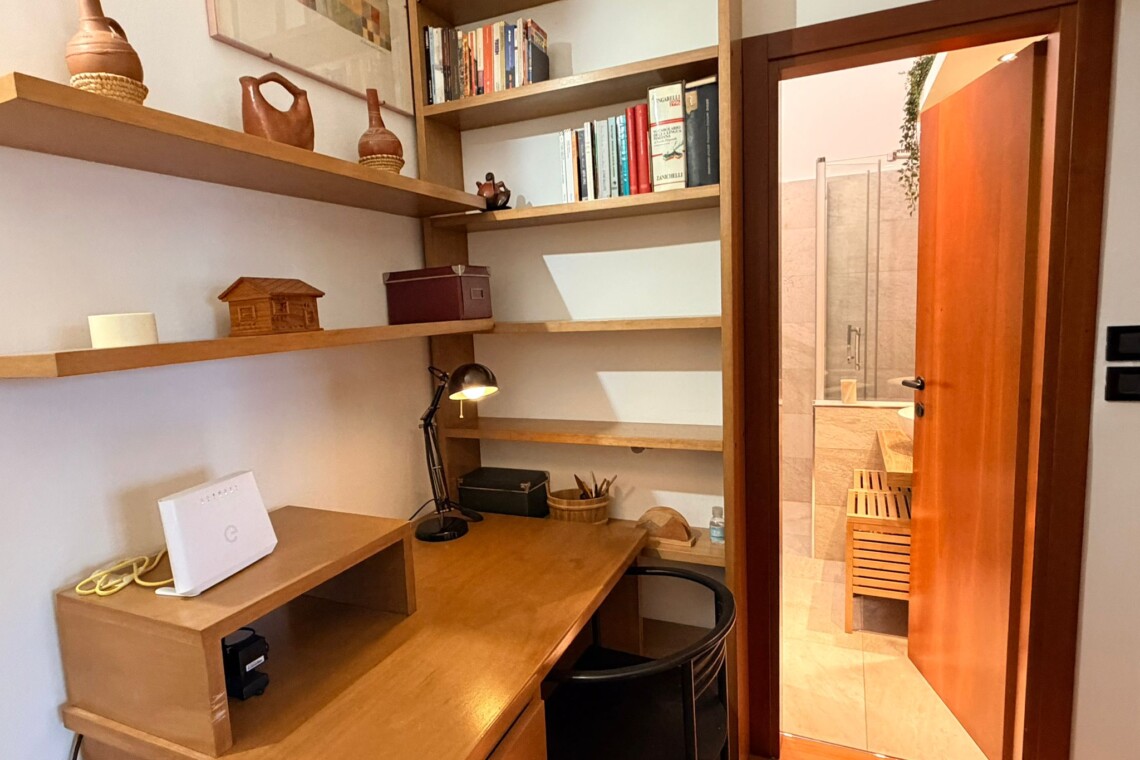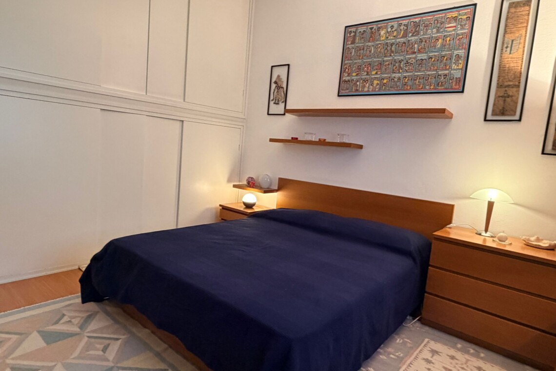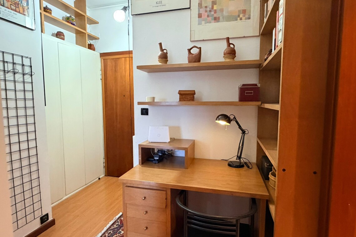 From the study area, the second door leads to the bedroom, which is bright and very spacious, furnished with a comfortable double bed and a large wardrobe. The apartment also includes a windowed bathroom with a shower, washing machine, and bidet.