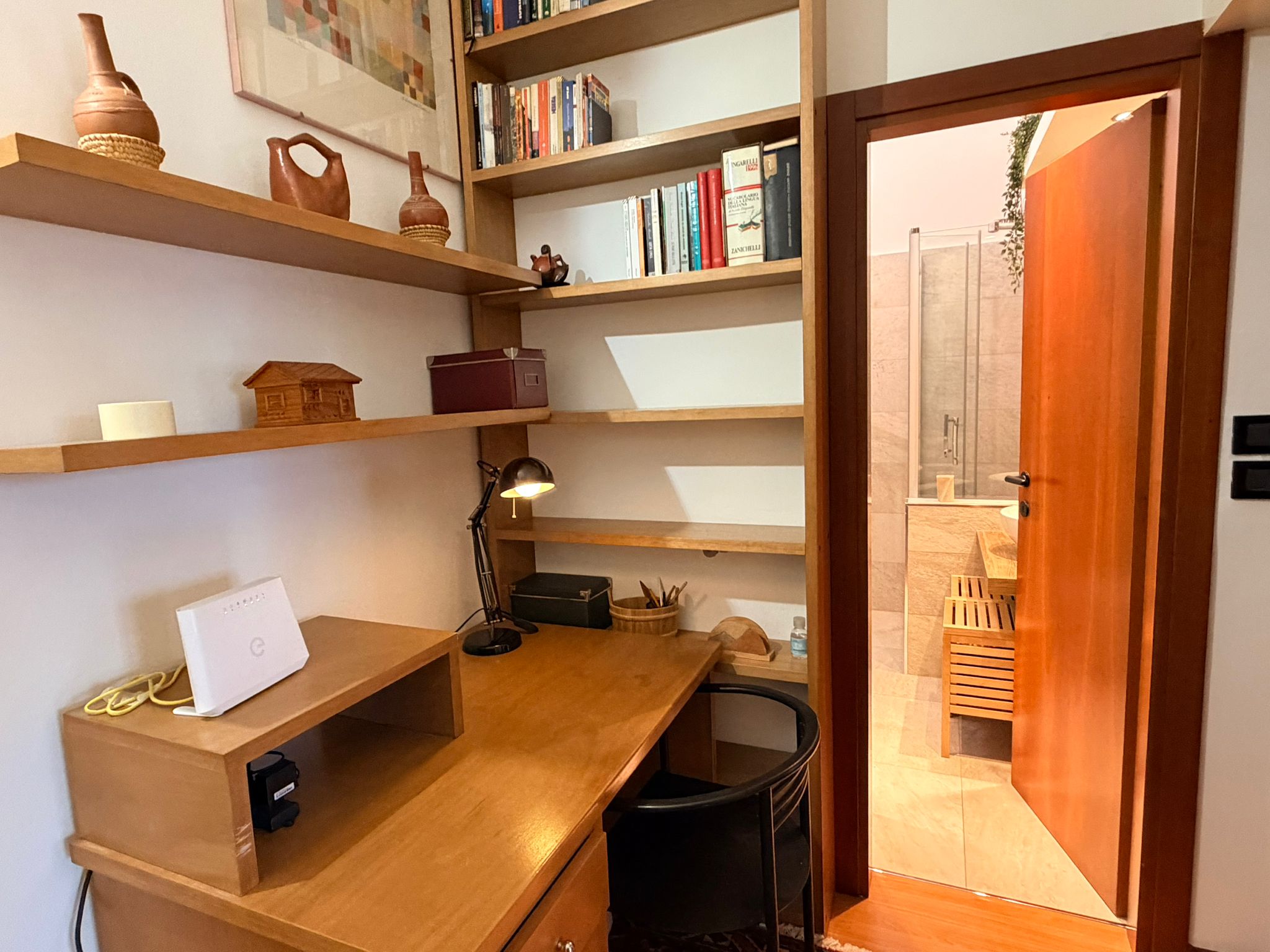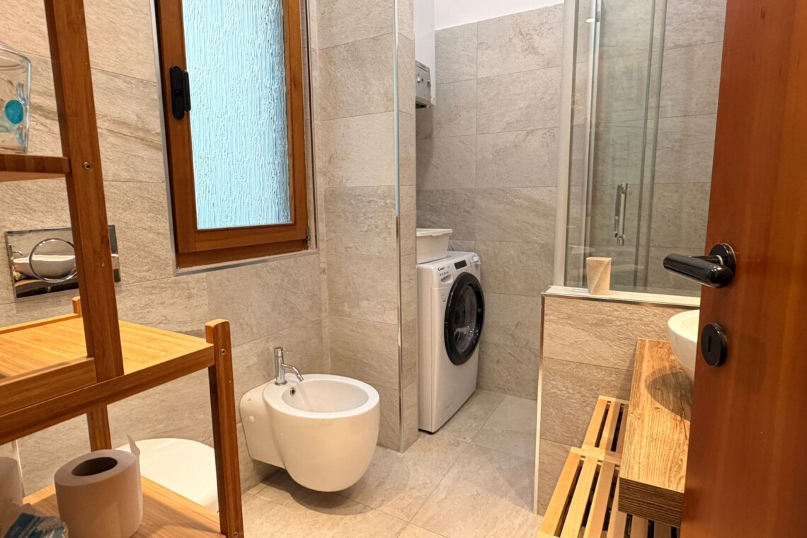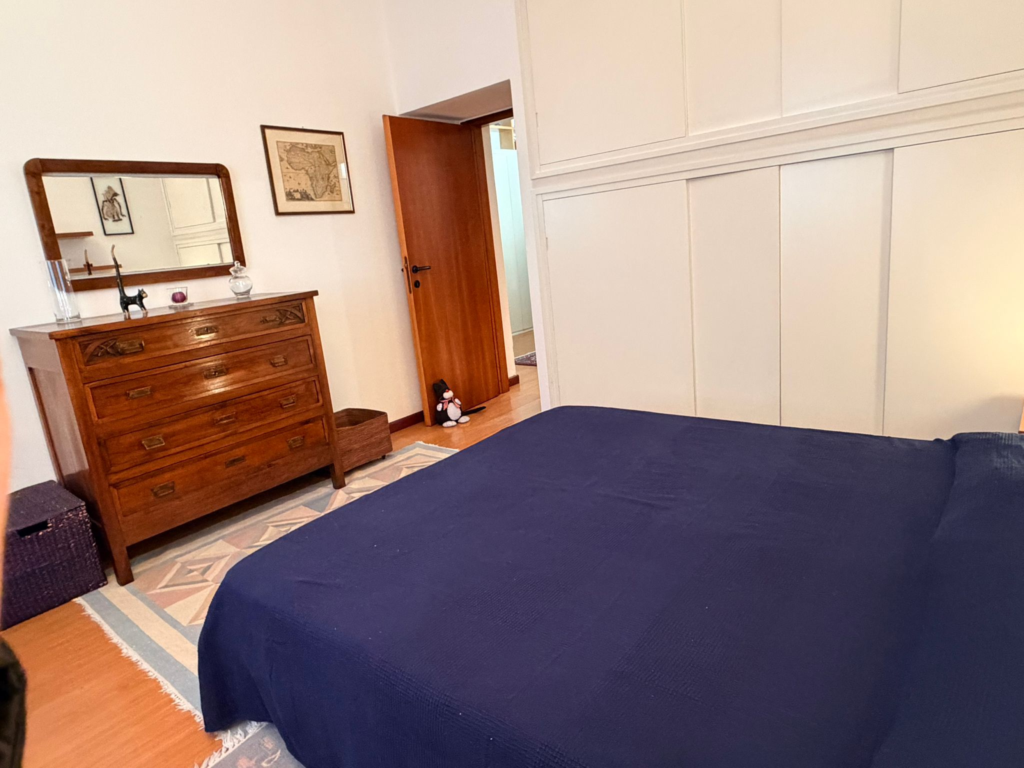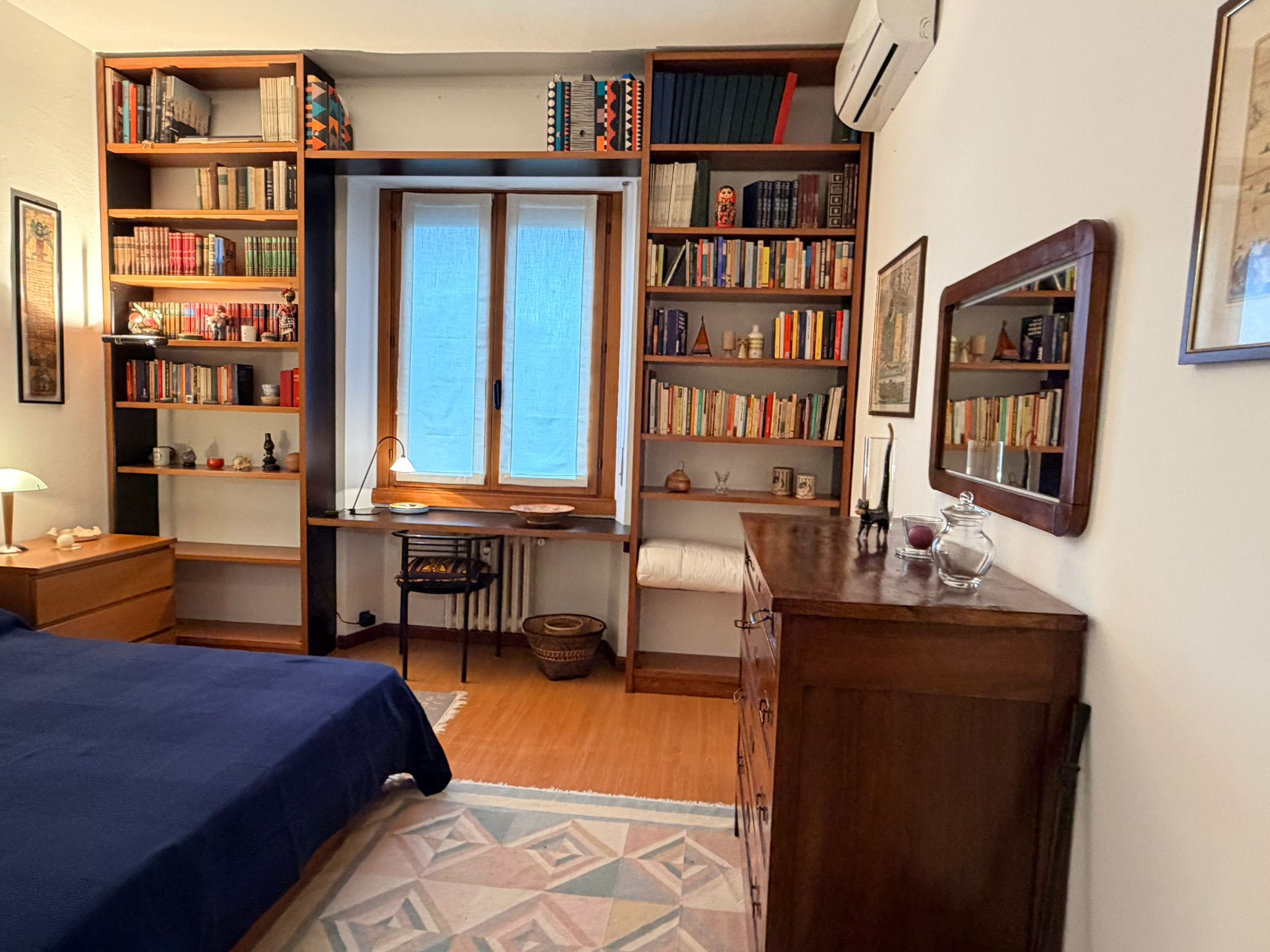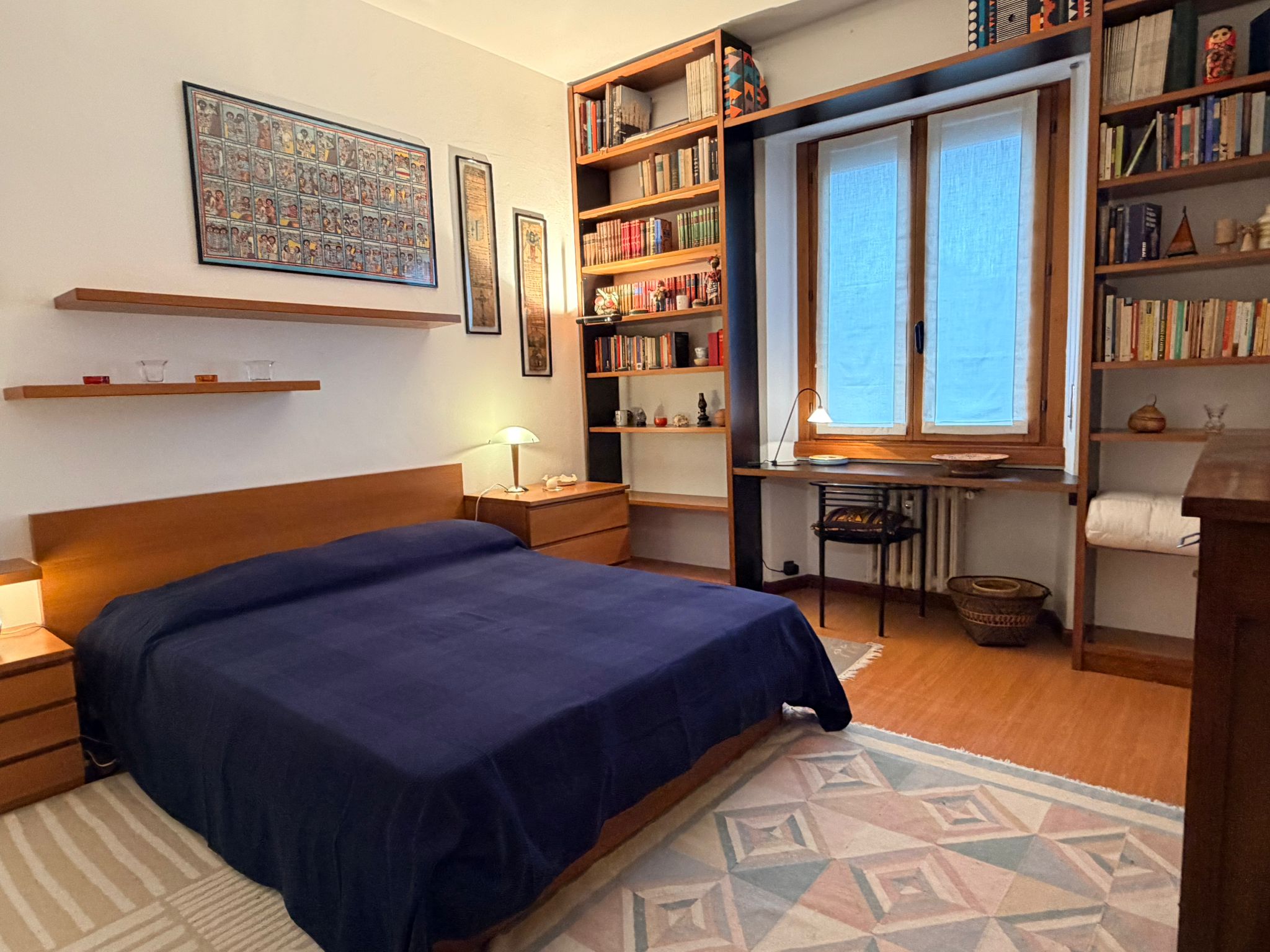 From the study area, the second door leads to the bedroom, which is bright and very spacious, furnished with a comfortable double bed and a large wardrobe. The apartment also includes a windowed bathroom with a shower, washing machine, and bidet.