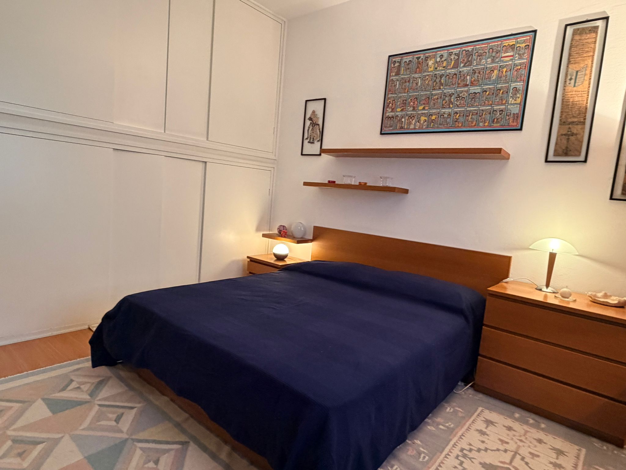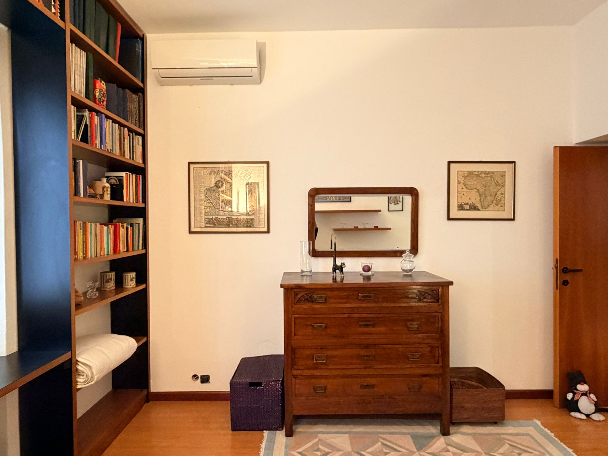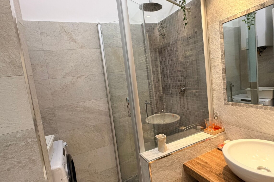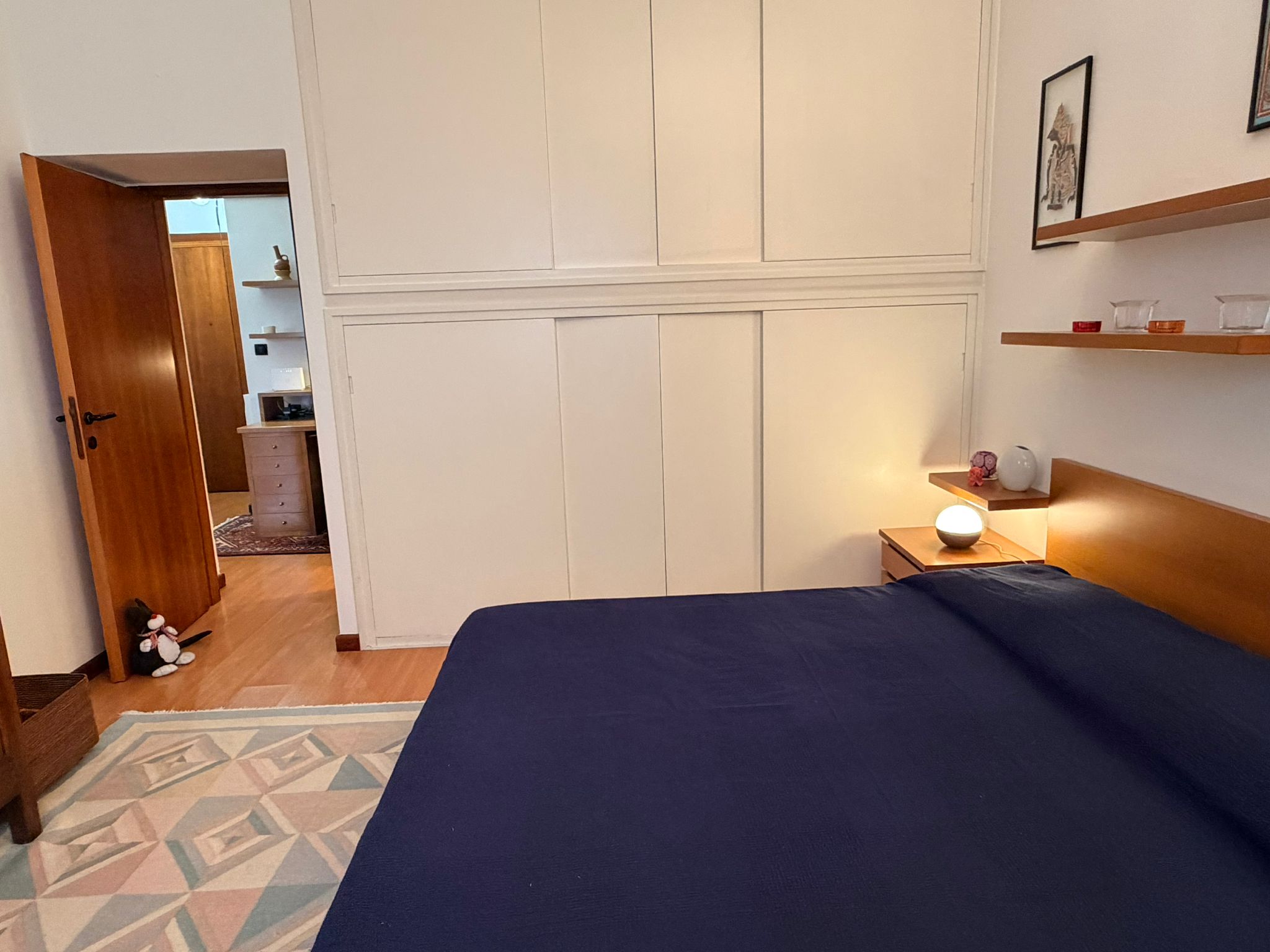 From the study area, the second door leads to the bedroom, which is bright and very spacious, furnished with a comfortable double bed and a large wardrobe. The apartment also includes a windowed bathroom with a shower, washing machine, and bidet.