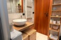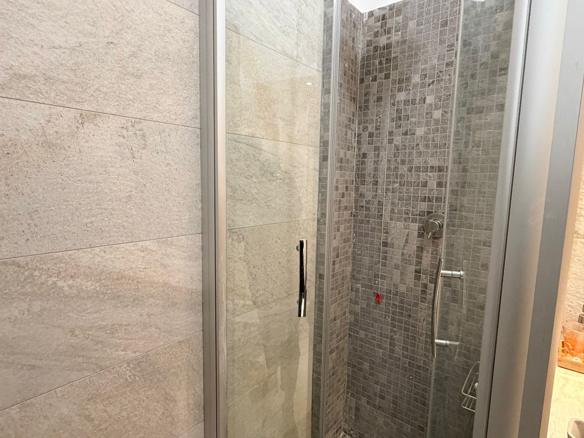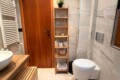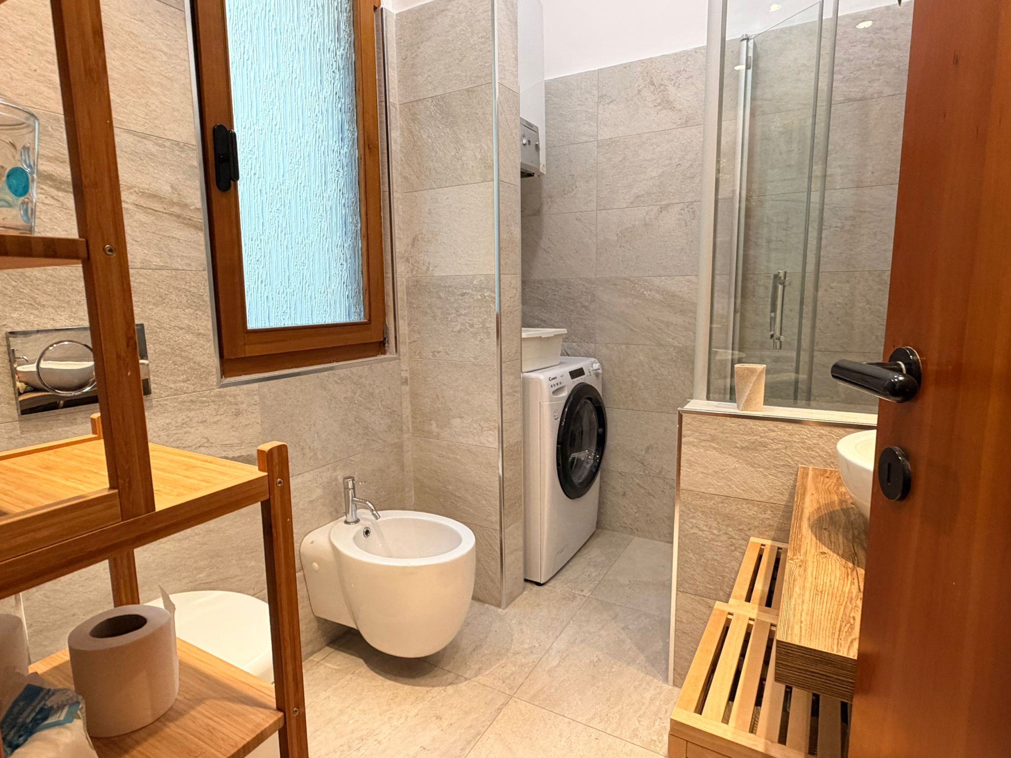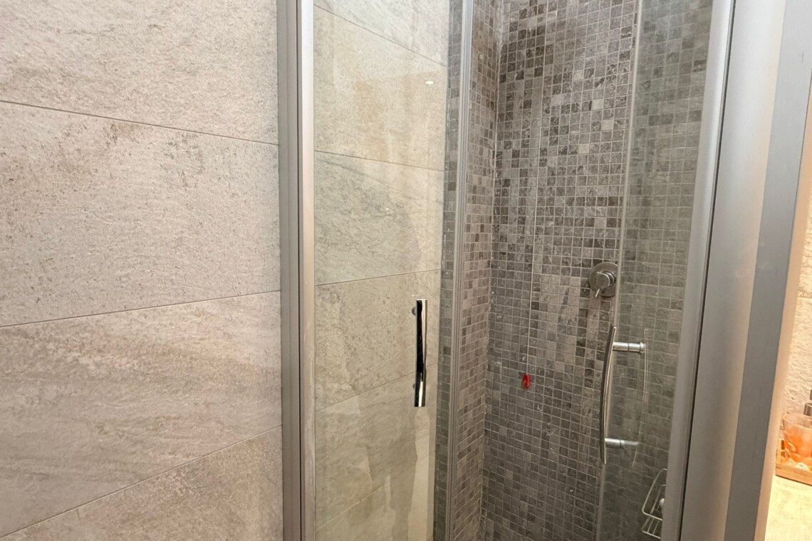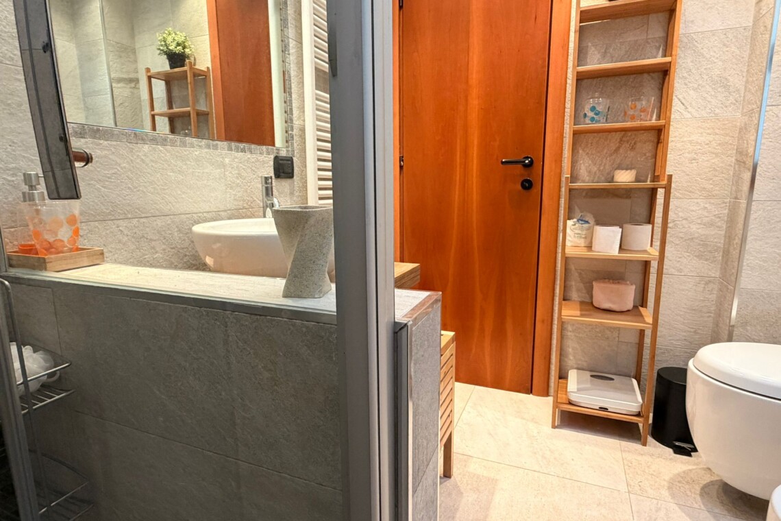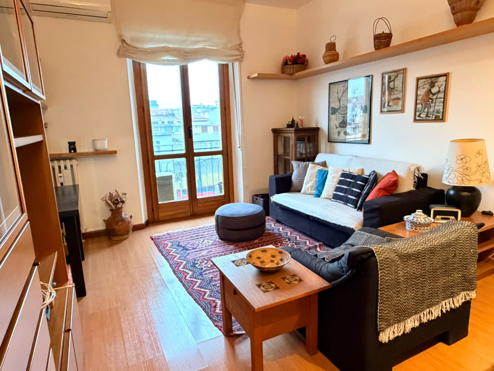 From the study area, the second door leads to the bedroom, which is bright and very spacious, furnished with a comfortable double bed and a large wardrobe. The apartment also includes a windowed bathroom with a shower, washing machine, and bidet.