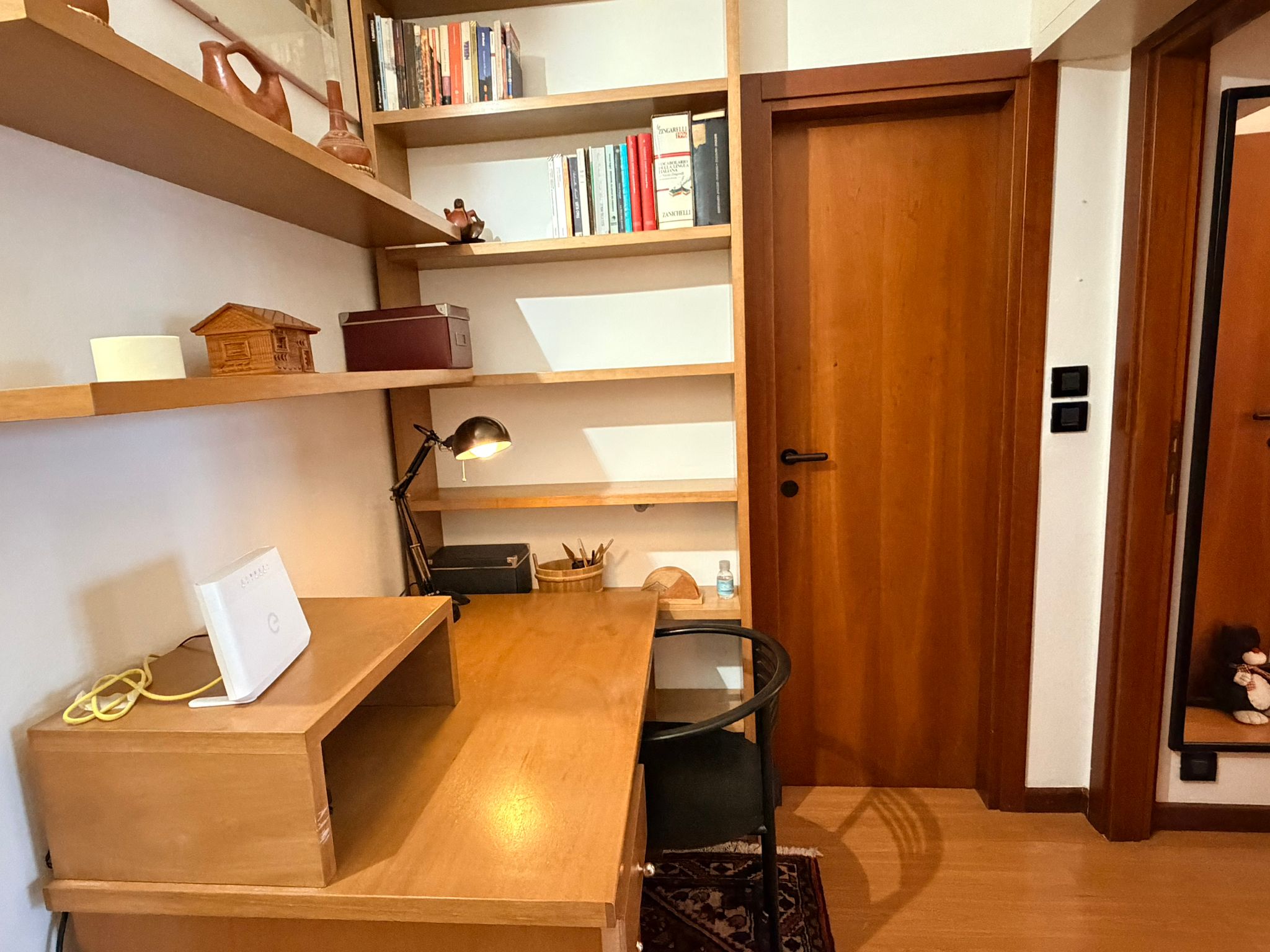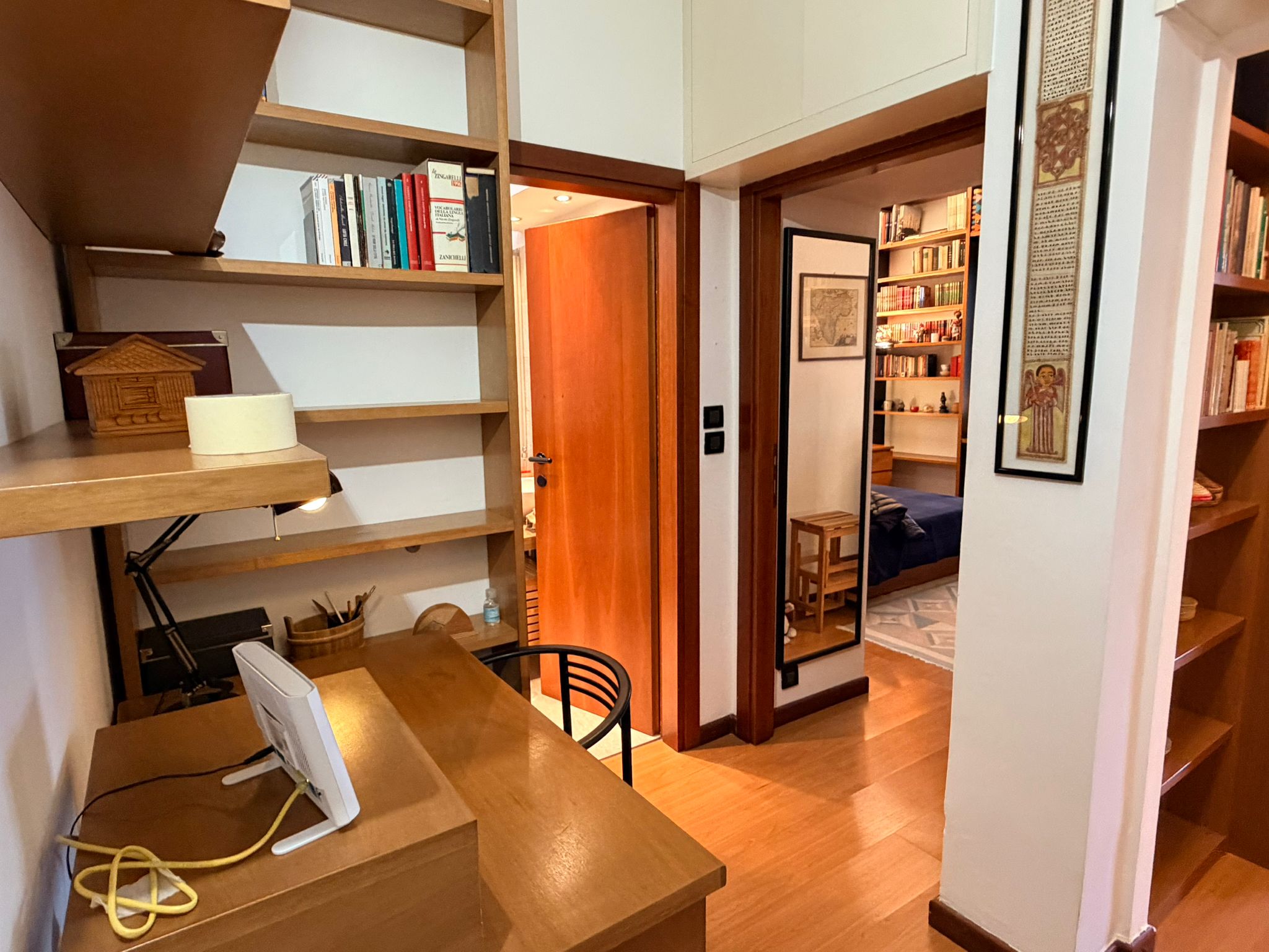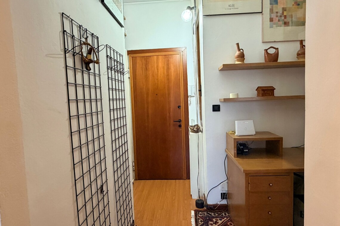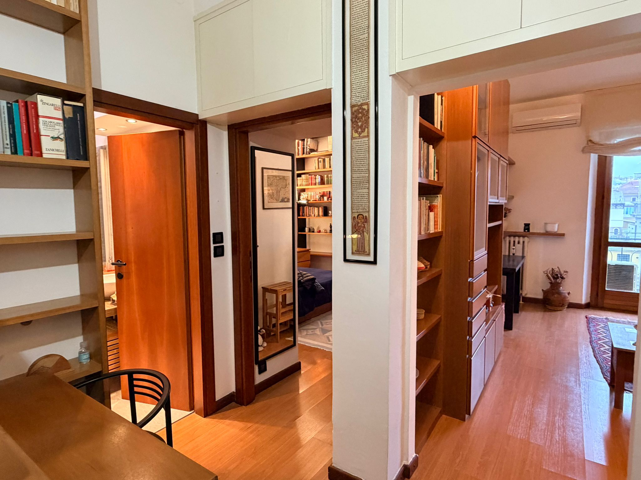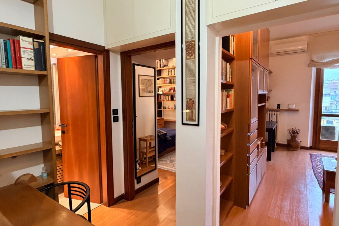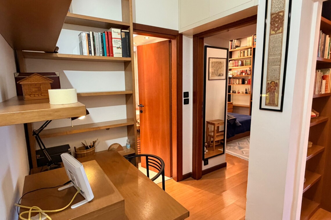 From this area, you can access the living room, which is spacious and filled with natural light. It features a sofa, an armchair, bookshelves, and several wall shelves. The living room opens onto a balcony with an open view over a quiet sports field and an oratory, ensuring privacy and no buildings directly in front.
