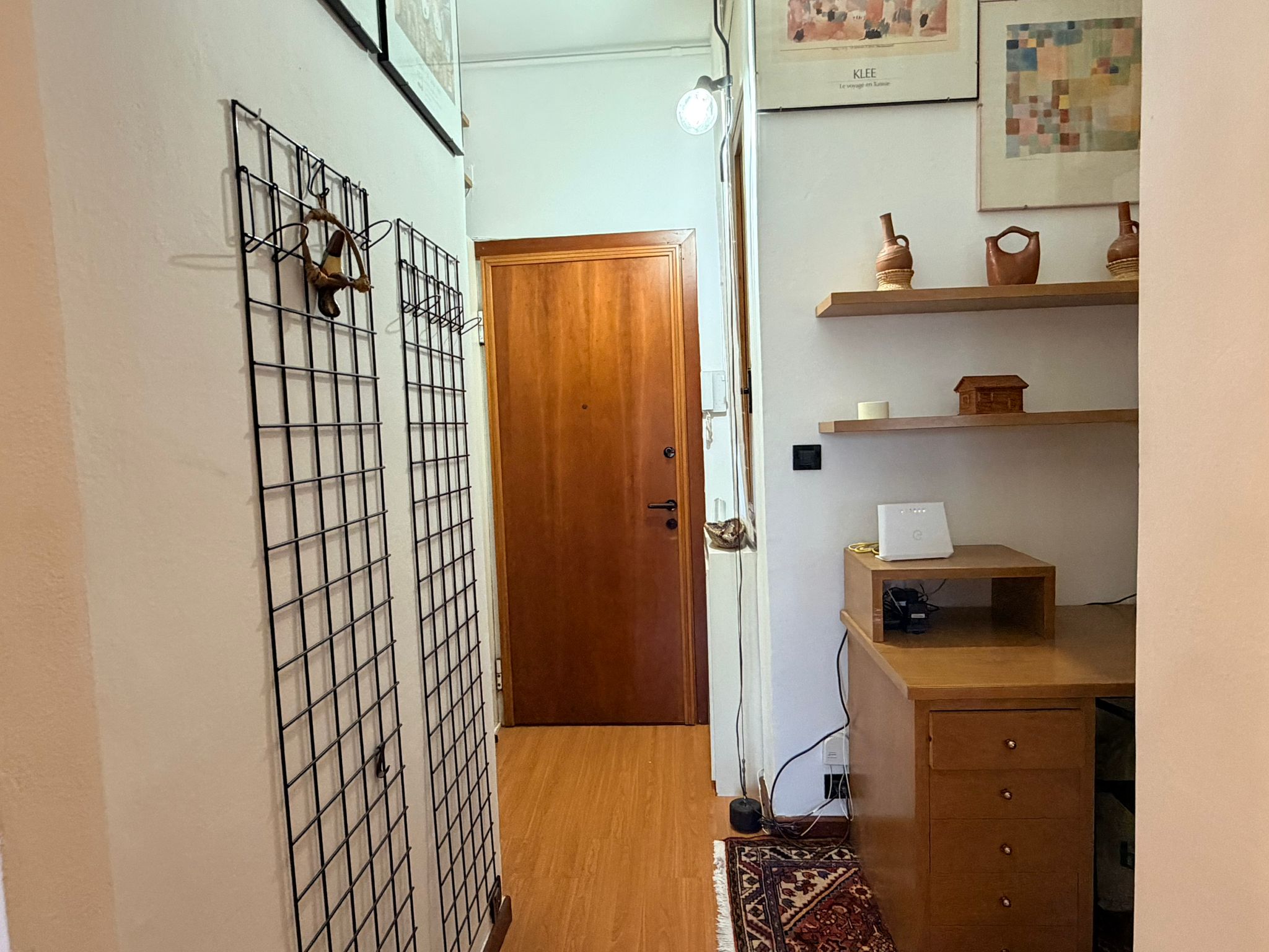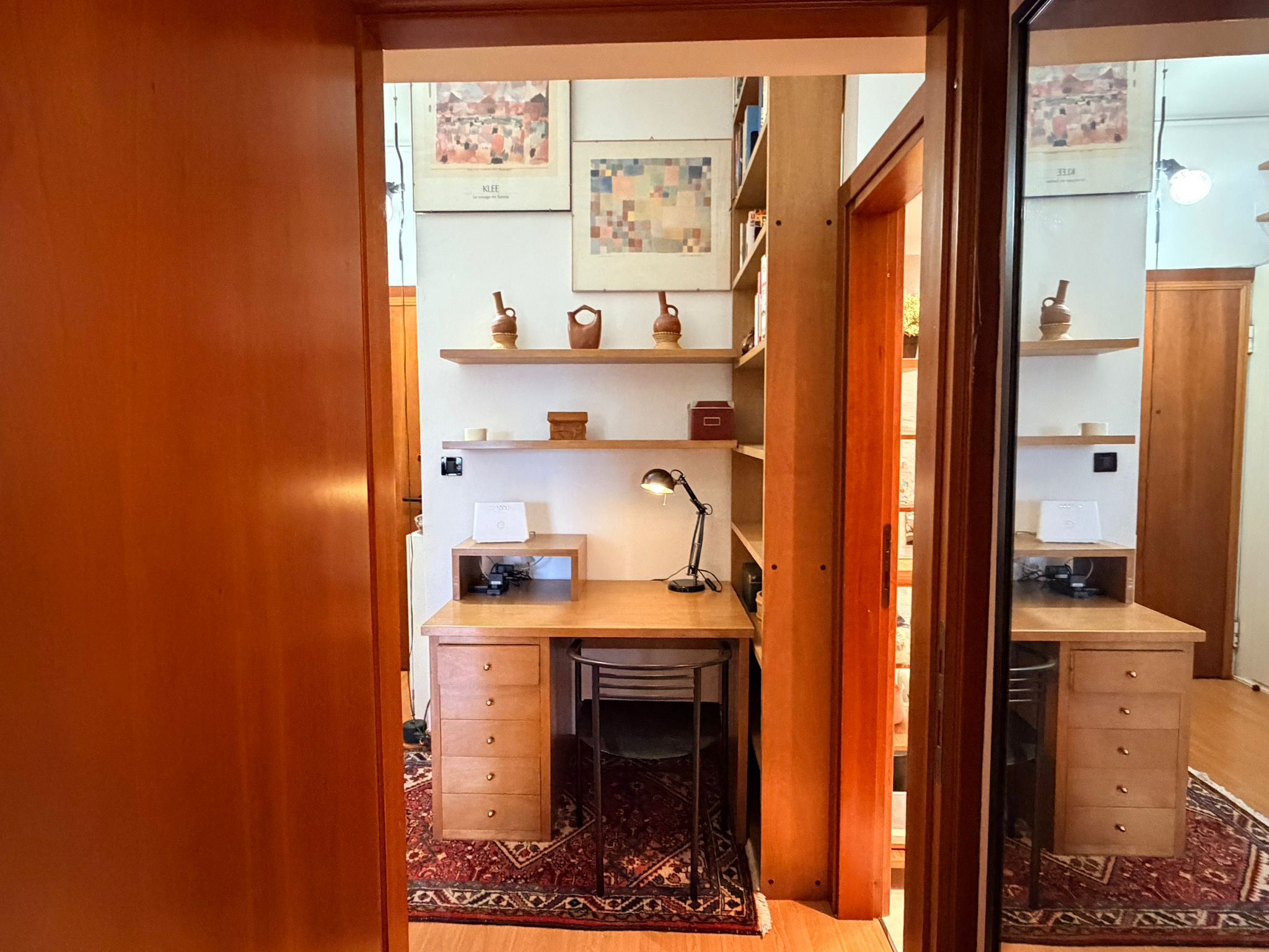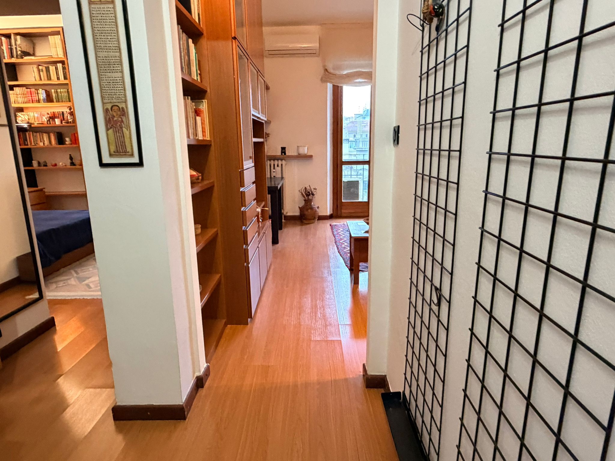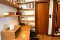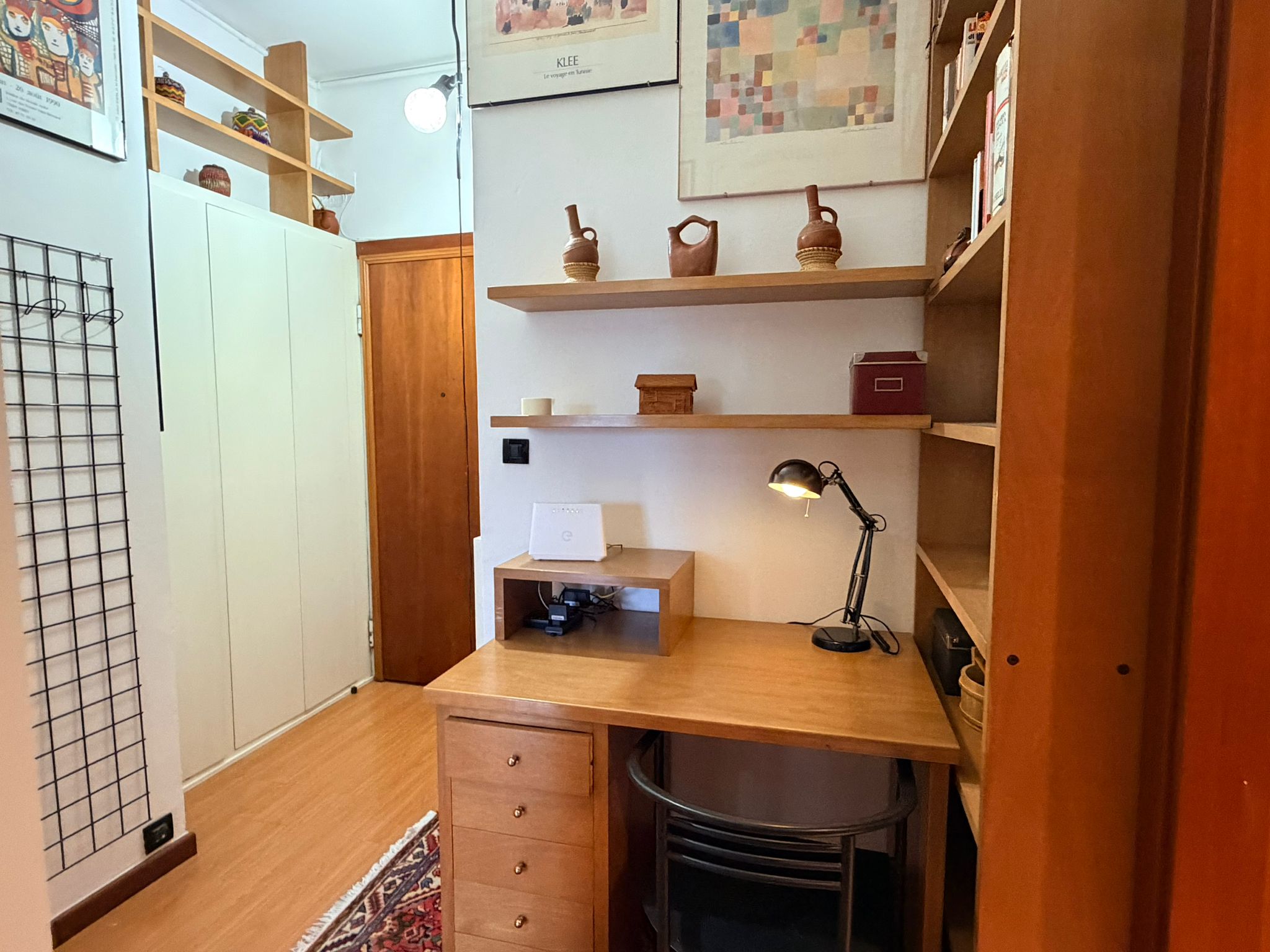 From this area, you can access the living room, which is spacious and filled with natural light. It features a sofa, an armchair, bookshelves, and several wall shelves. The living room opens onto a balcony with an open view over a quiet sports field and an oratory, ensuring privacy and no buildings directly in front.