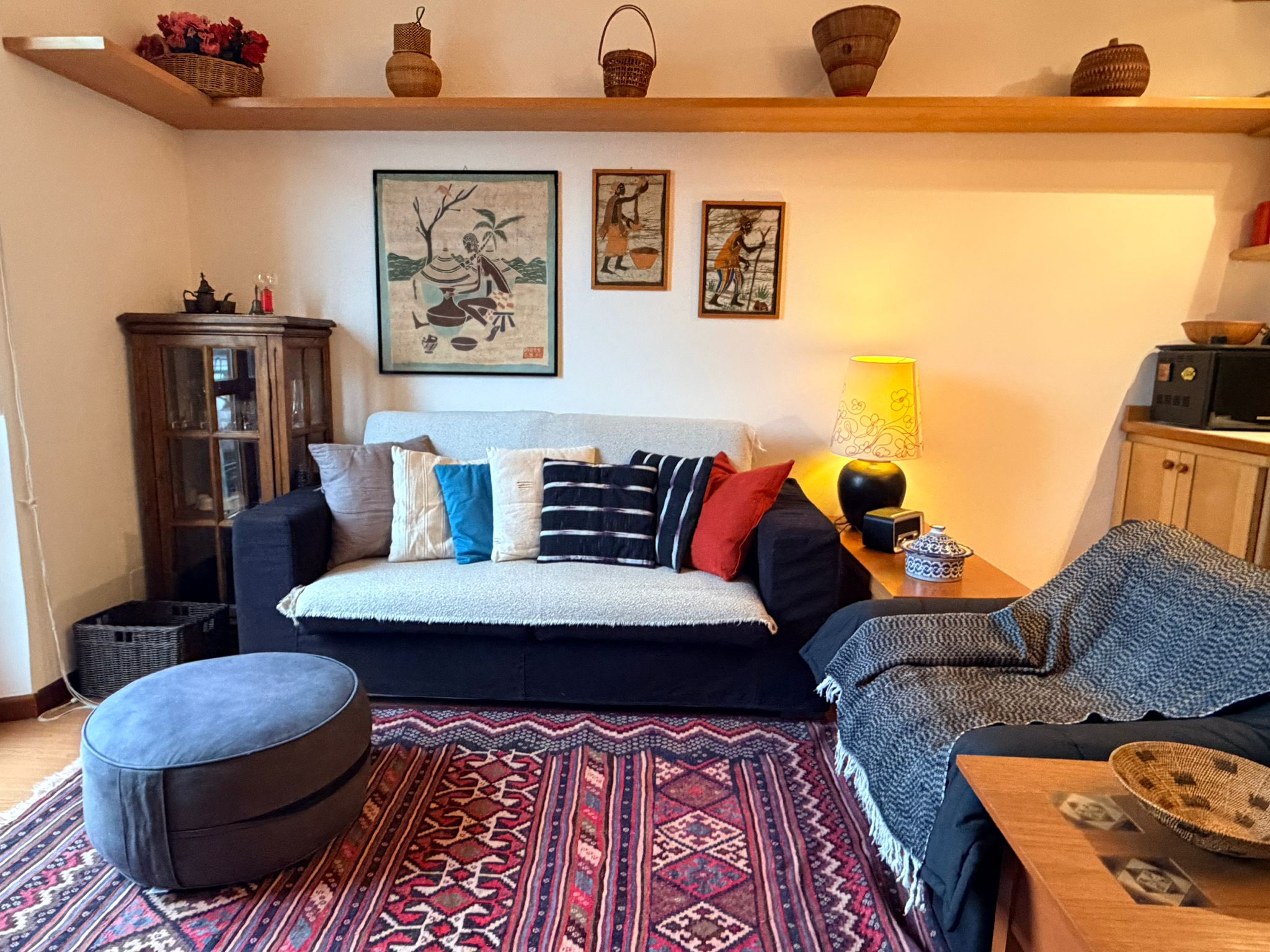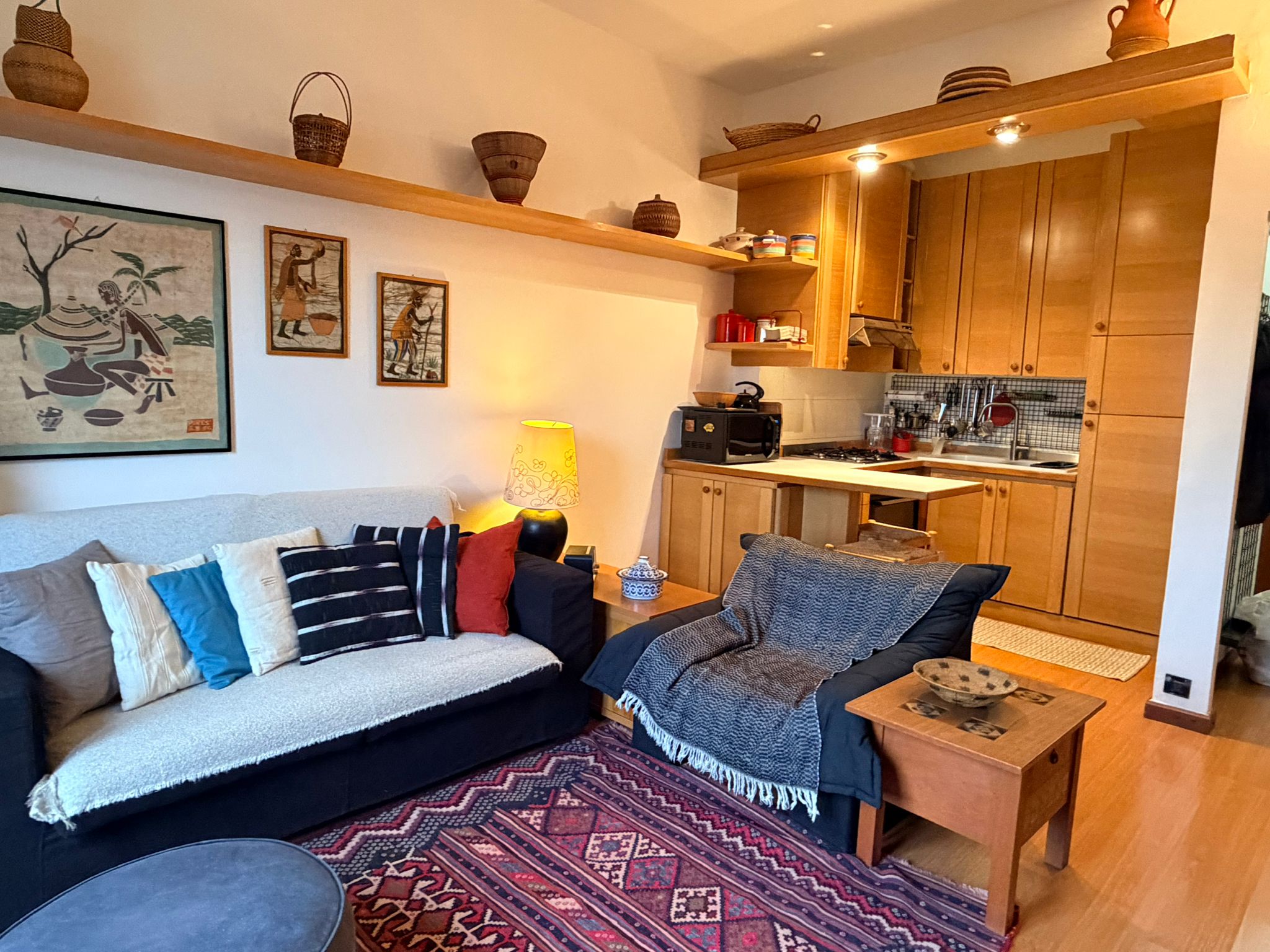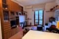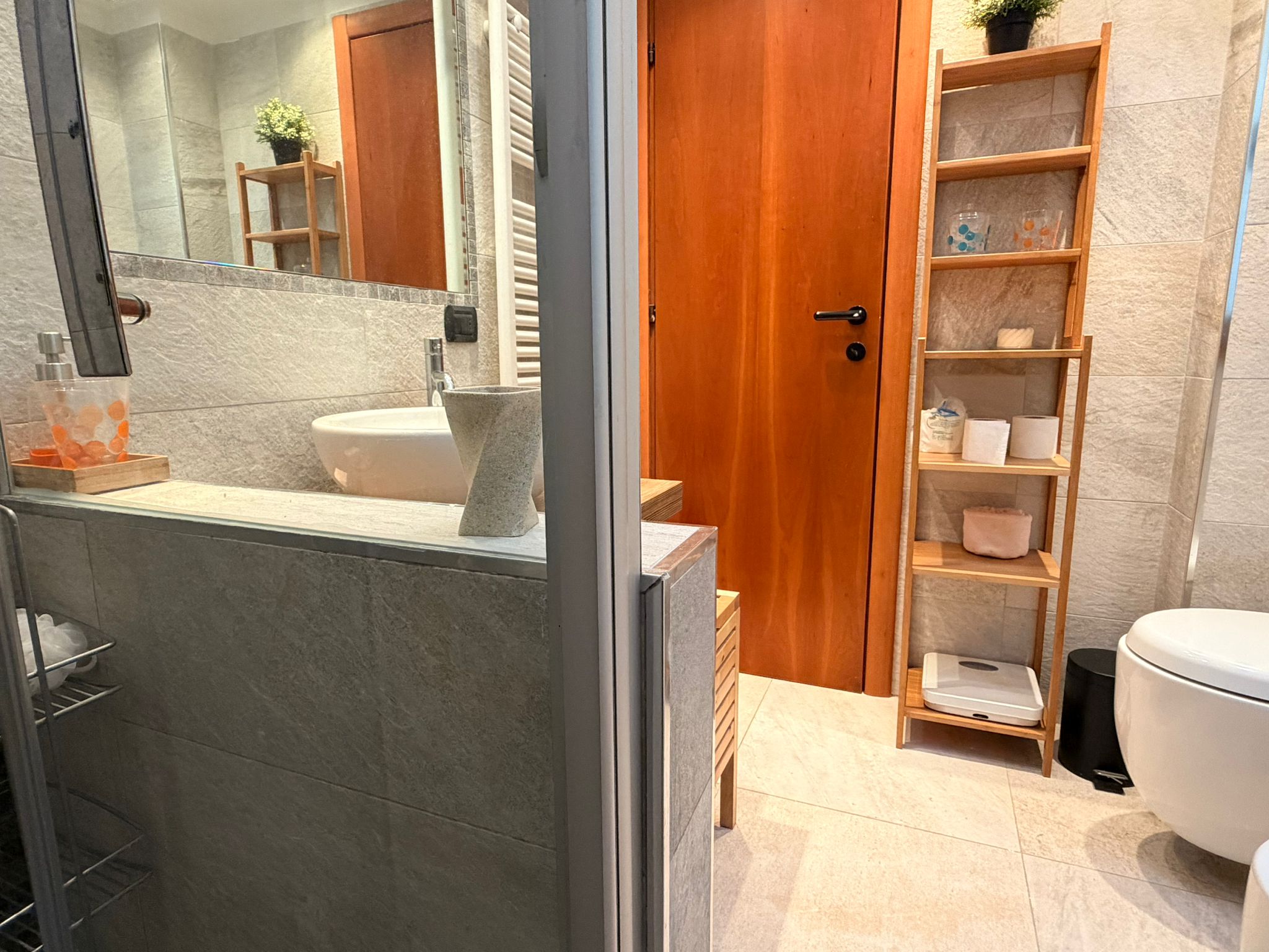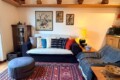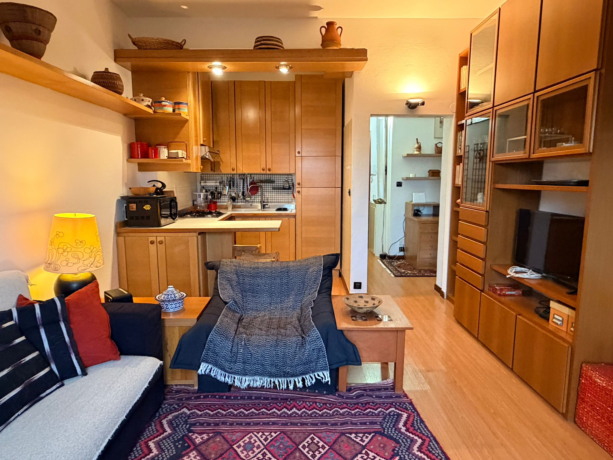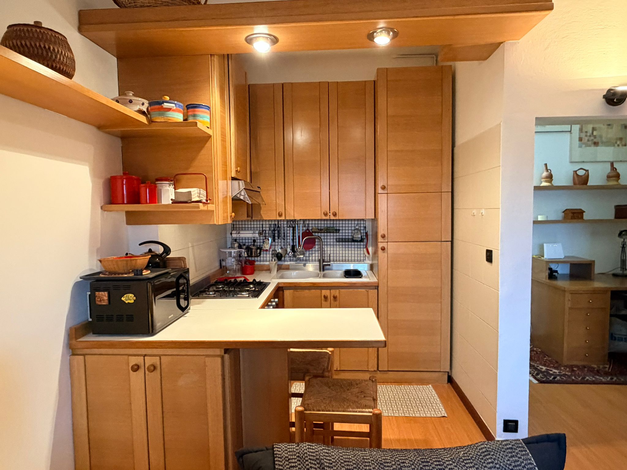 From this area, you can access the living room, which is spacious and filled with natural light. It features a sofa, an armchair, bookshelves, and several wall shelves. The living room opens onto a balcony with an open view over a quiet sports field and an oratory, ensuring privacy and no buildings directly in front.