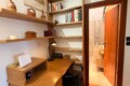Upon entering, you are welcomed by a large entrance hallway that leads to a small study area equipped with a desk and a bookcase, creating a comfortable space for working or studying.