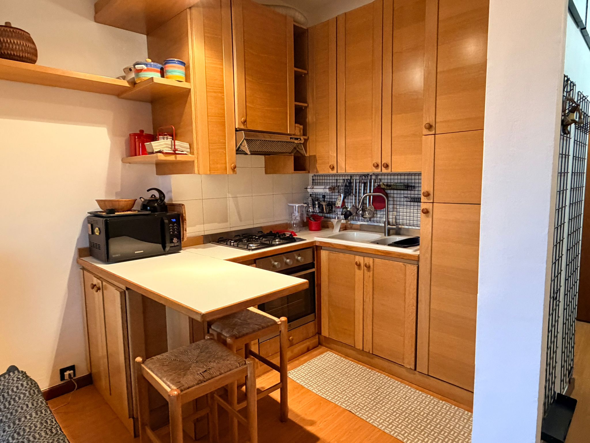 Just to the right of the living room, you will find the fully equipped kitchen, complete with gas hobs, a refrigerator, a freezer, and a peninsula-style dining area. It offers everything you need for everyday cooking.