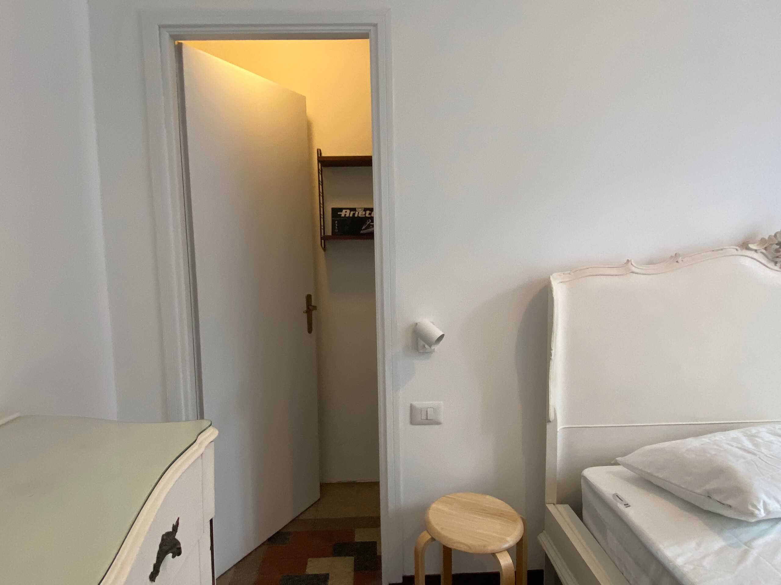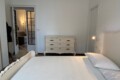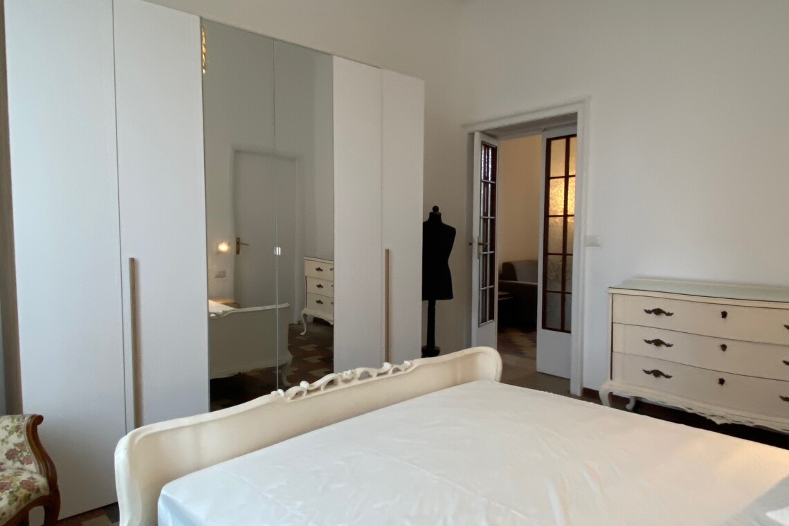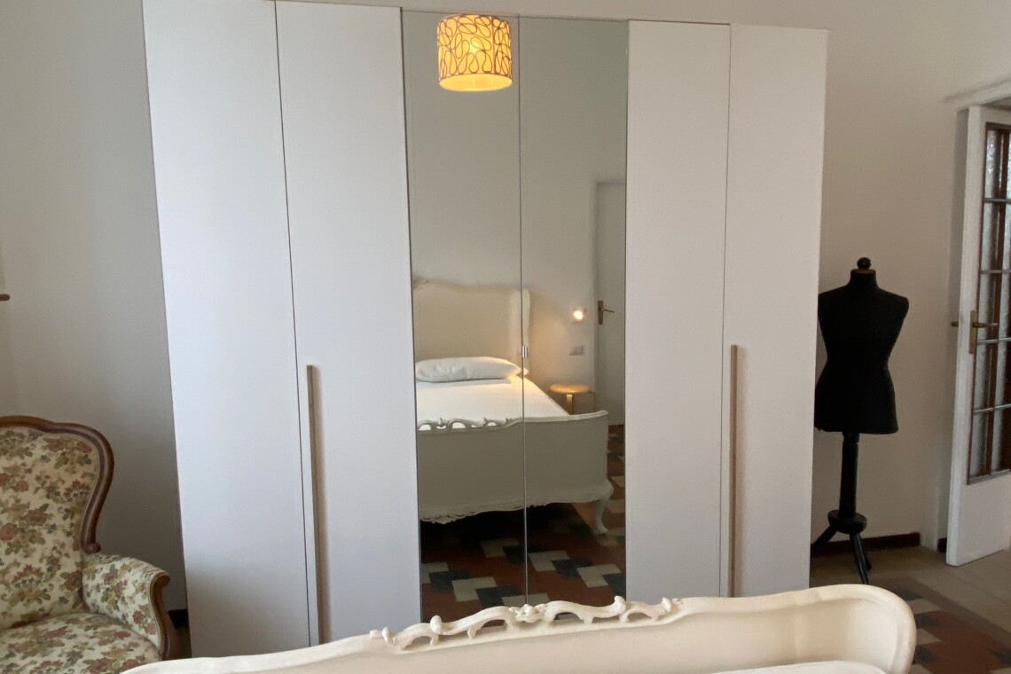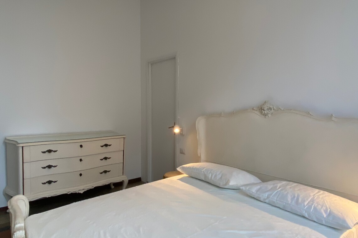 Airy bedroom with a double bed, a chest of drawers, a wardrobe and a walk-in closet.