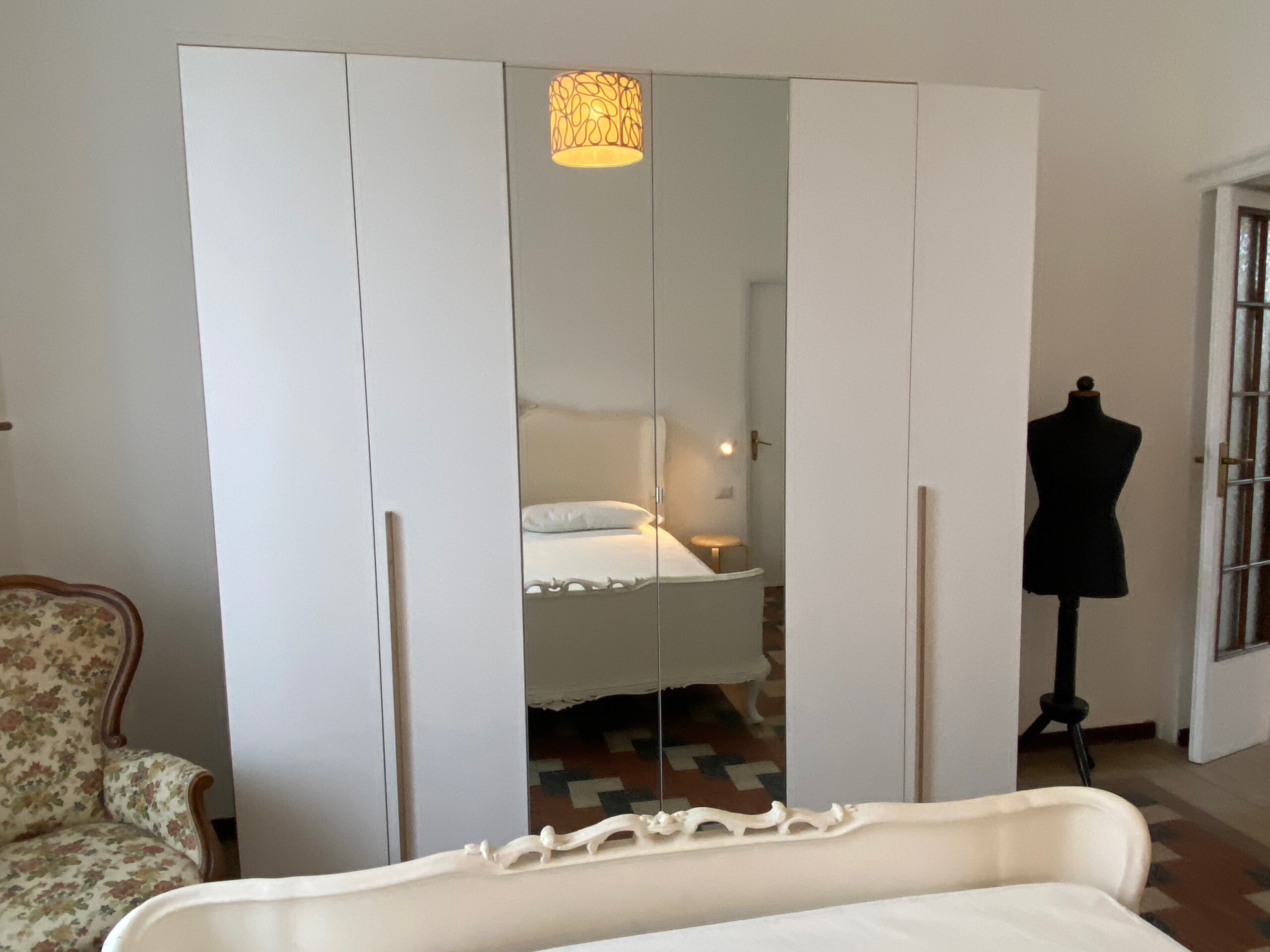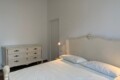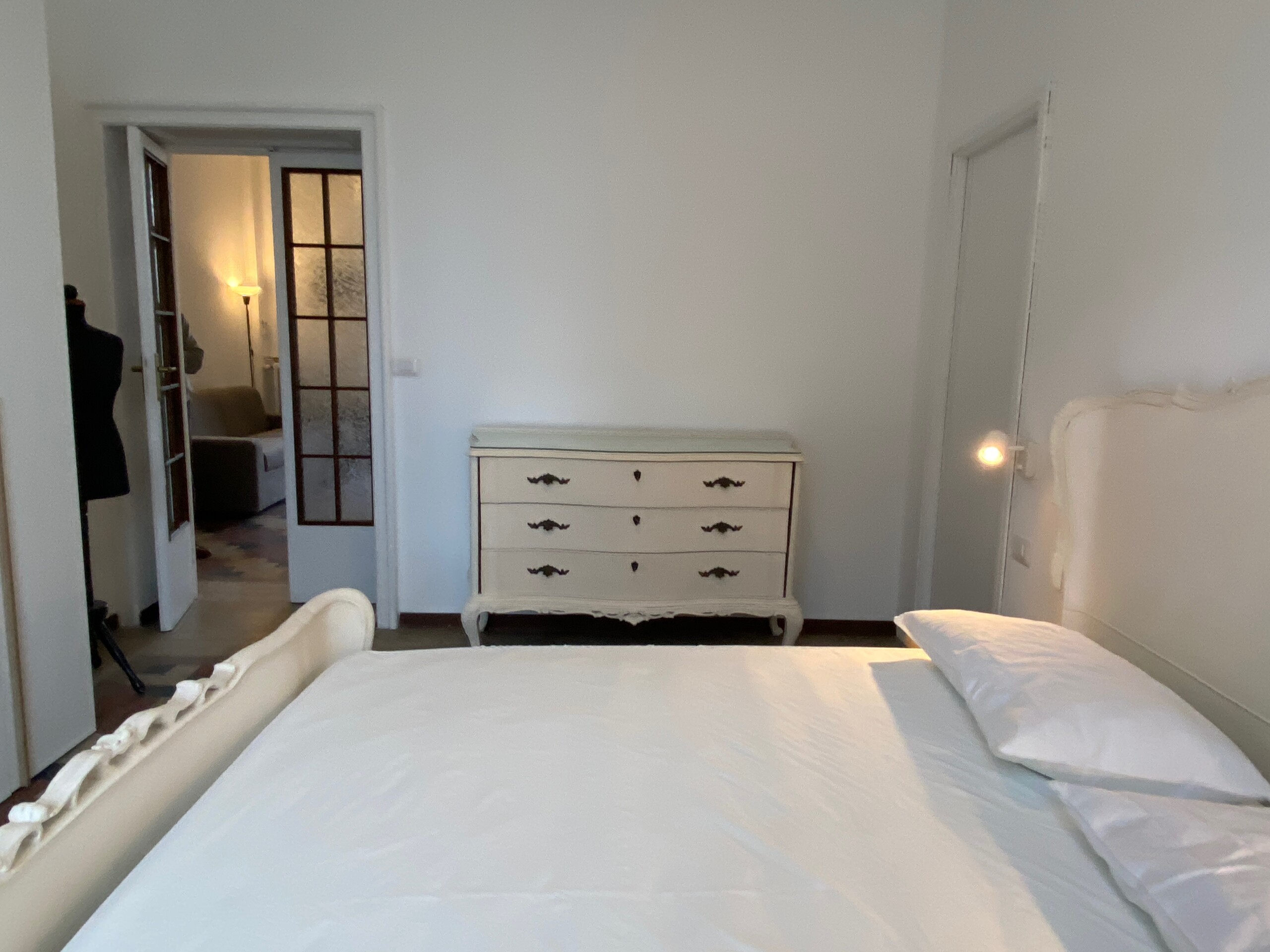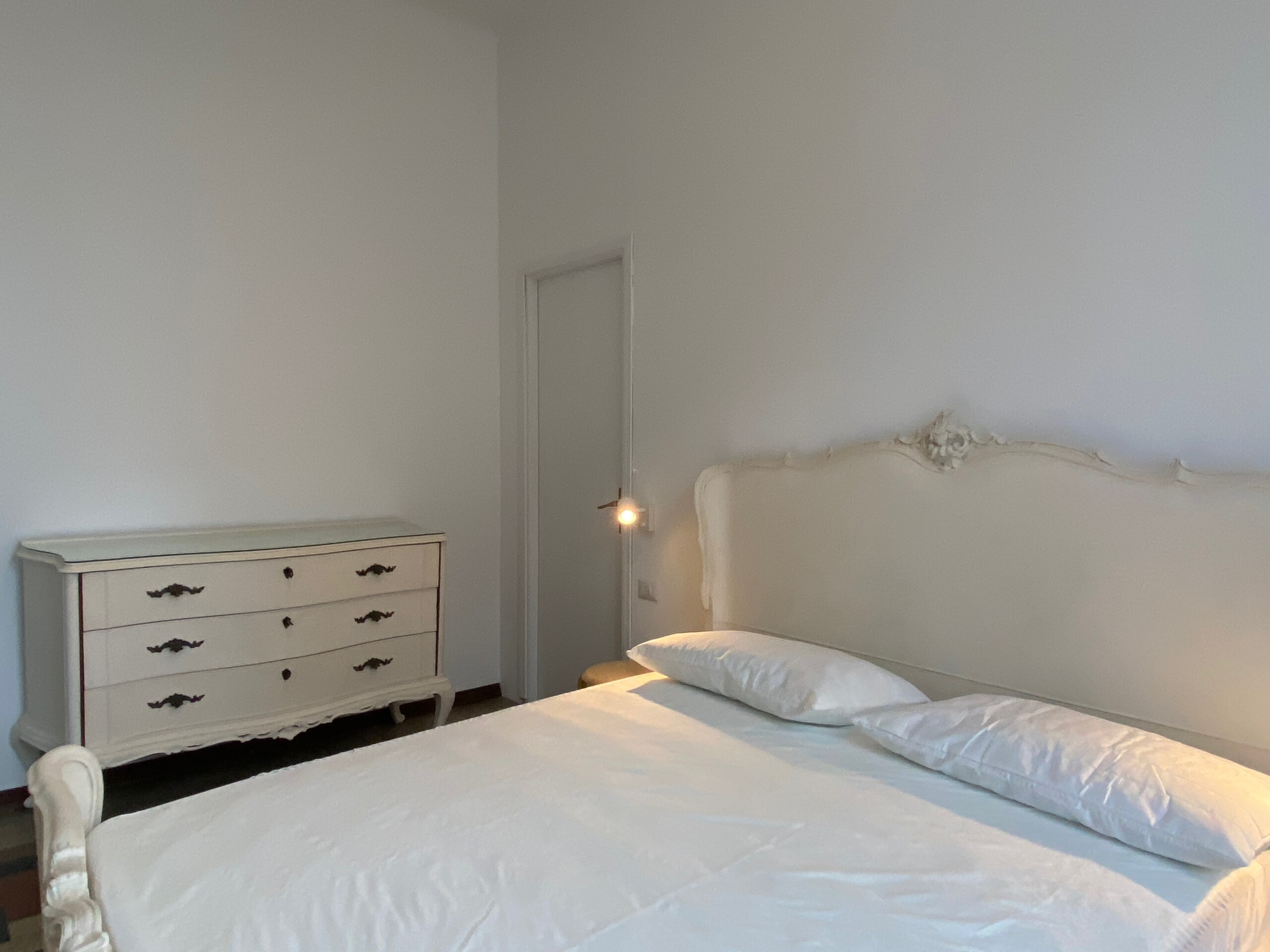 Airy bedroom with a double bed, a chest of drawers, a wardrobe and a walk-in closet.