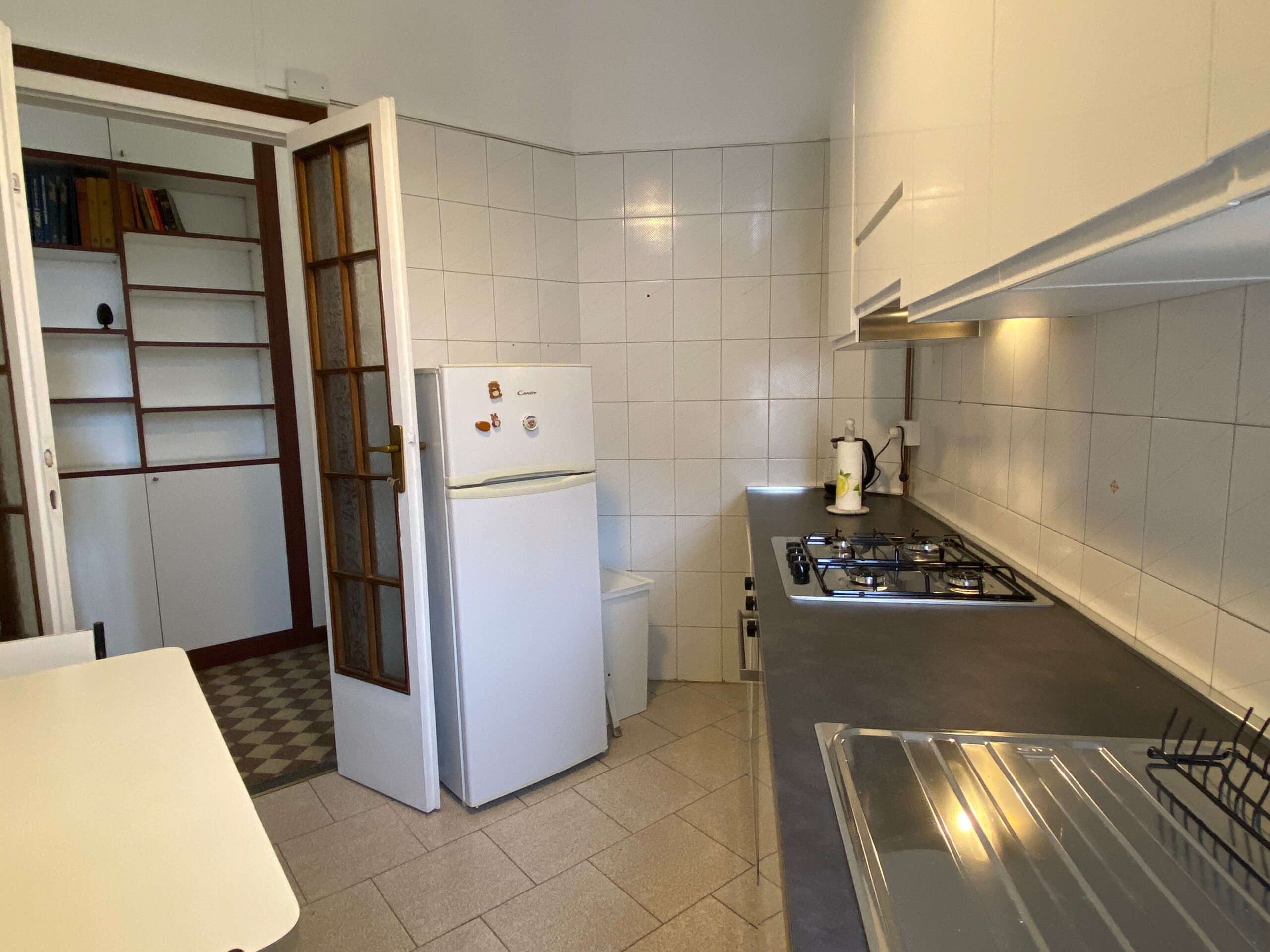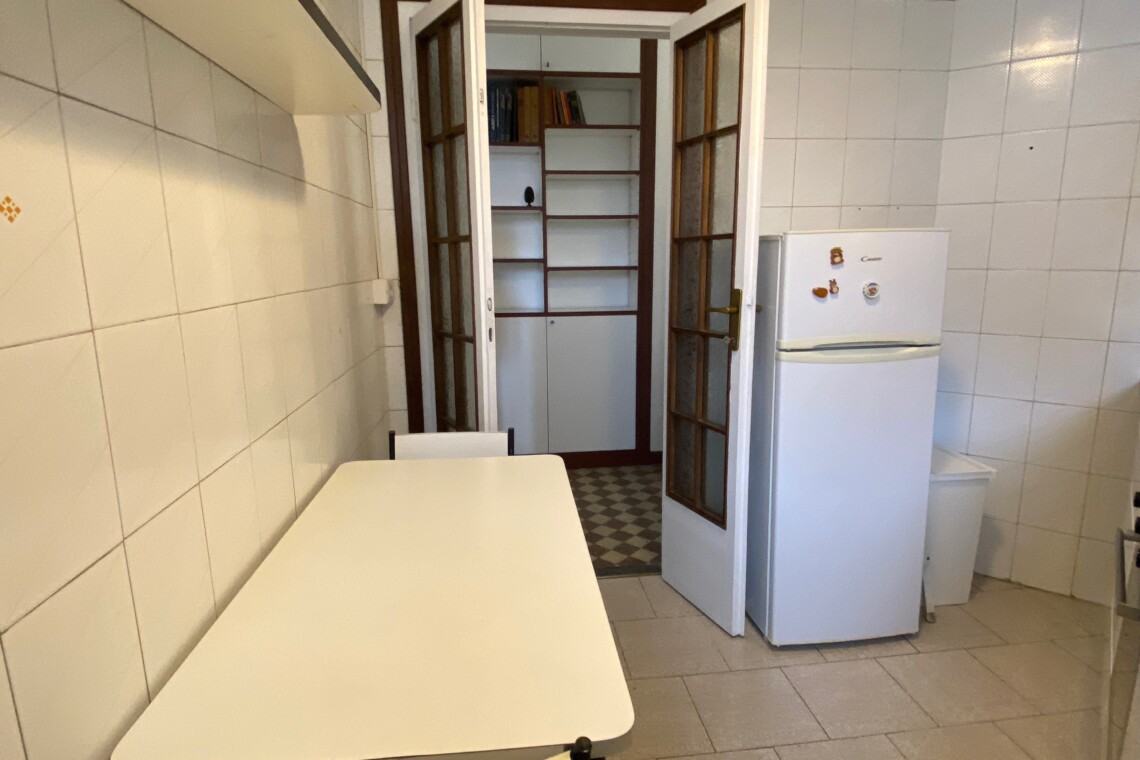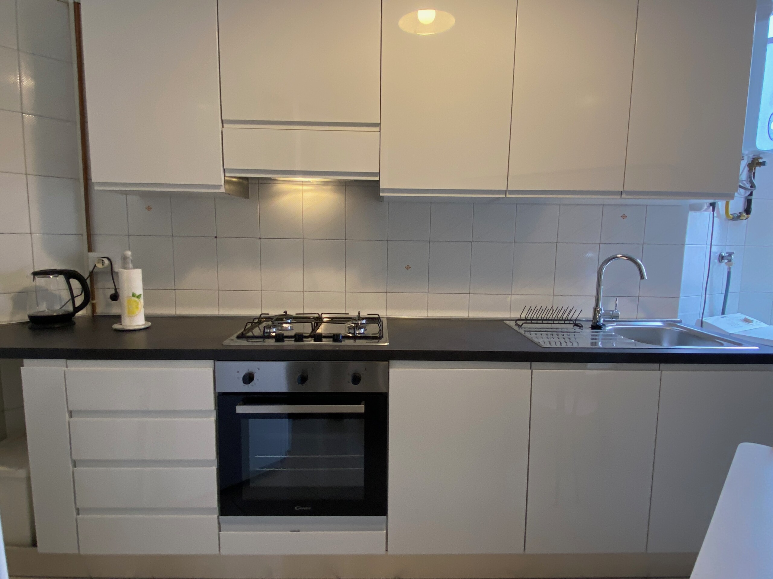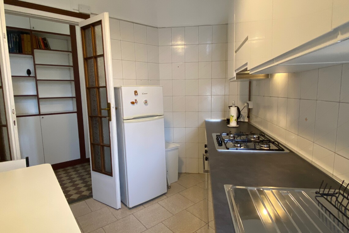 Fully equipped kitchen, with washing machine, gas hob, electric oven and fridge.