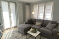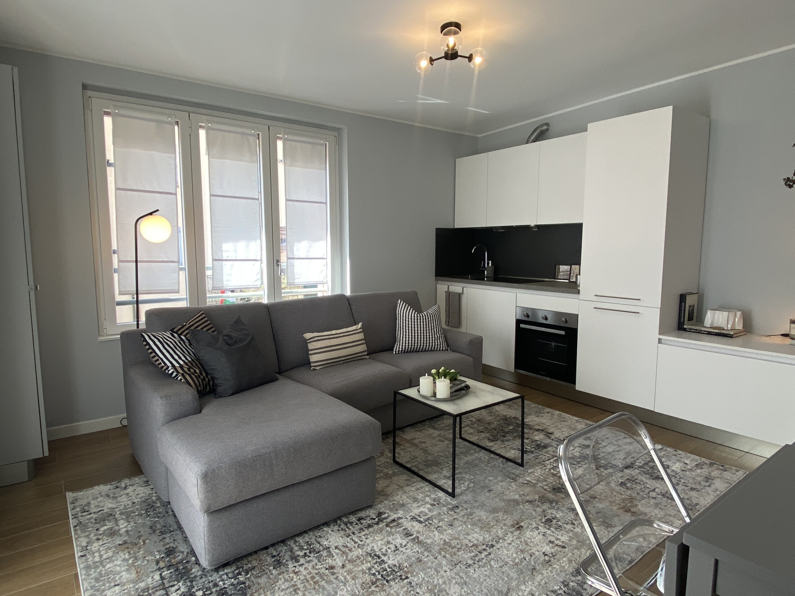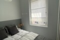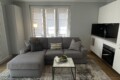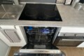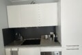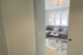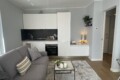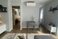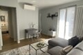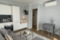 From the entrance, a sliding door leads into the spacious and bright living room, filled with natural light thanks to large windows. The living area features a comfortable L-shaped sofa, a TV, an extendable dining table, and additional storage space. The modern open-plan kitchen is fully equipped with induction hobs, electric oven, fridge, and freezer, providing everything needed for everyday living.