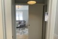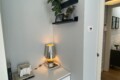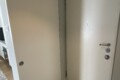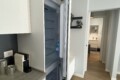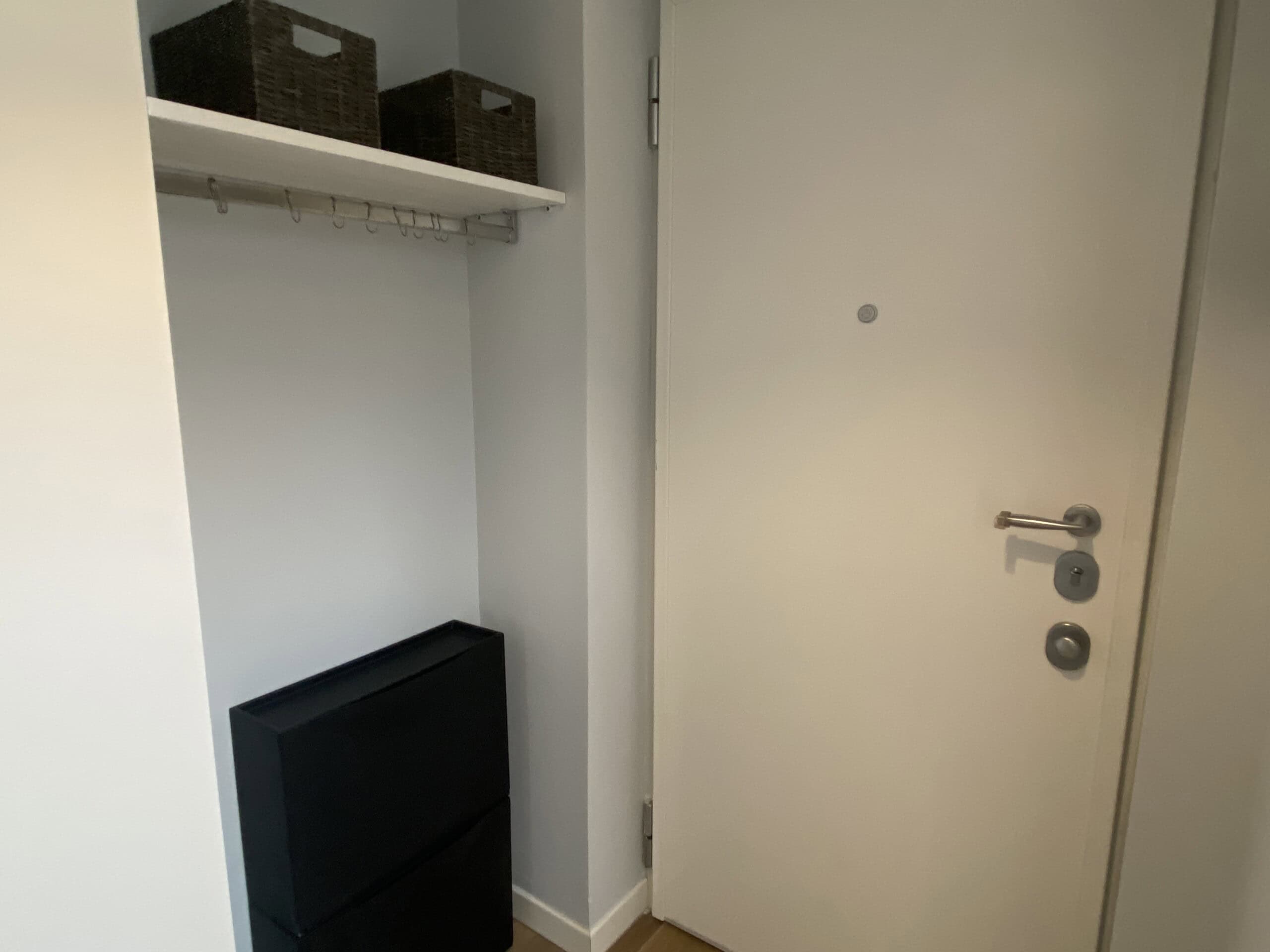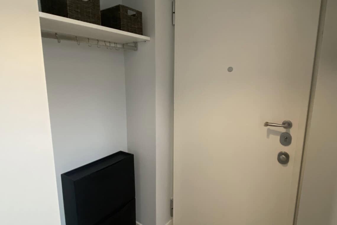 Upon entering, you are welcomed by a well-designed entrance area with practical storage solutions, including shelves and a wardrobe for coats. Within this space, there is also a built-in storage unit with a washing machine.