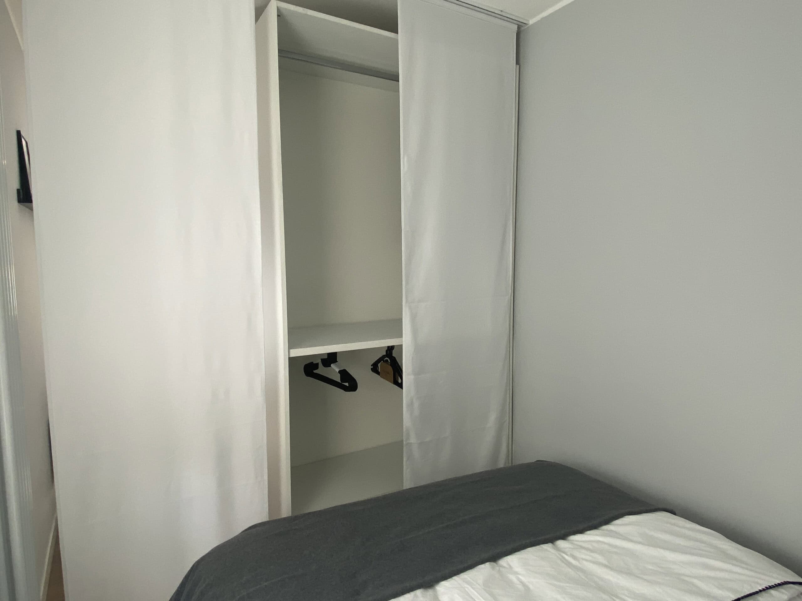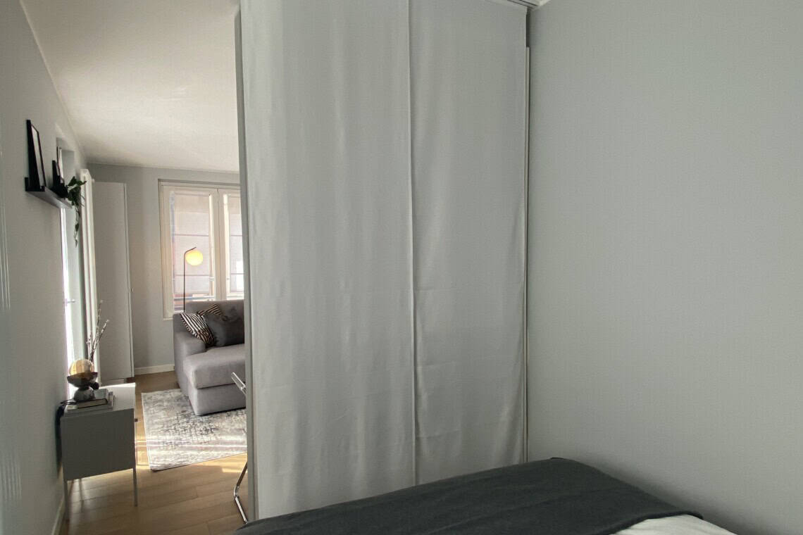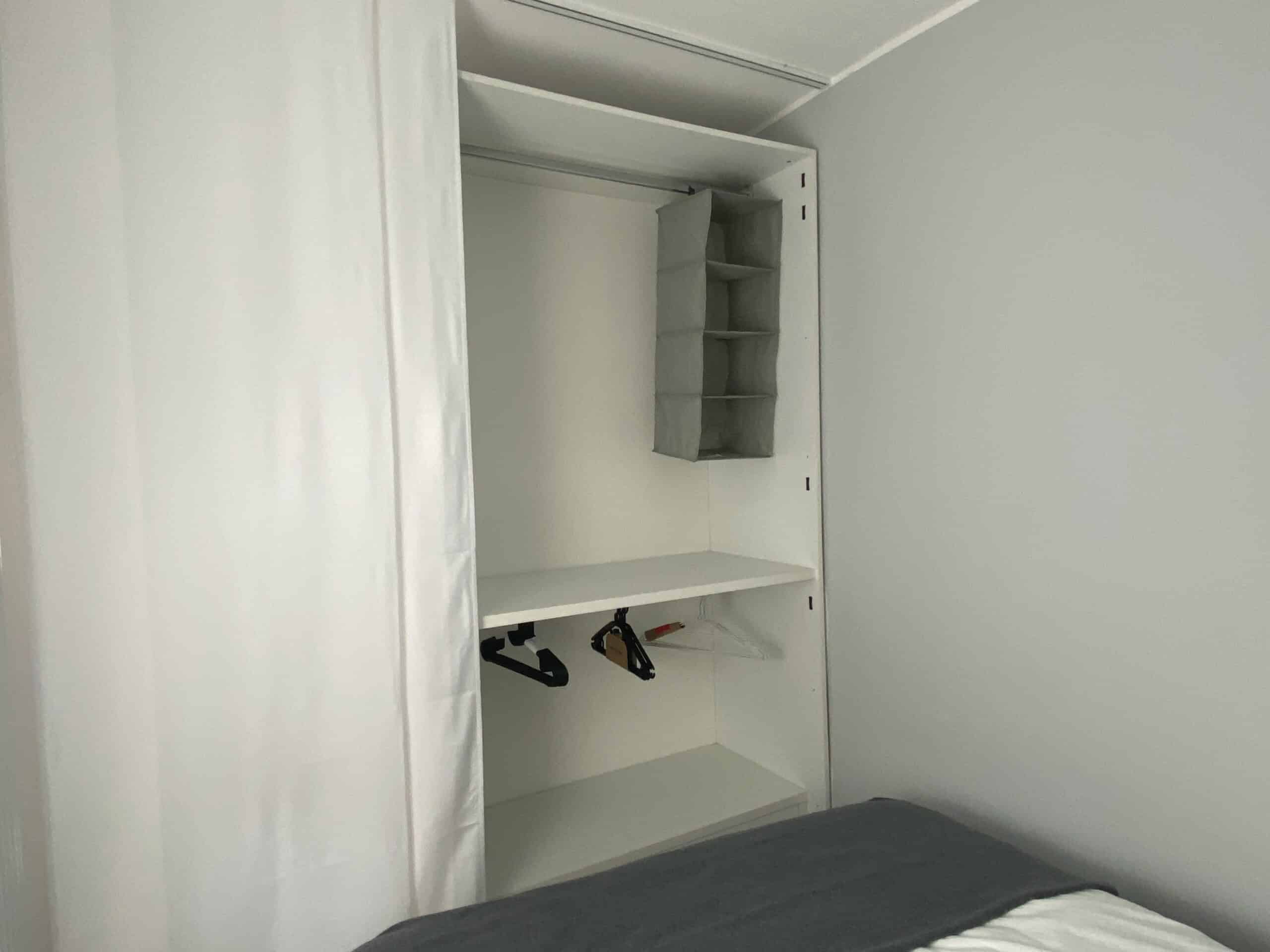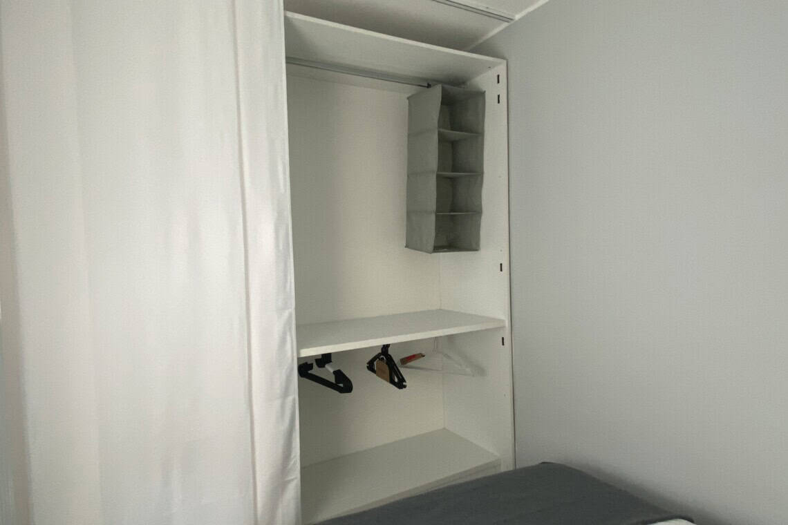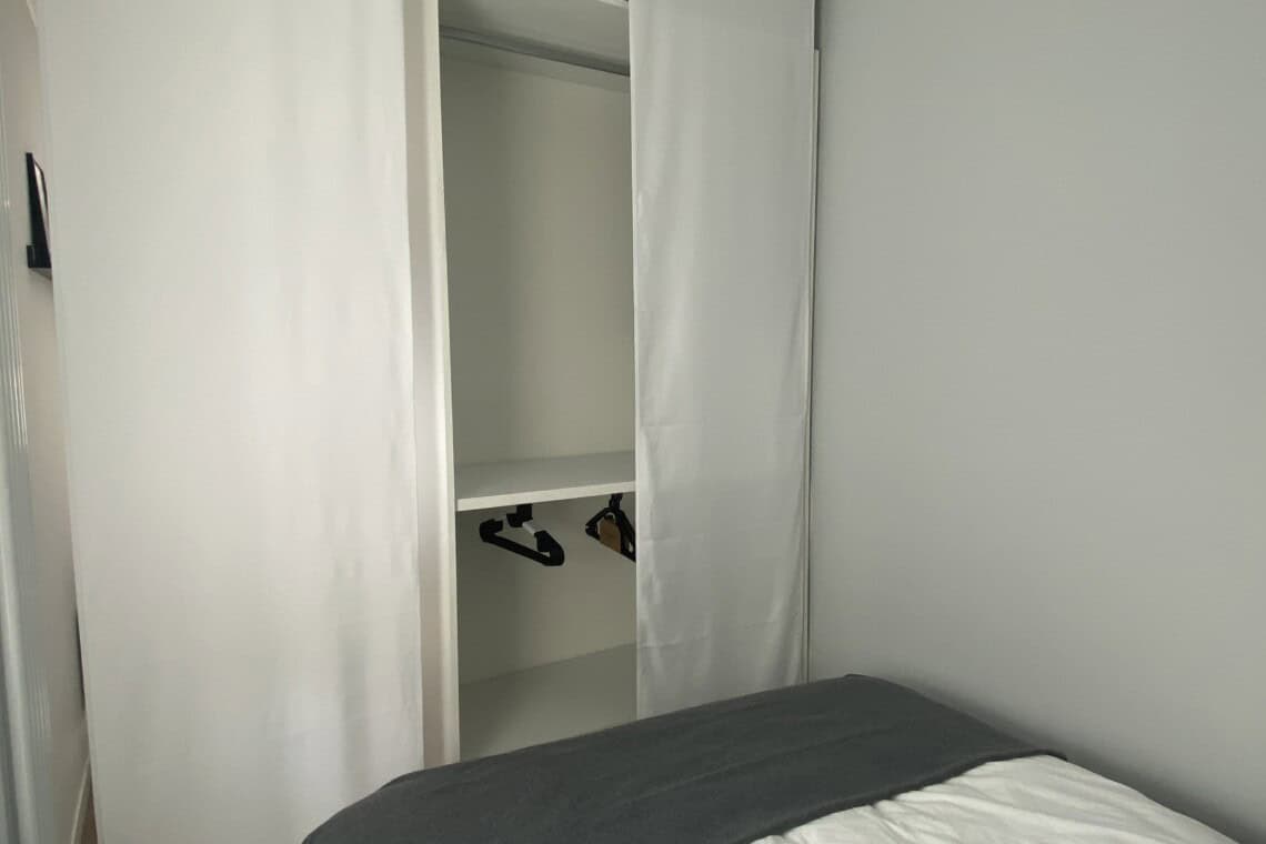 The bedroom includes a double bed and a large wardrobe, cleverly concealed behind elegant sliding panels. These panels can also be used to separate the bedroom from the living area, offering flexibility and privacy.