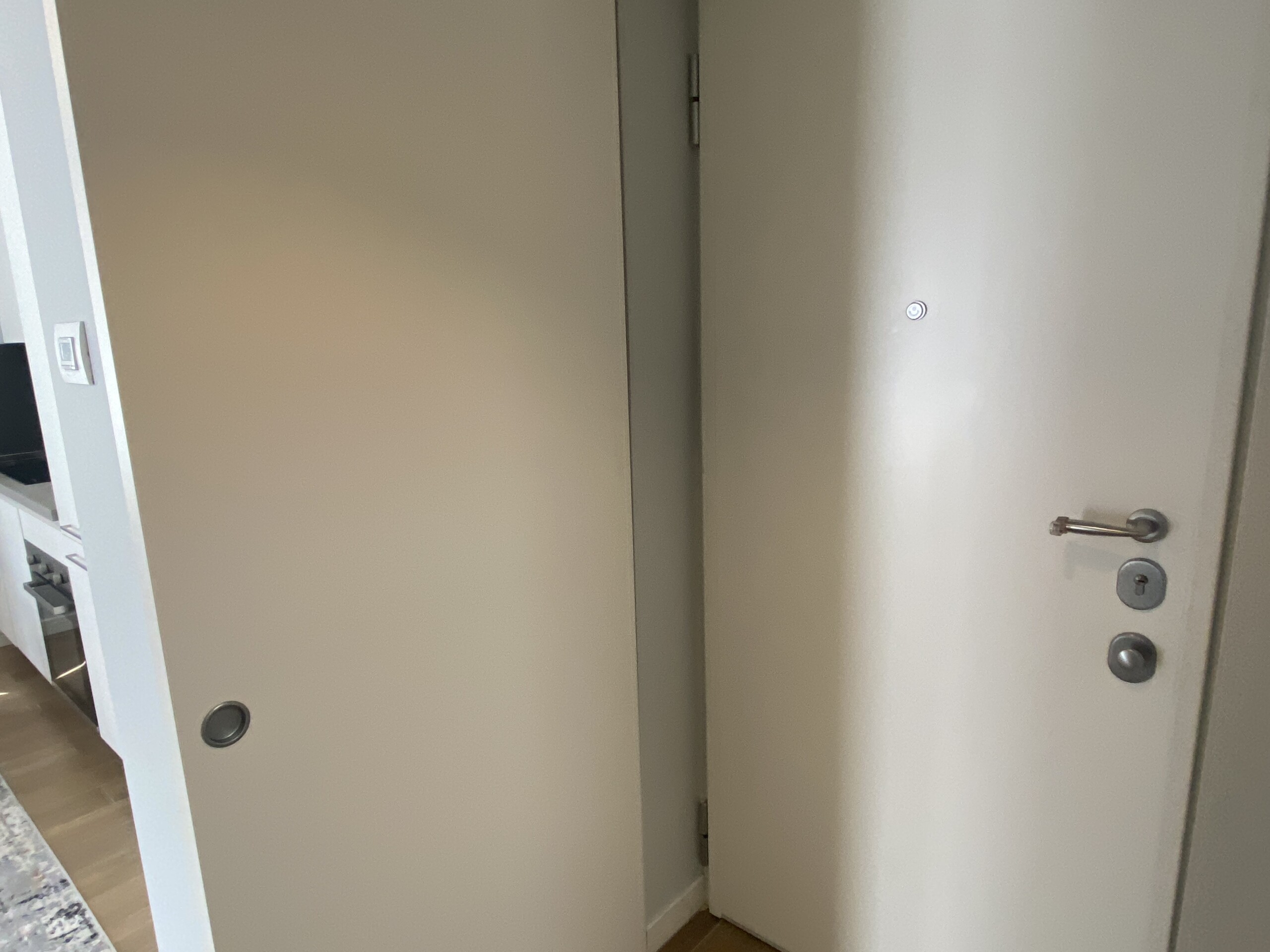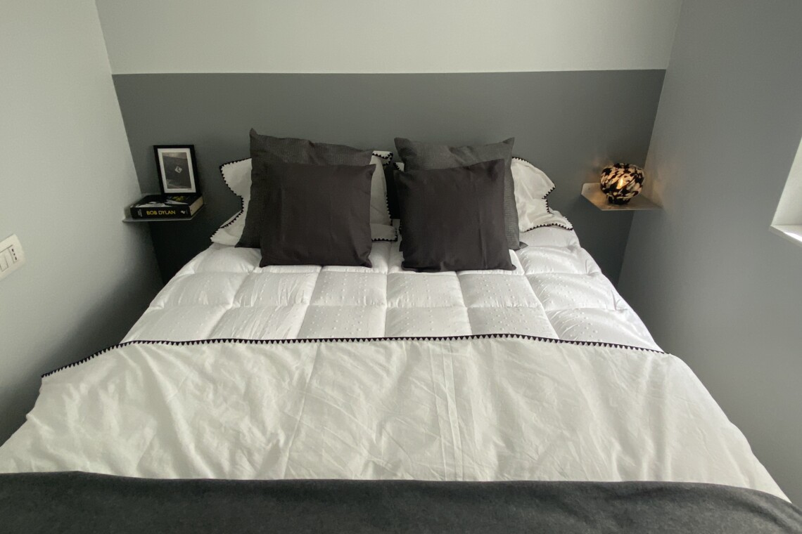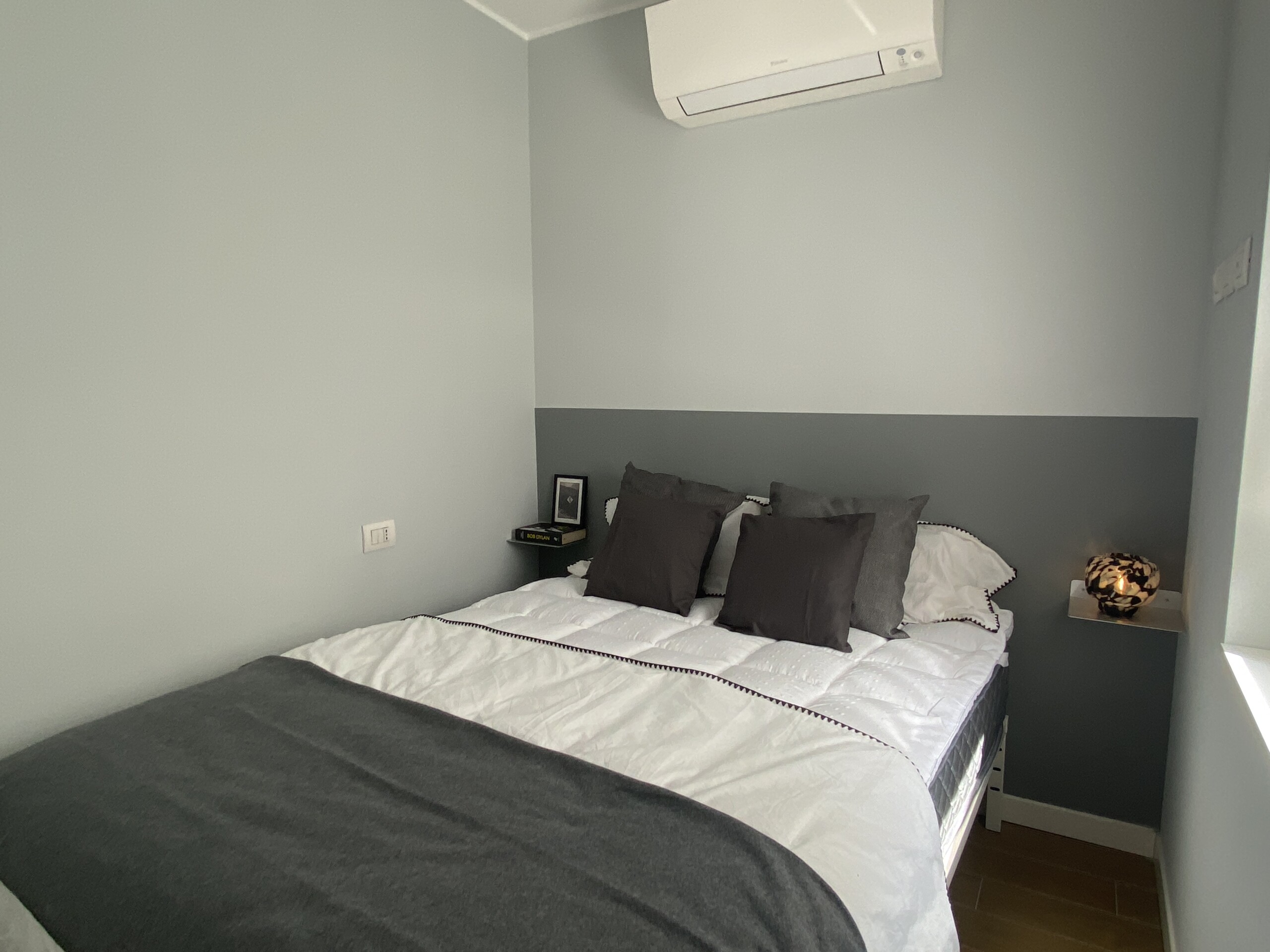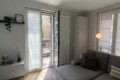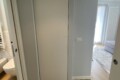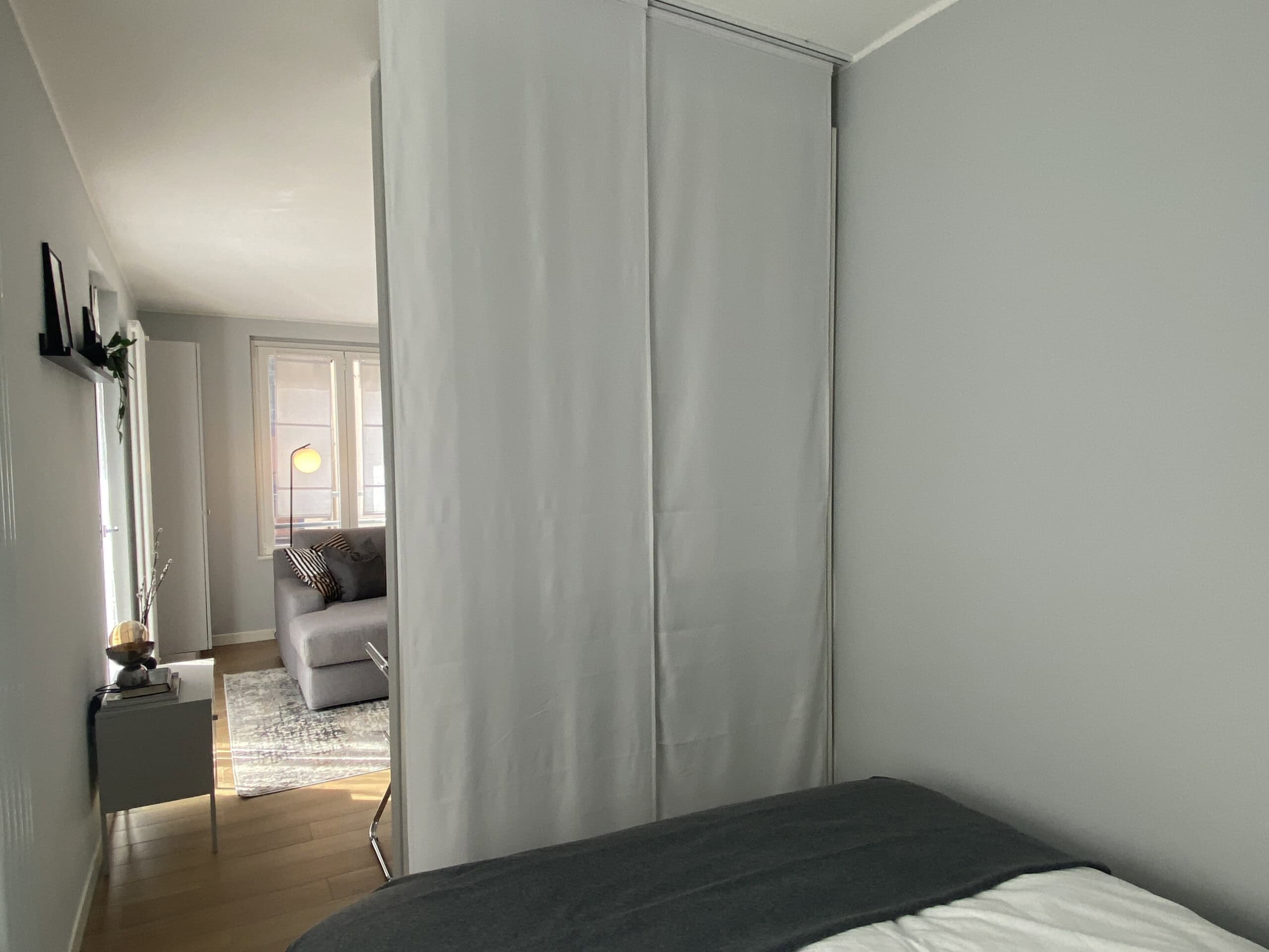 The bedroom includes a double bed and a large wardrobe, cleverly concealed behind elegant sliding panels. These panels can also be used to separate the bedroom from the living area, offering flexibility and privacy.