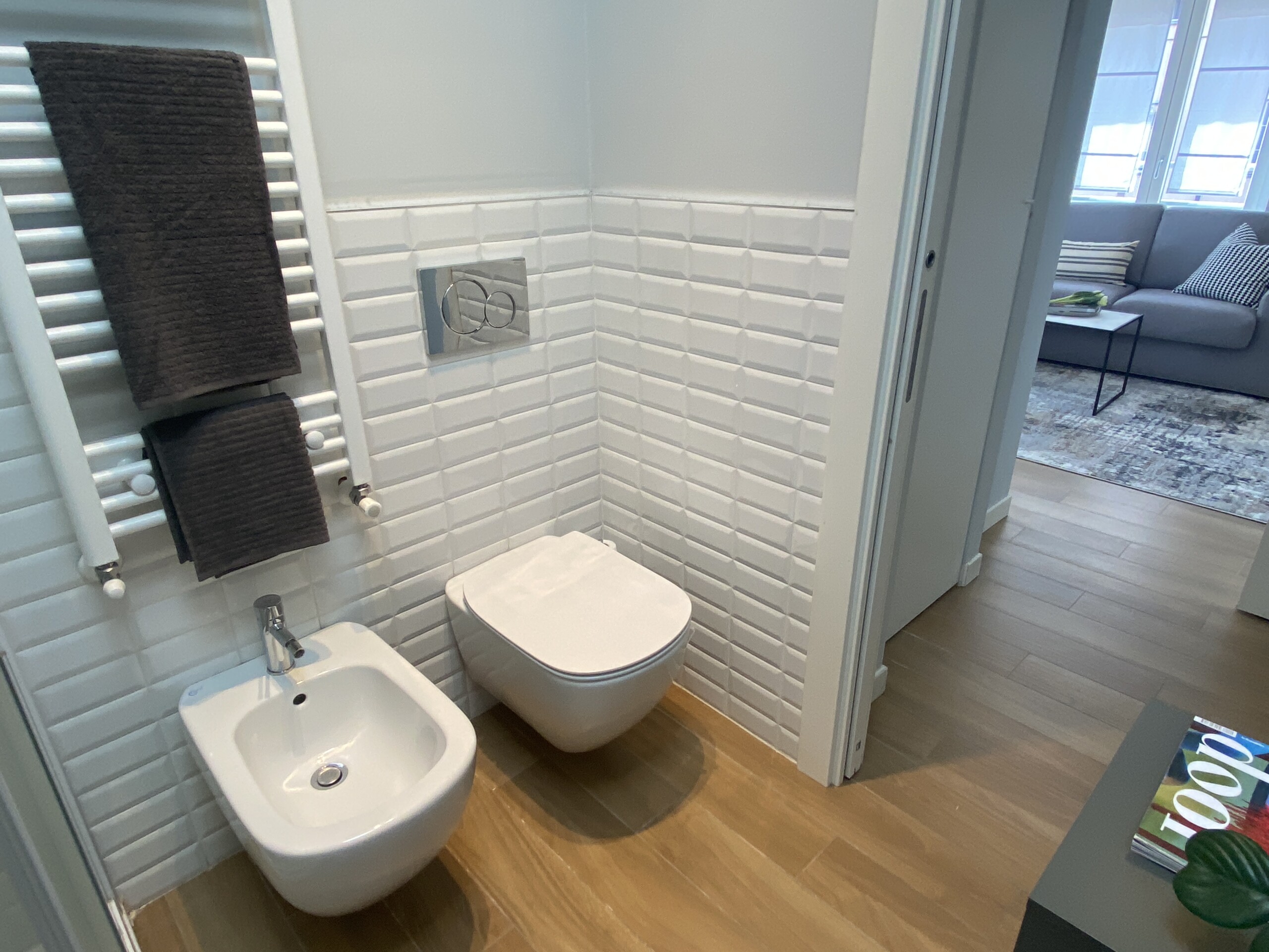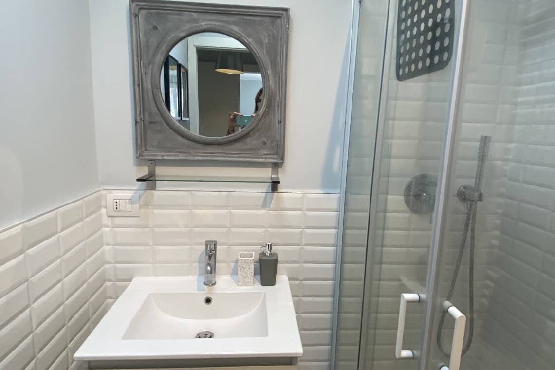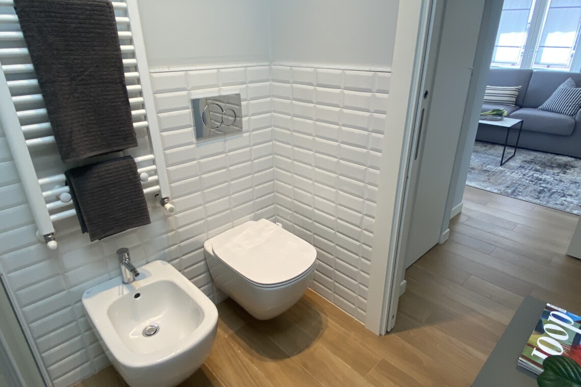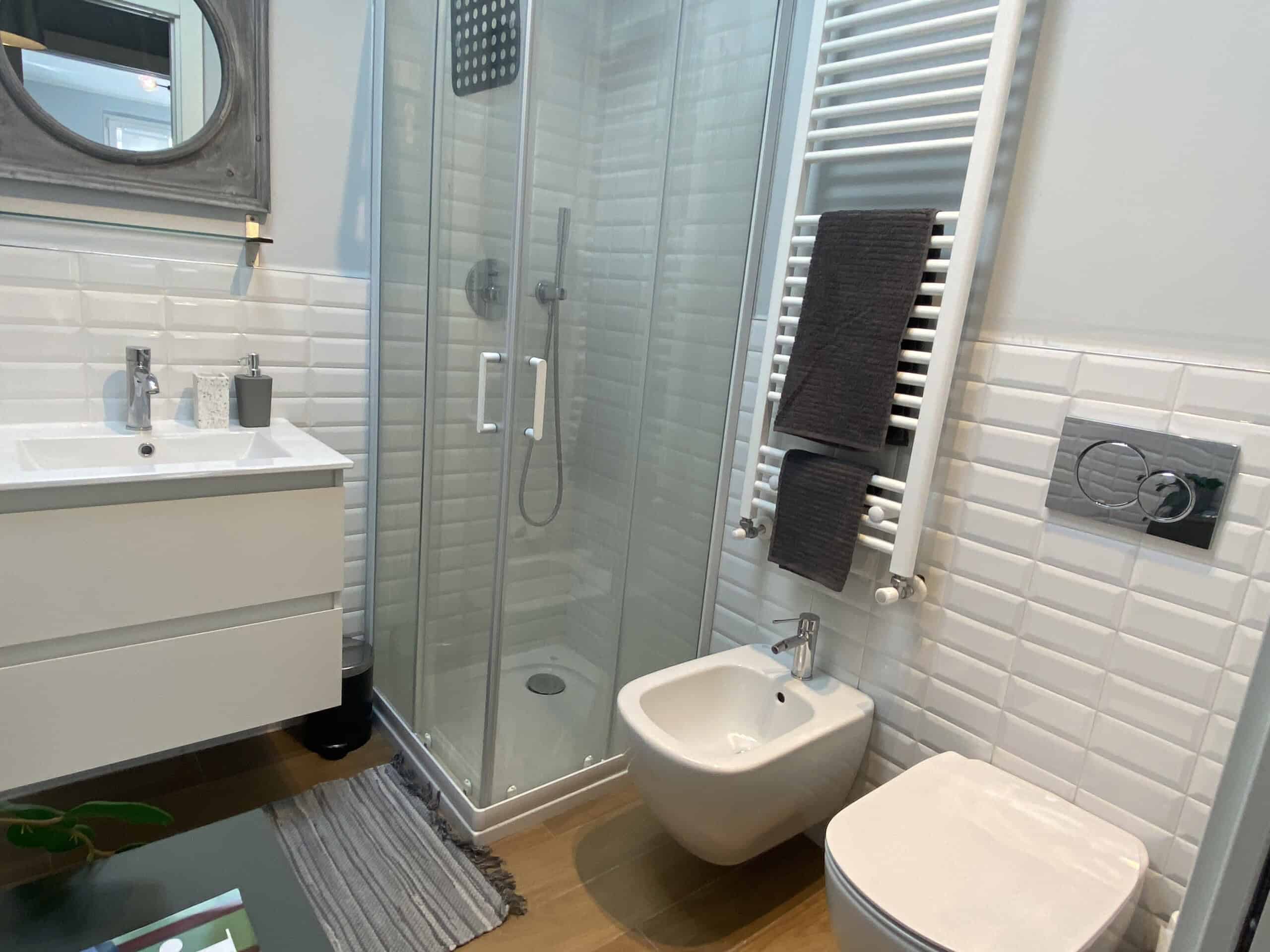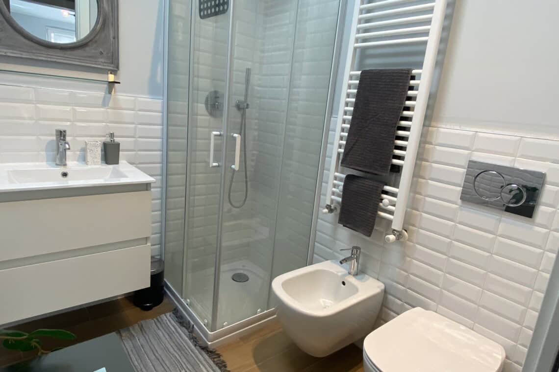 Returning to the entrance, on the left, you will find a modern bathroom equipped with a shower and bidet.