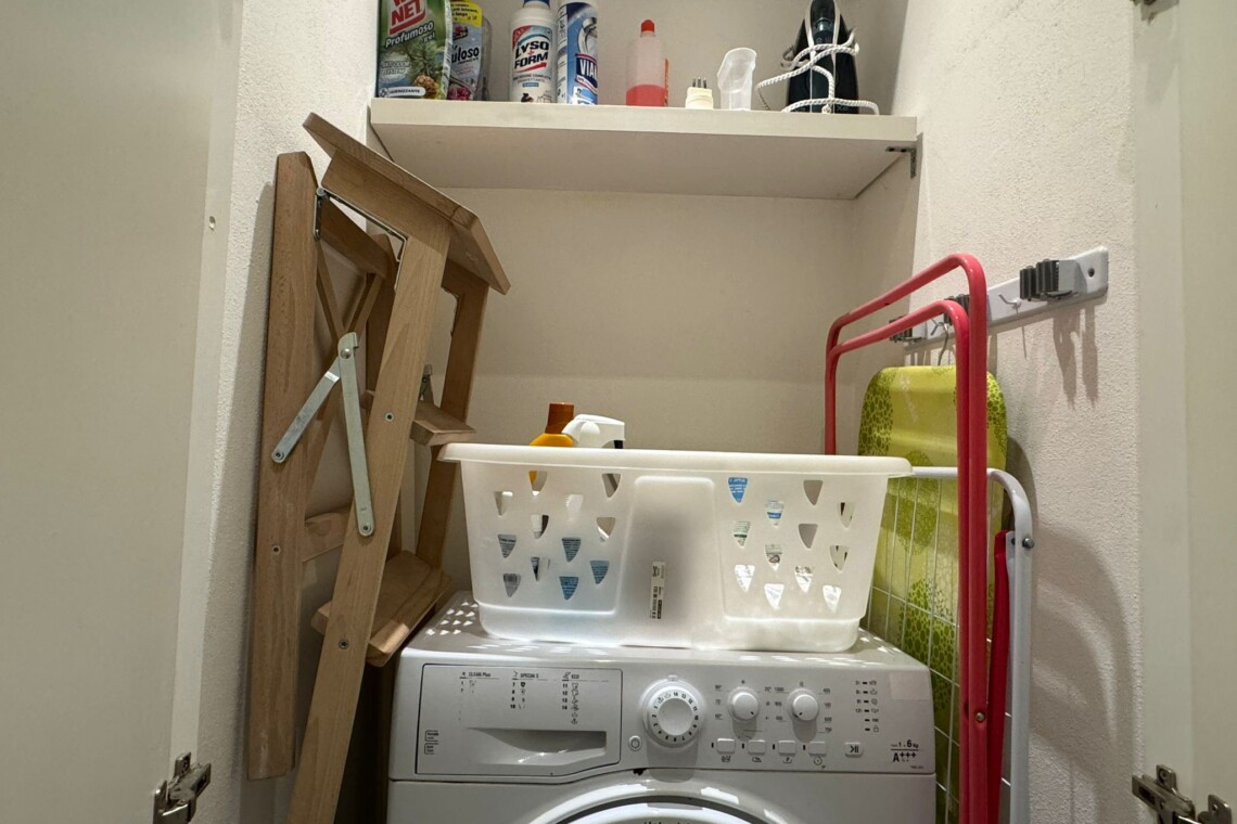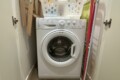 Laundry corner with washing machine and storage.