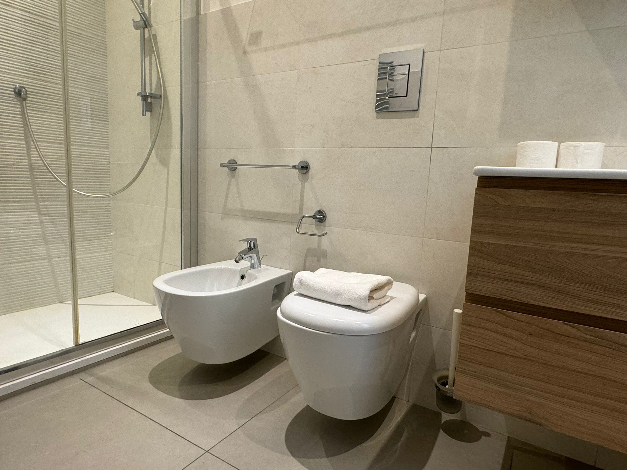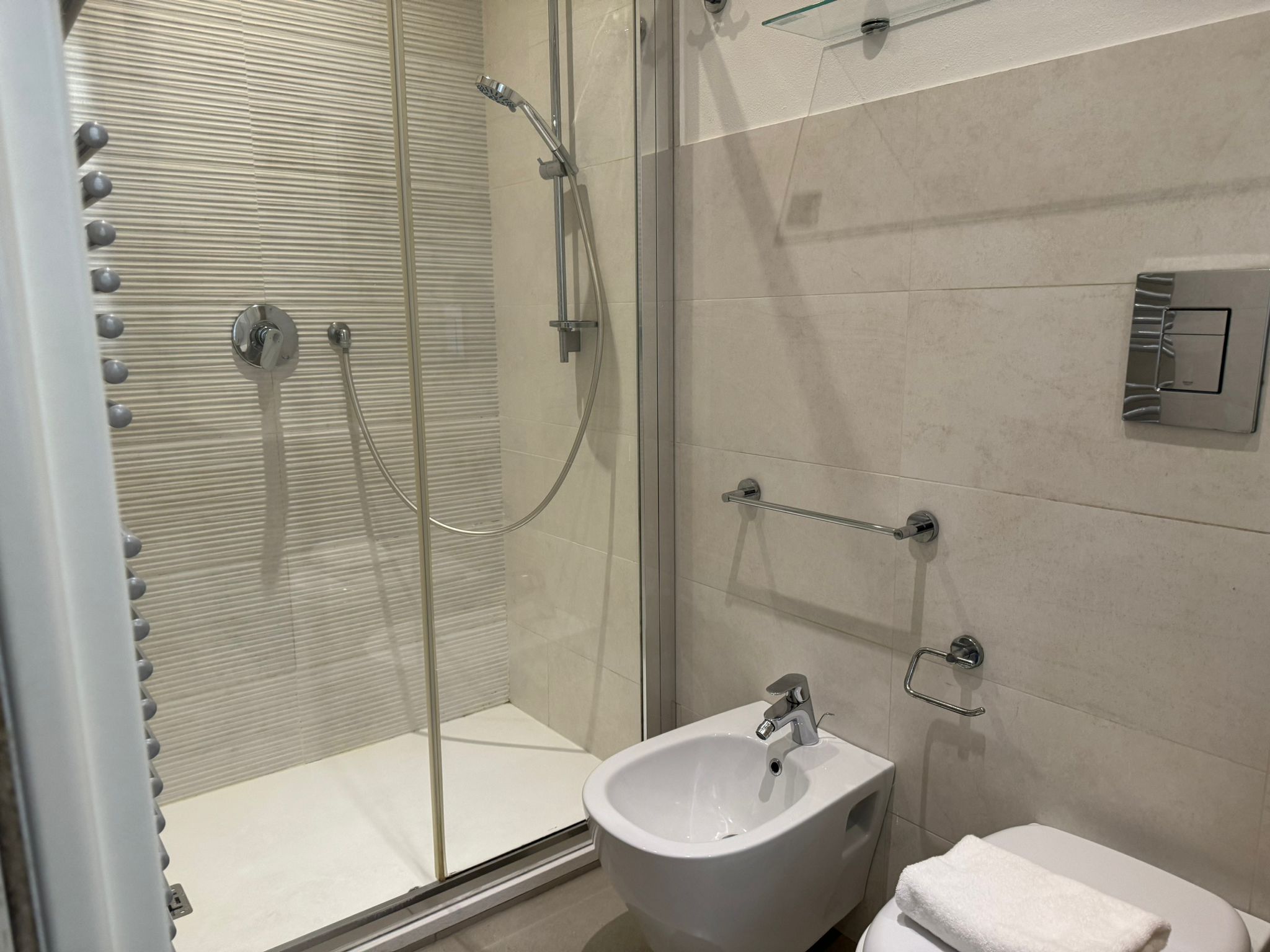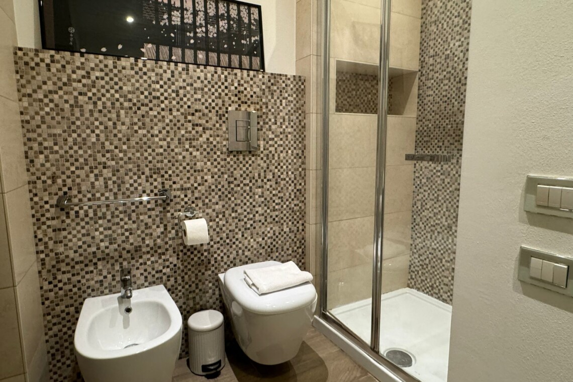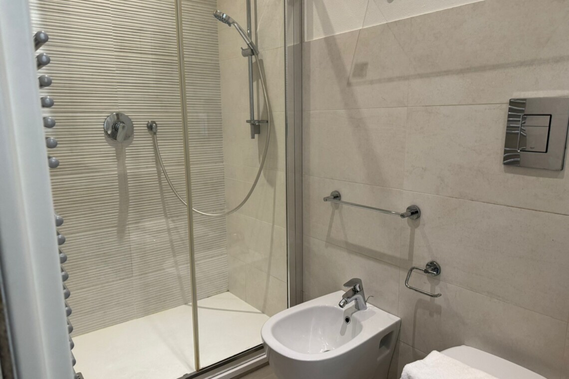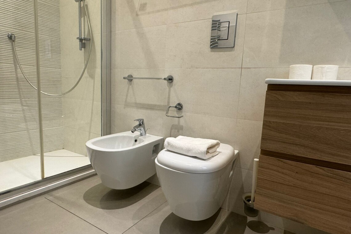 The main bathroom has a large shower, the bidet and a window.