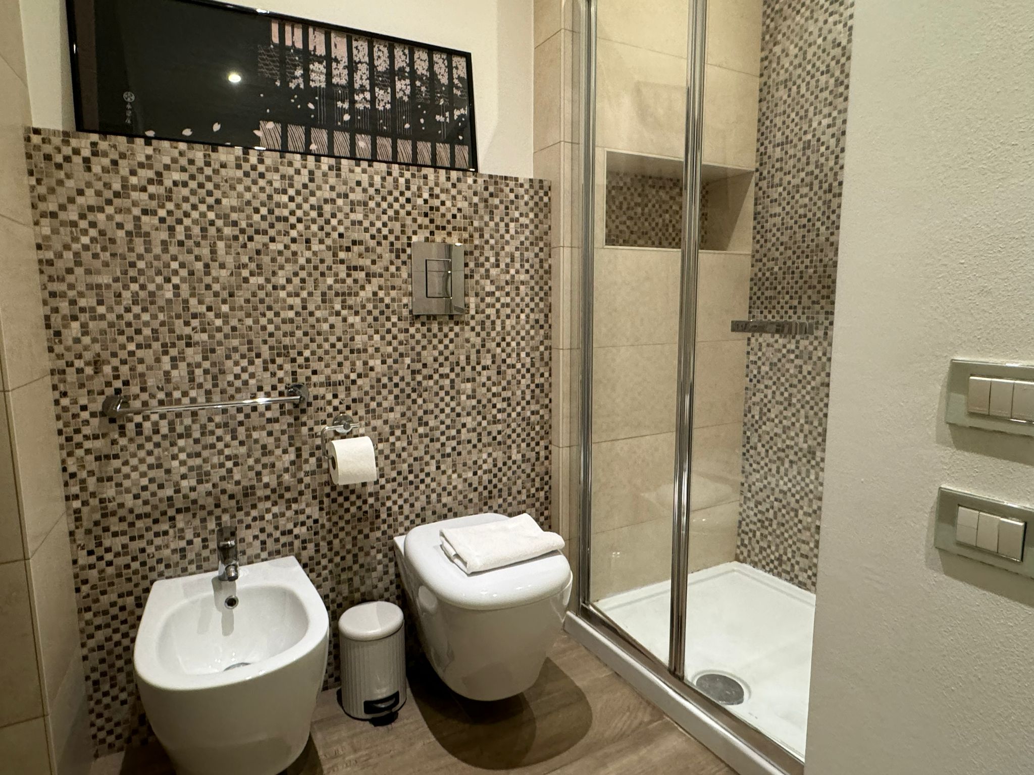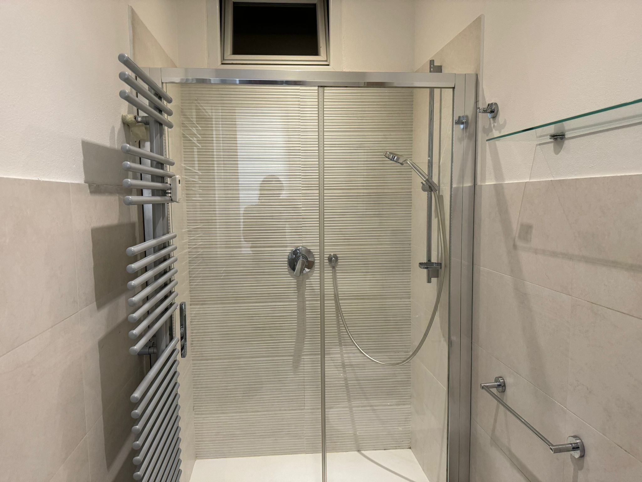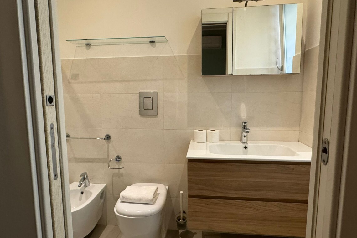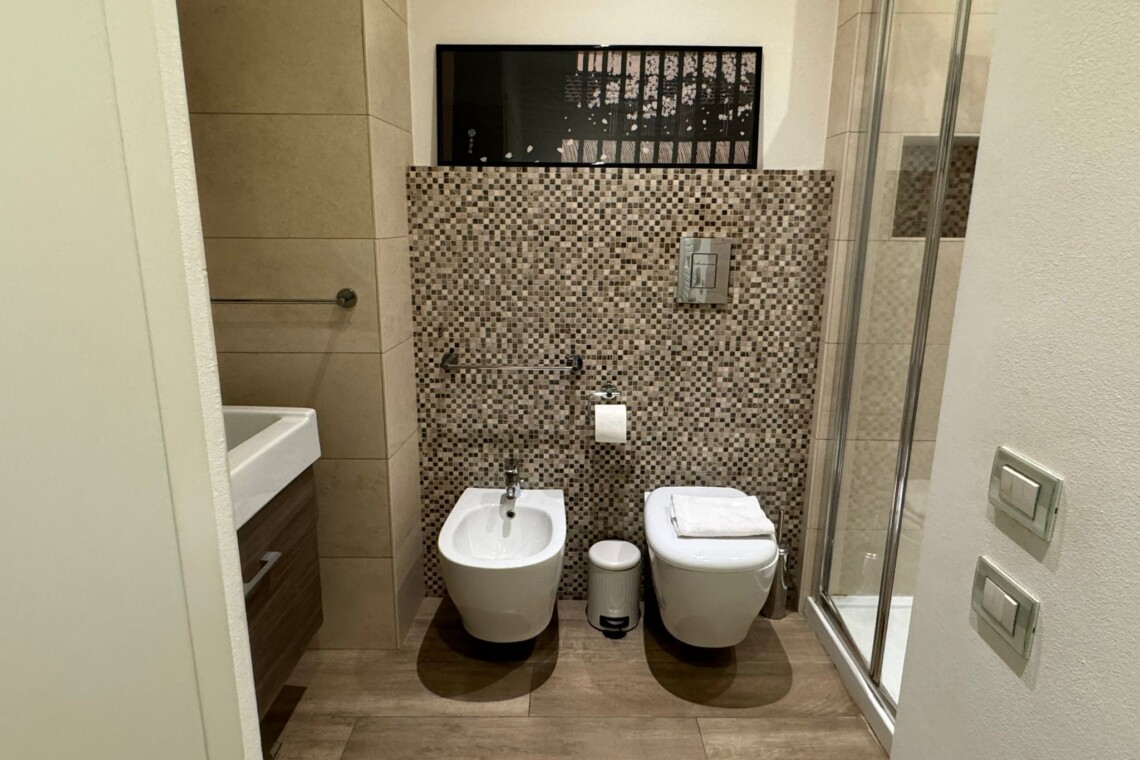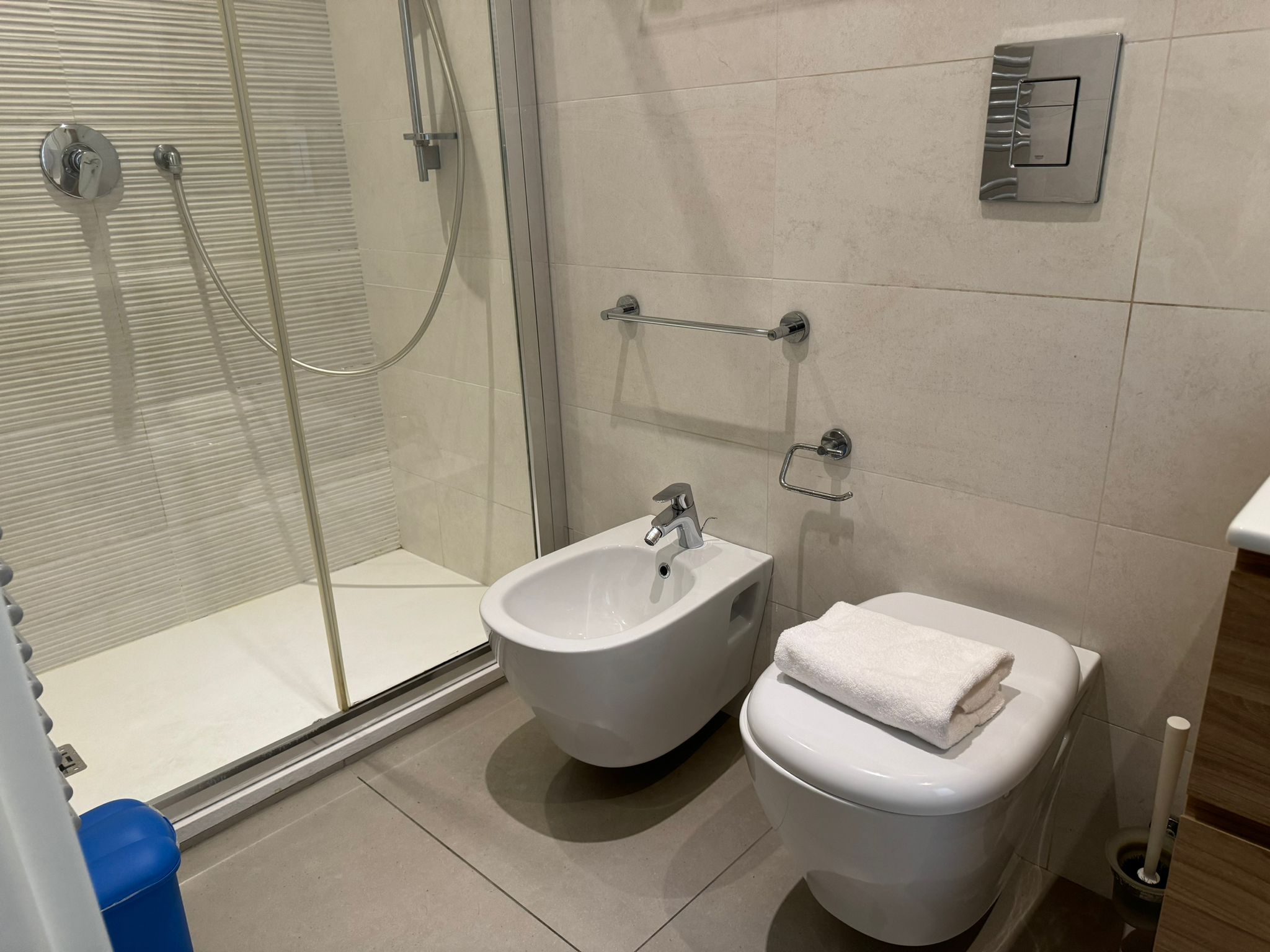 The main bathroom has a large shower, the bidet and a window.