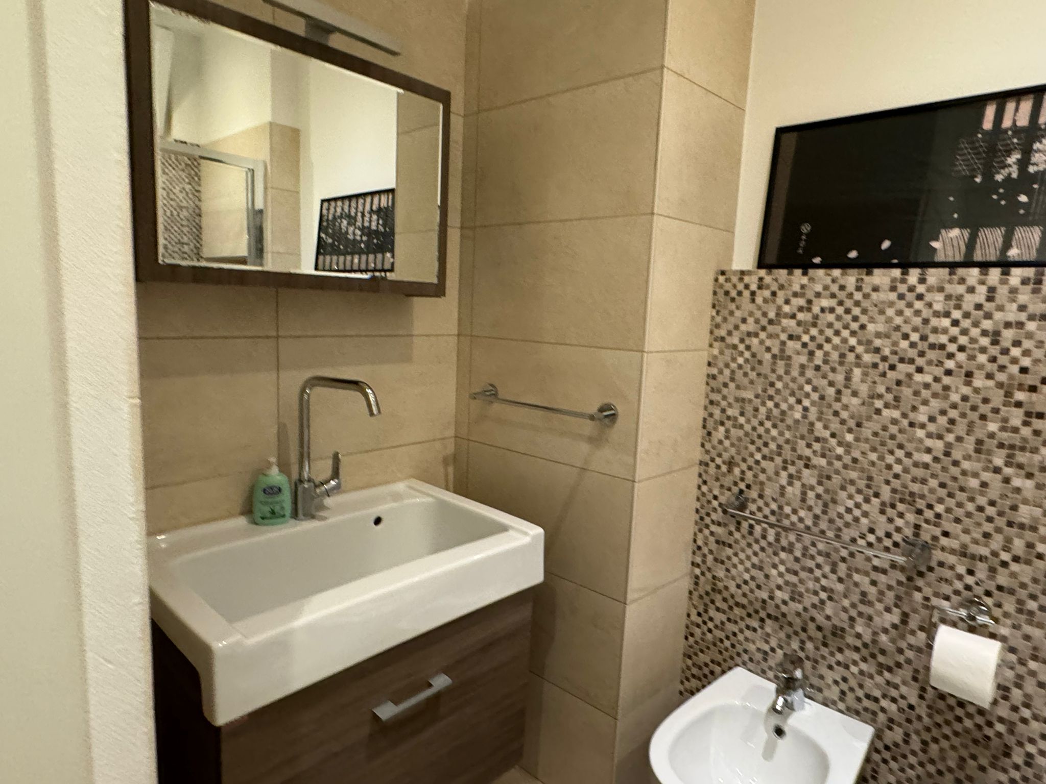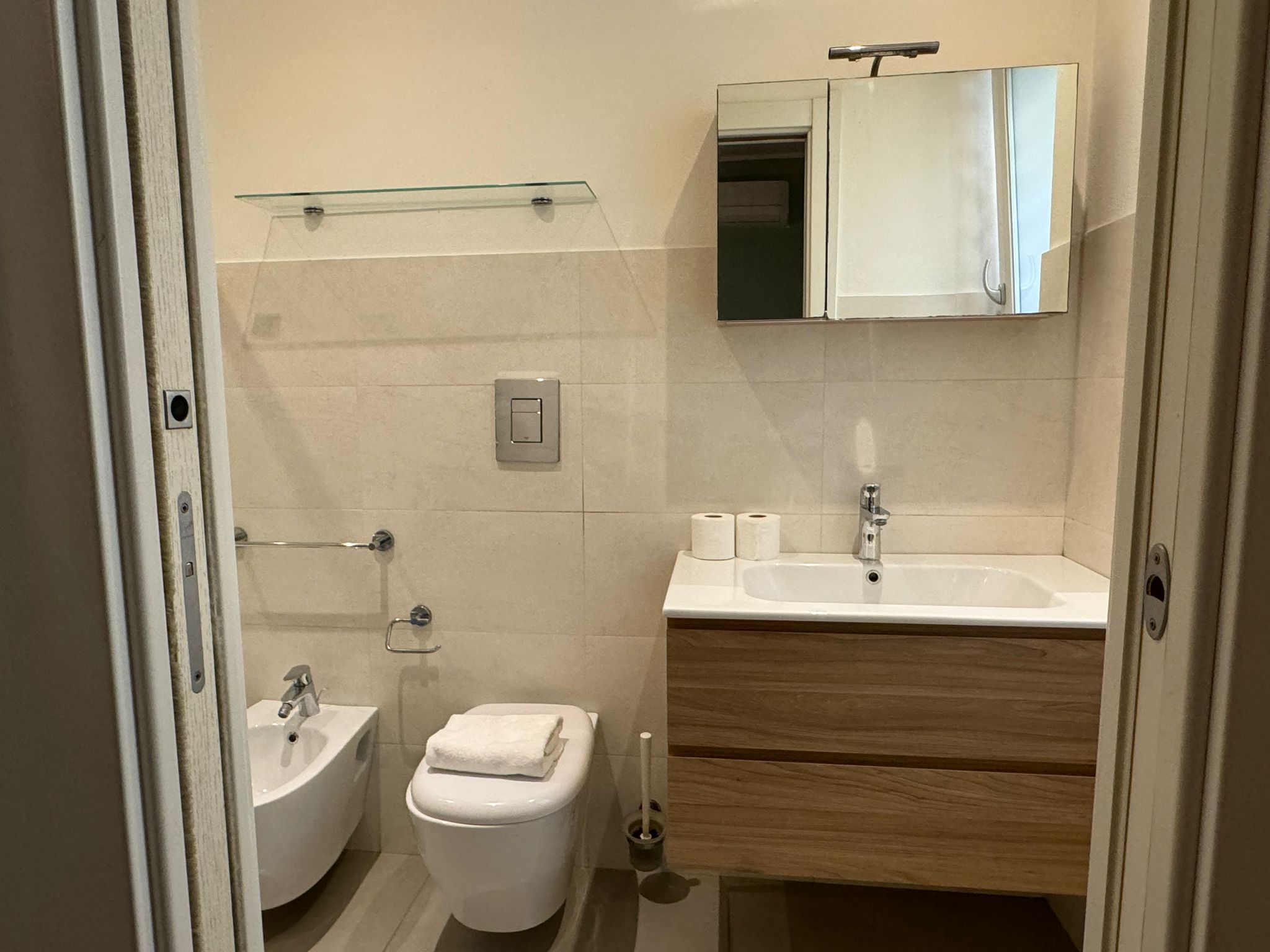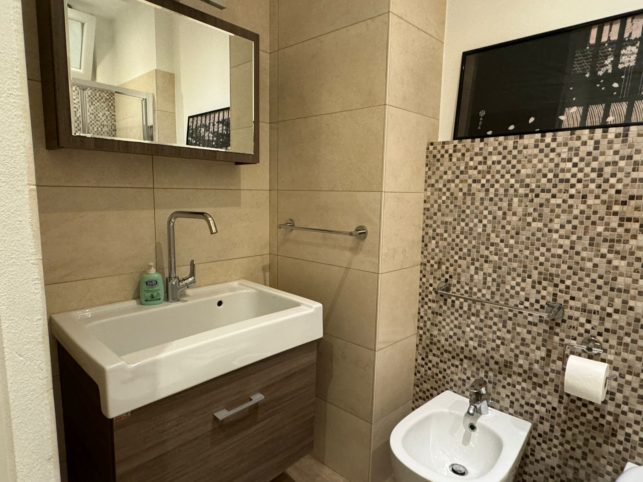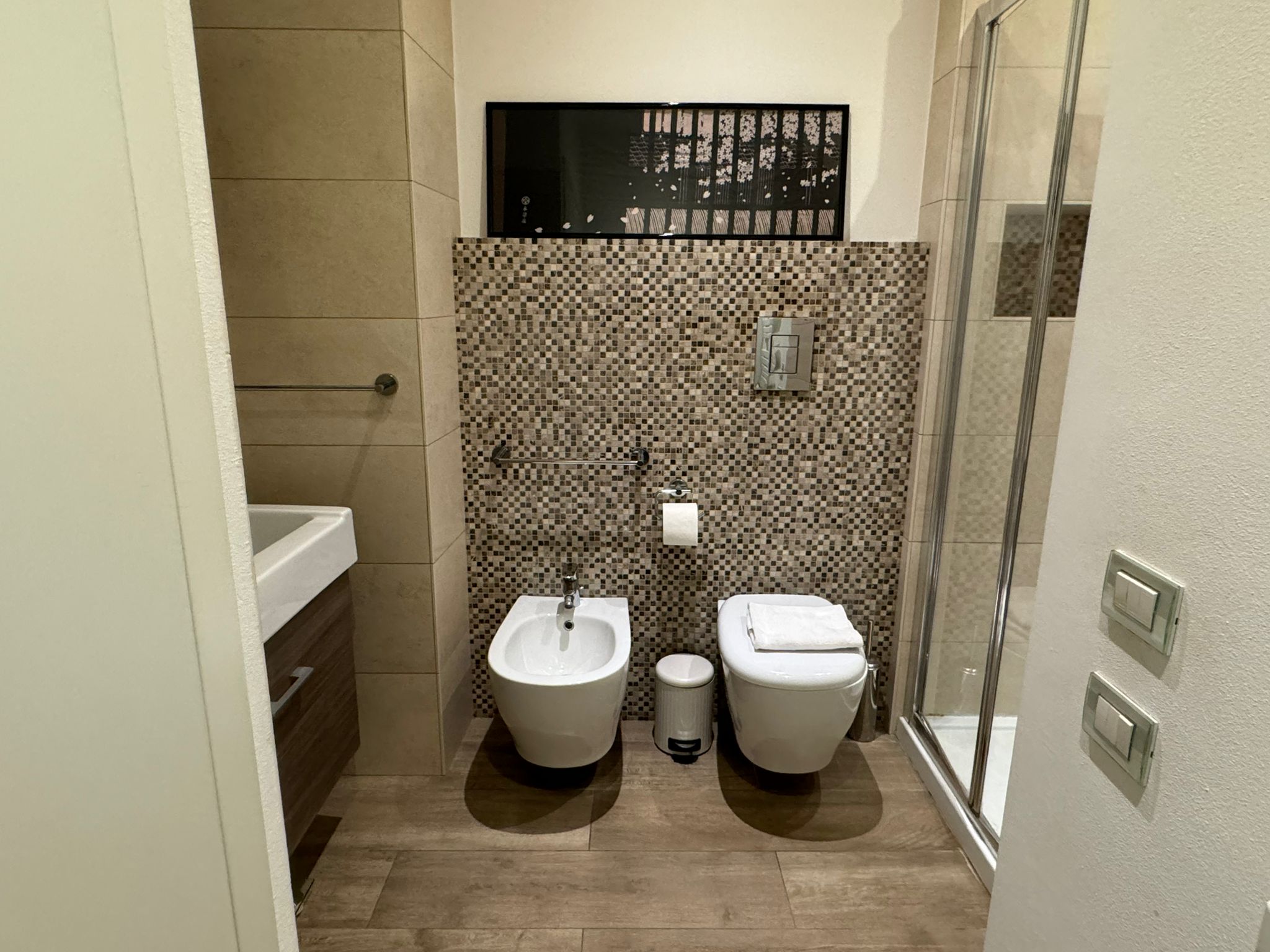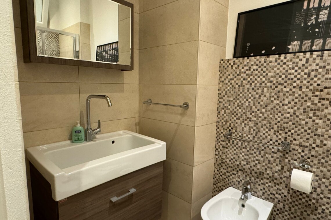 The main bathroom has a large shower, the bidet and a window.