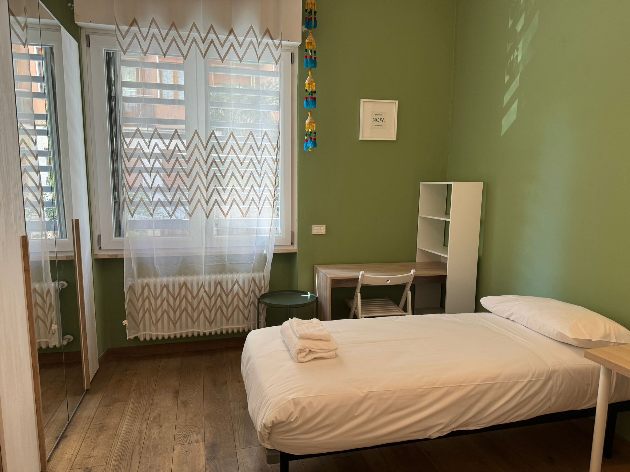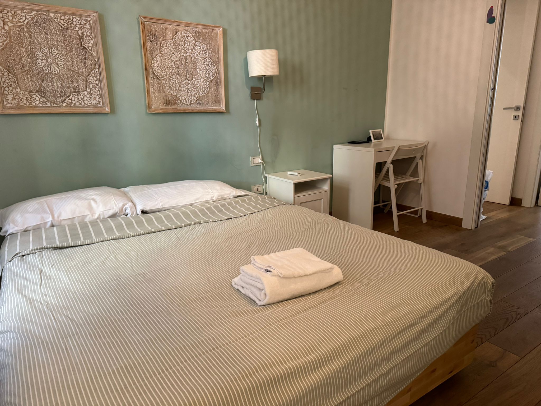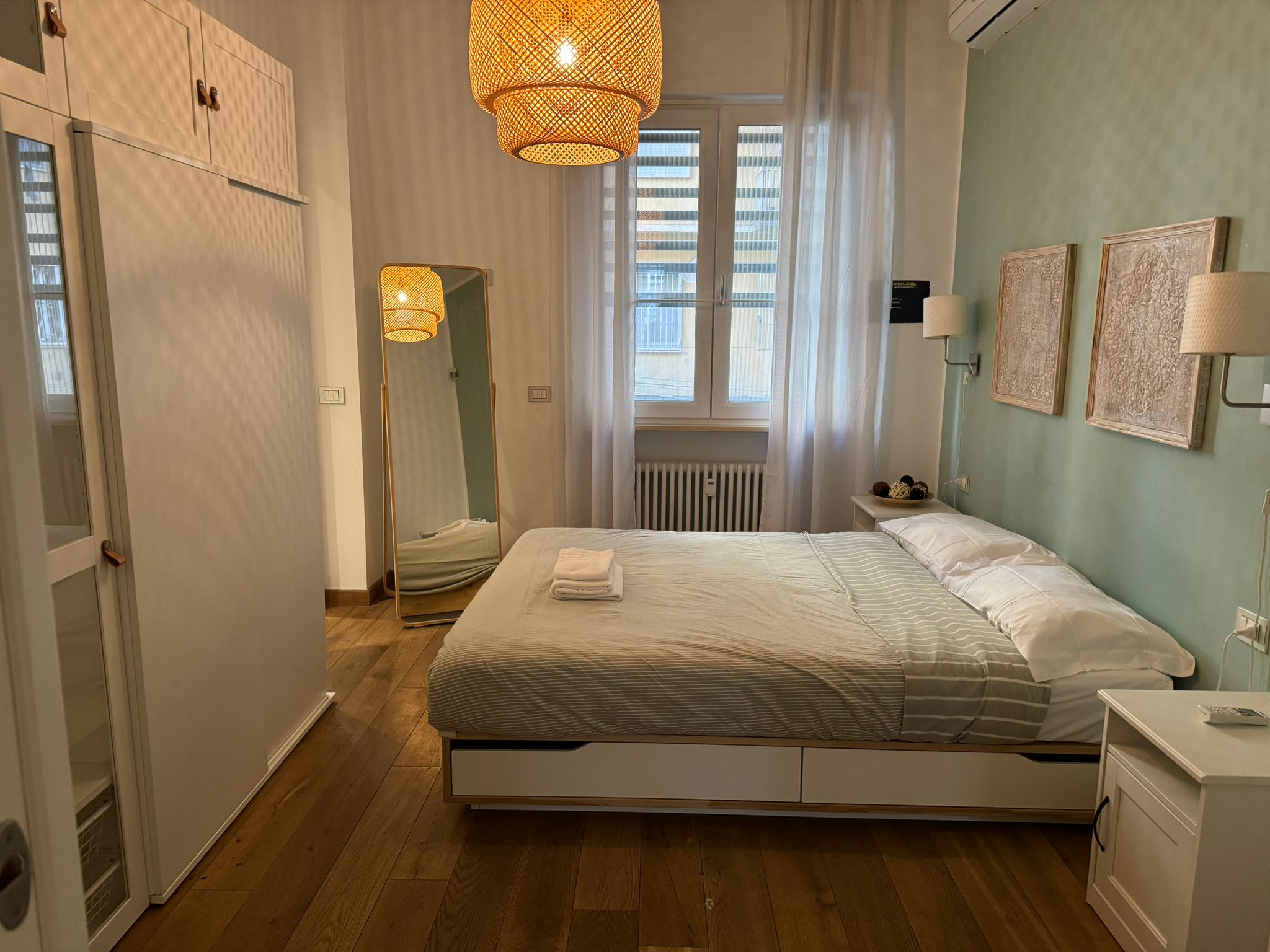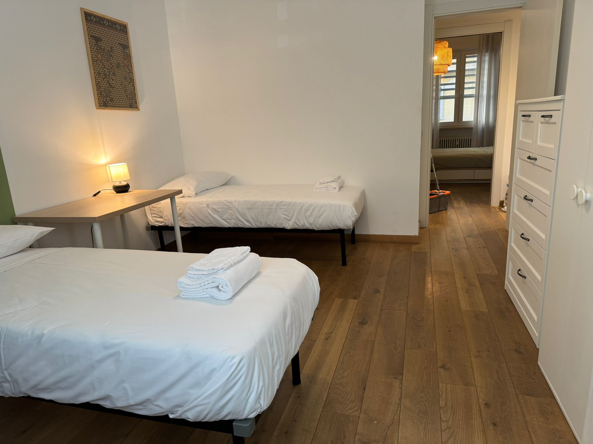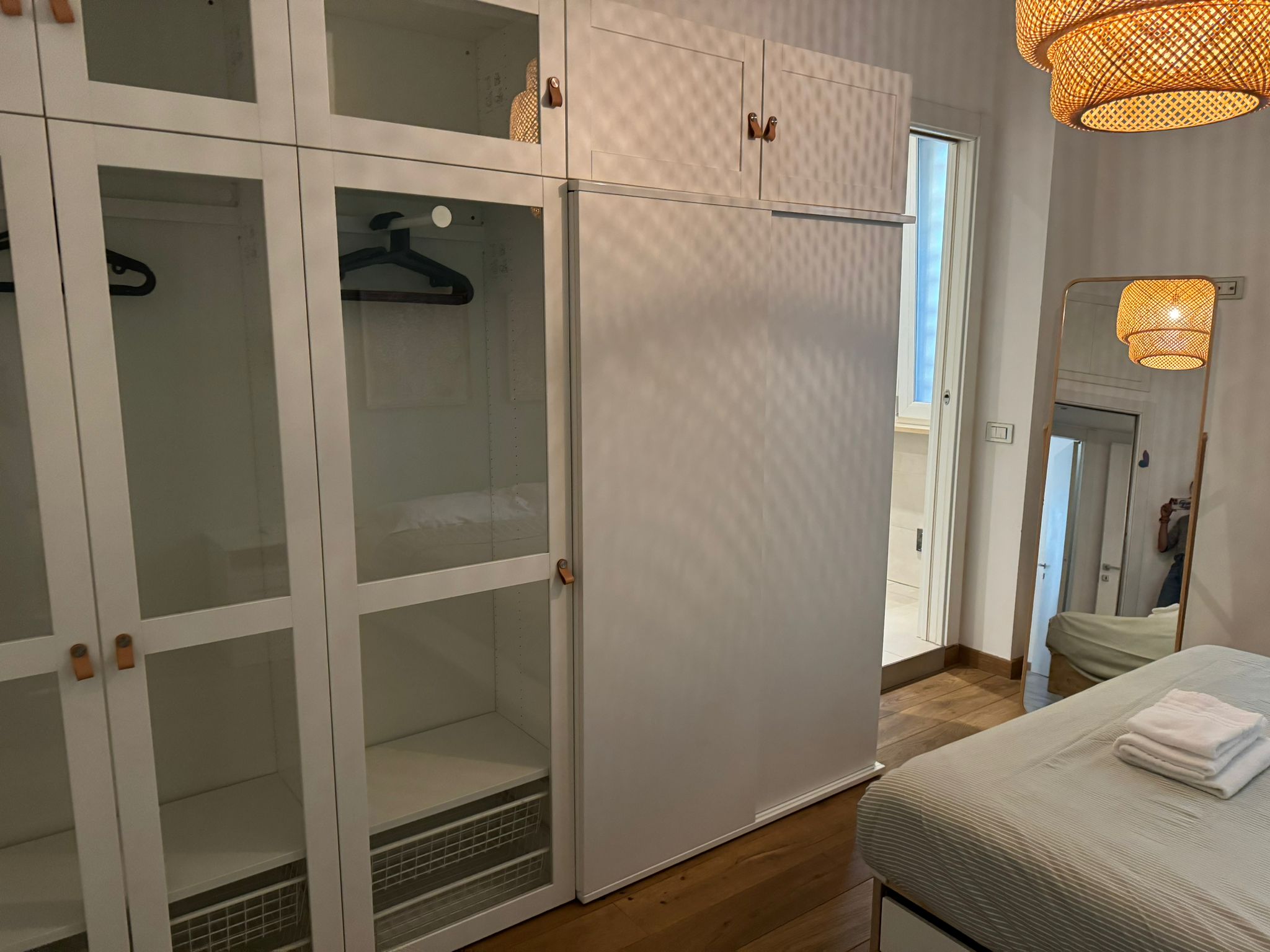 The master bedroom has a double bed, a large wardrobe and a desk.