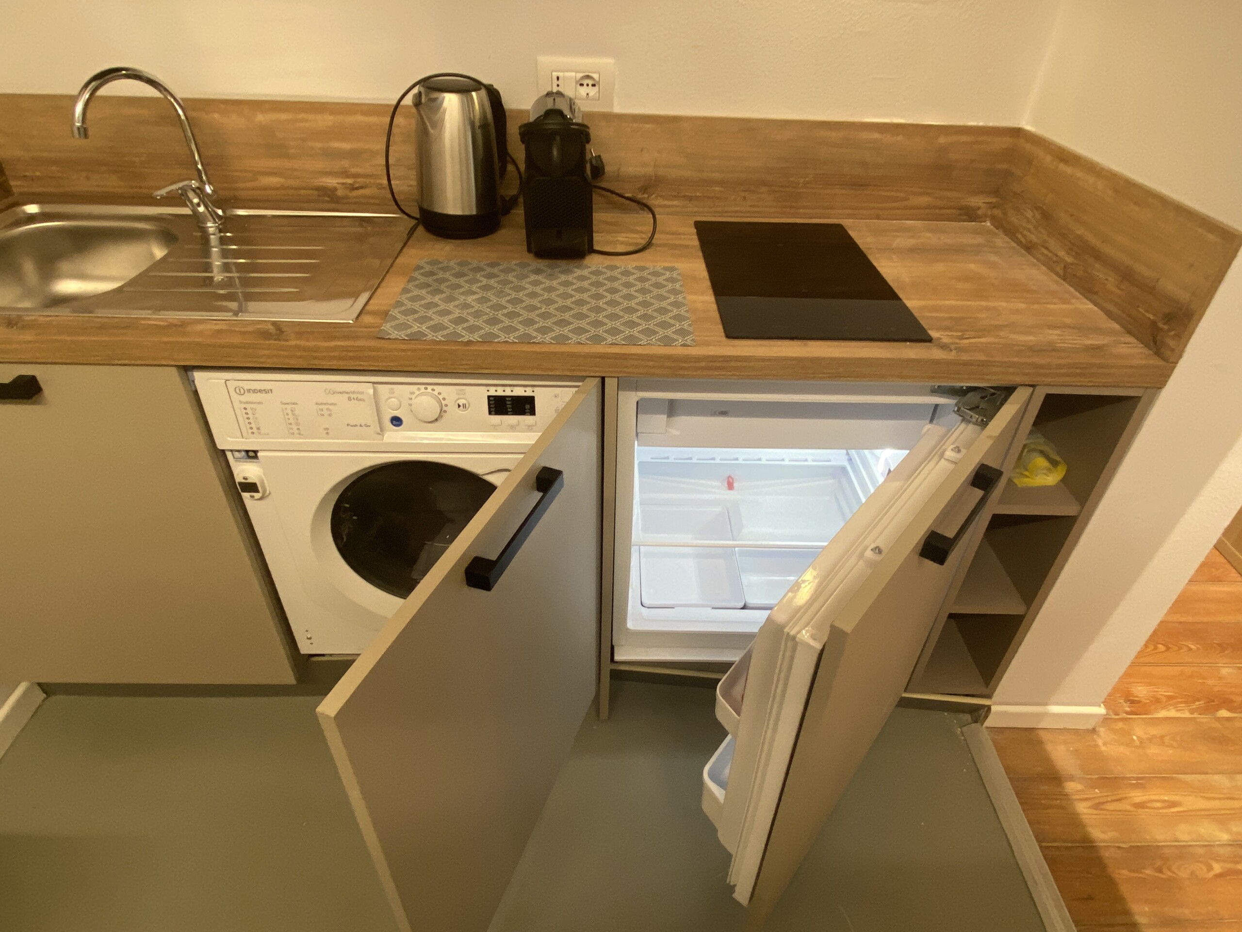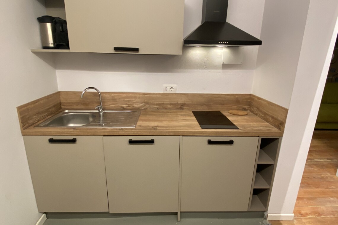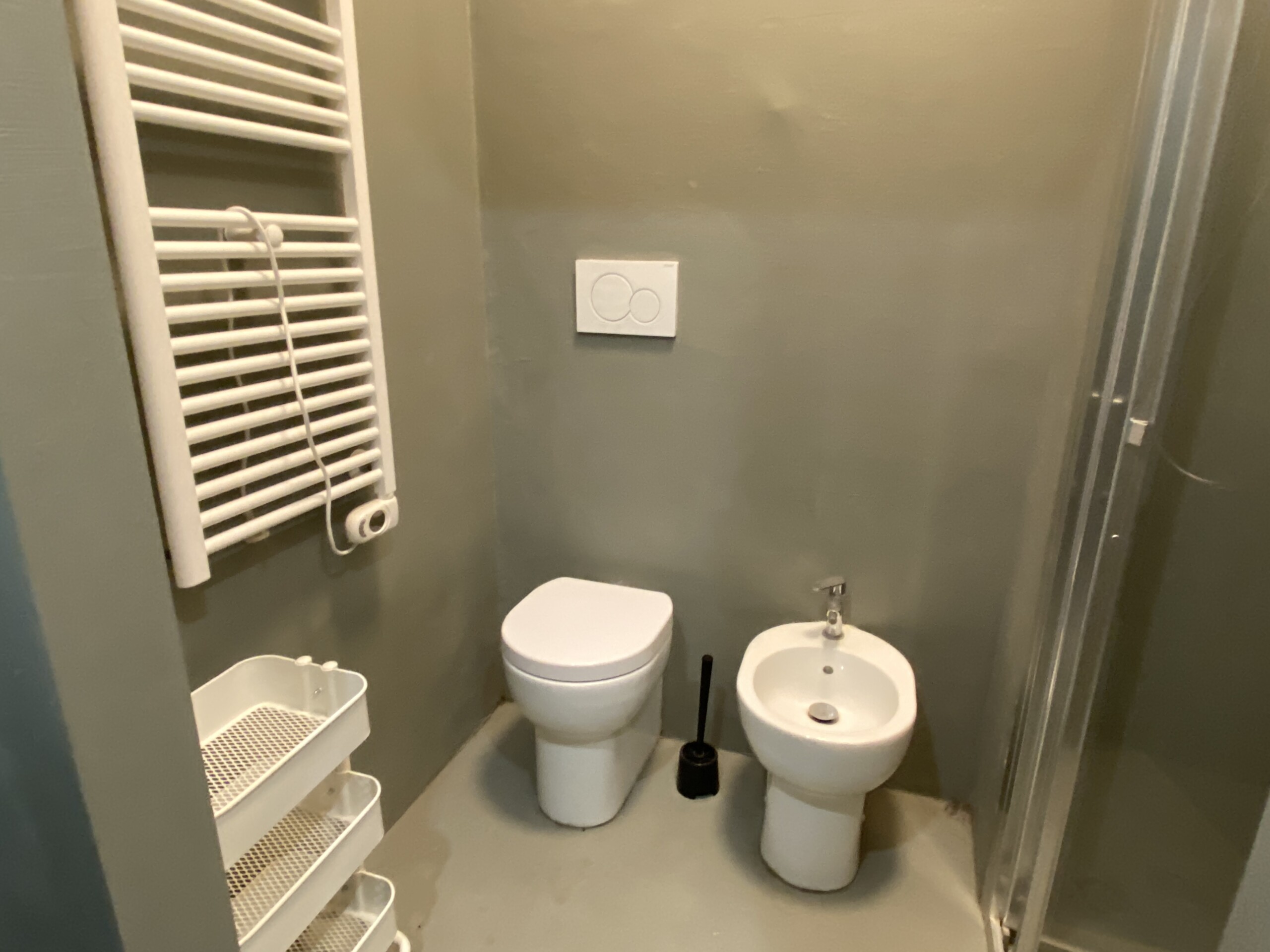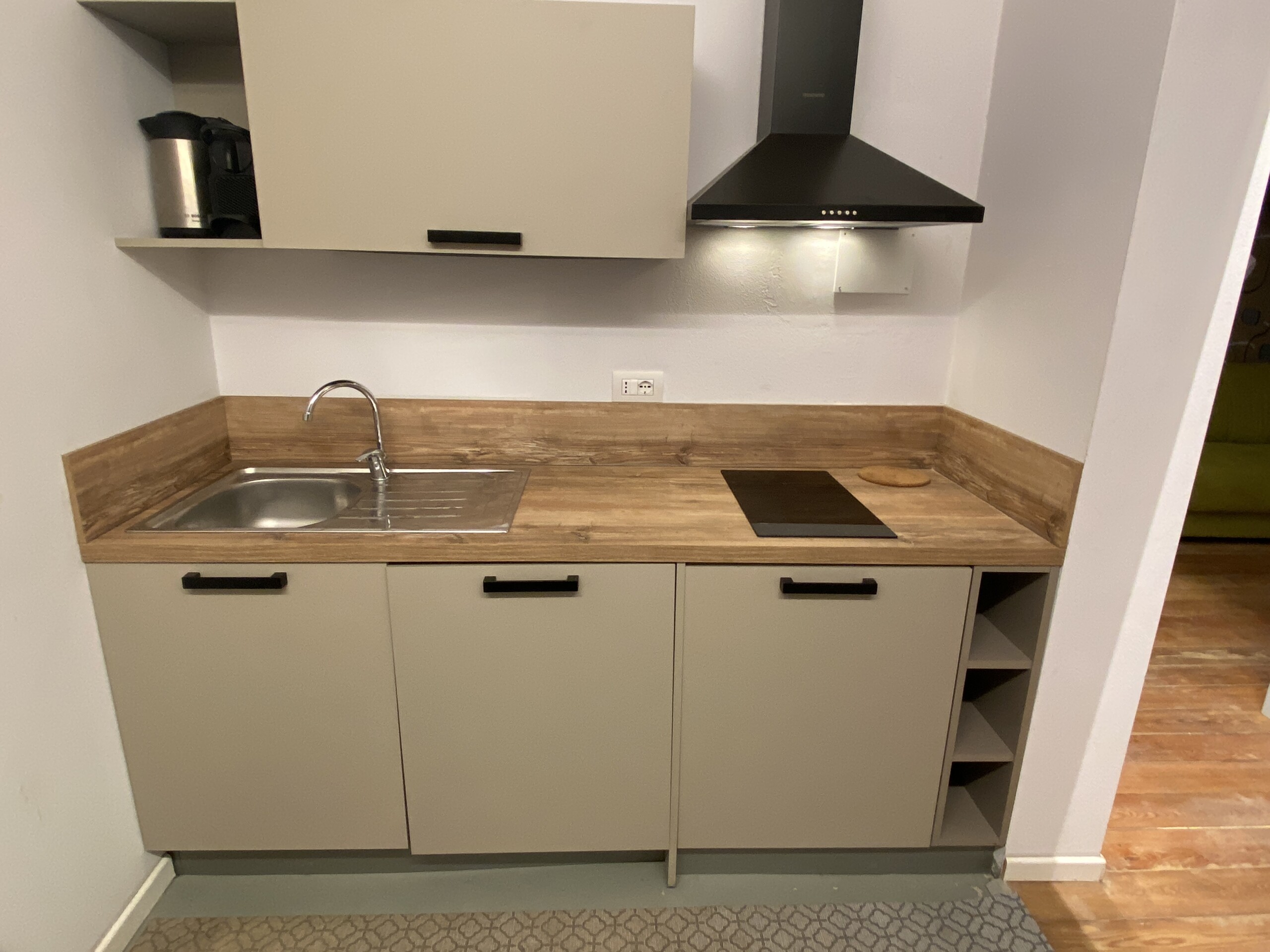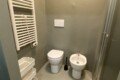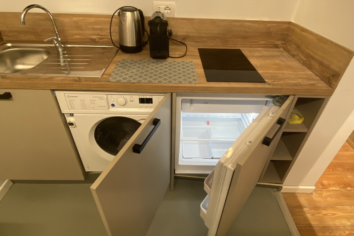 The kitchen is separate and fully equipped, including induction hobs, fridge, freezer, and washing machine. Next to the kitchen entrance, there is the bathroom, fitted with shower, bidet, toilet, and sink, all finished in a clean and modern style.