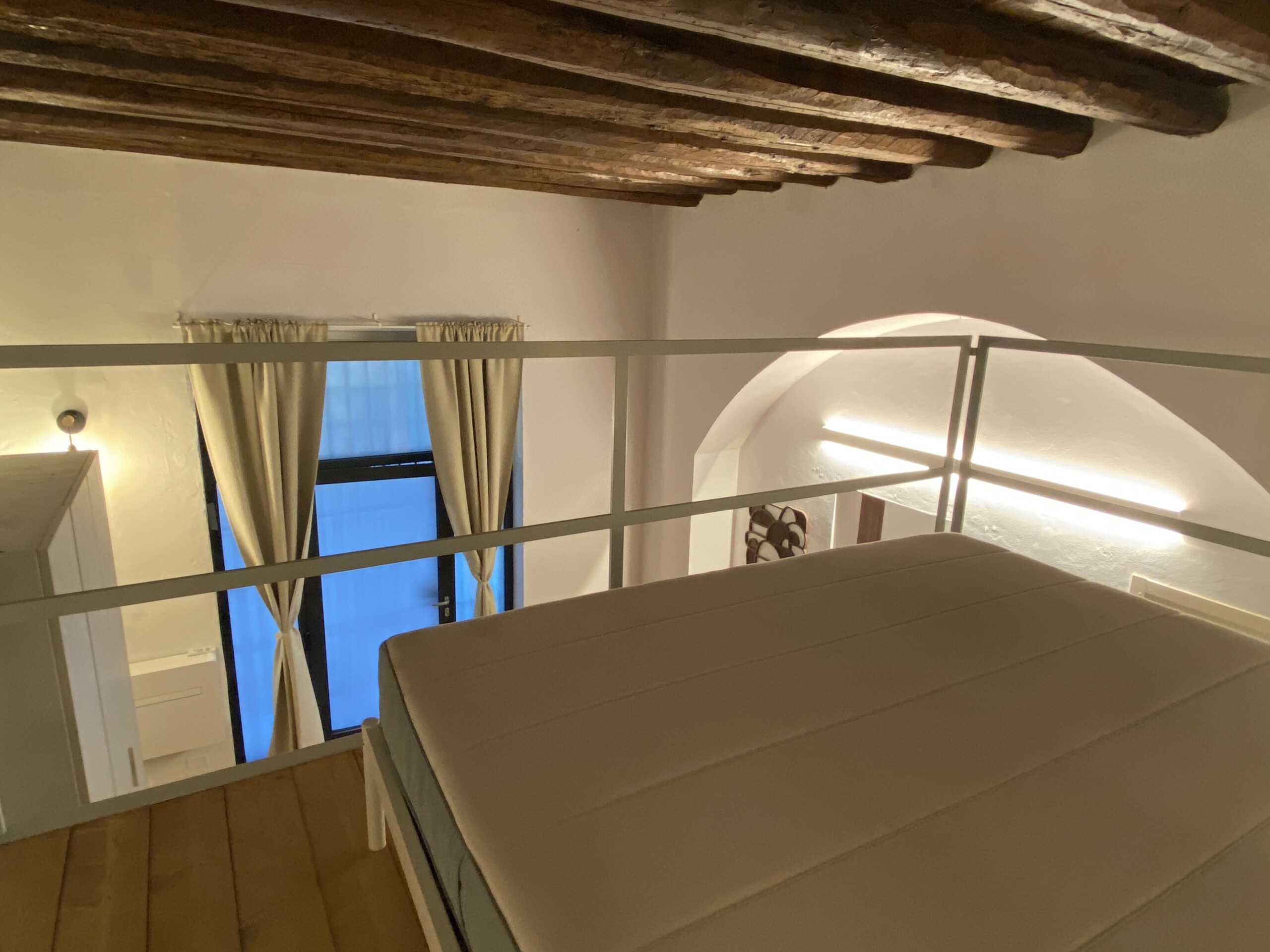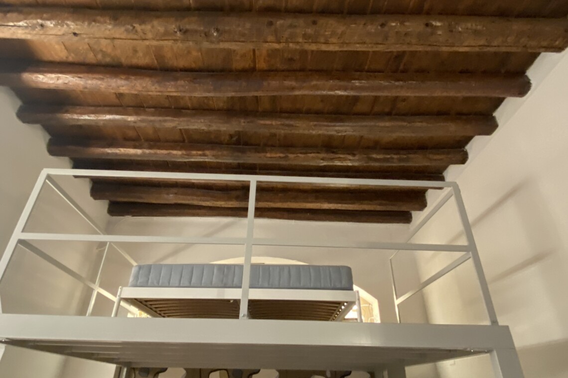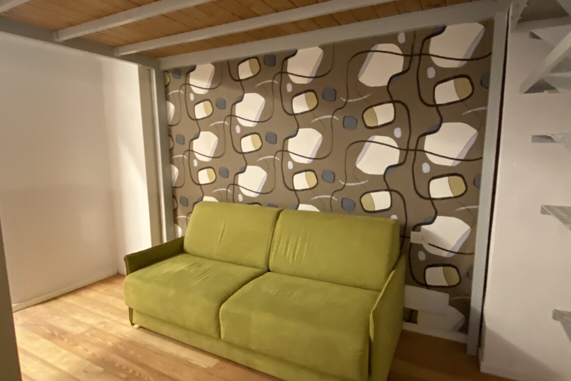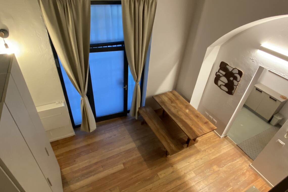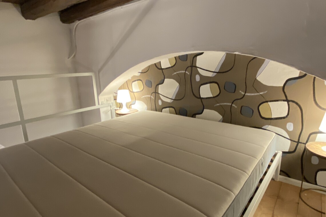 Above the living area, a charming mezzanine level hosts the sleeping area, featuring a double bed and bedside tables. Please note that the height of the loft sleeping area is approximately 1.60 meters. The loft stands out for its character, with a lovely arched detail that preserves the original style of the building, adding warmth and personality to the space. The lighting has been carefully designed throughout the apartment, enhancing both the modern renovation and the architectural features.