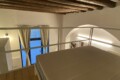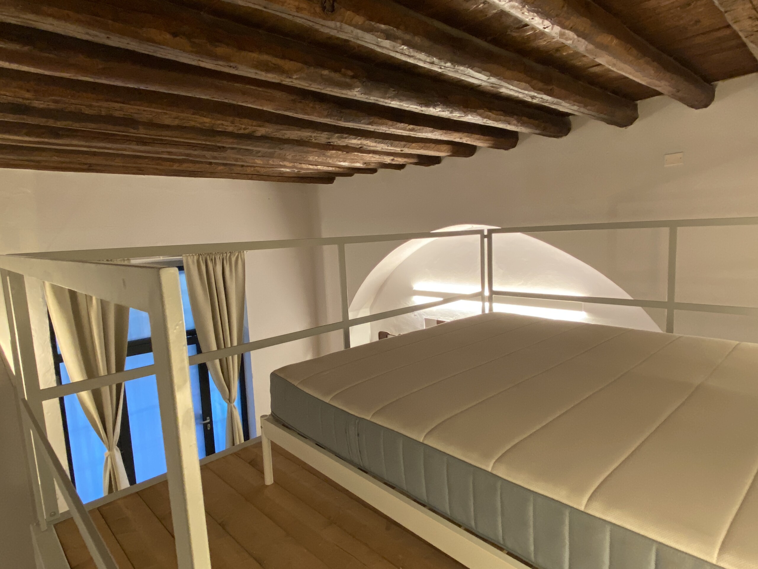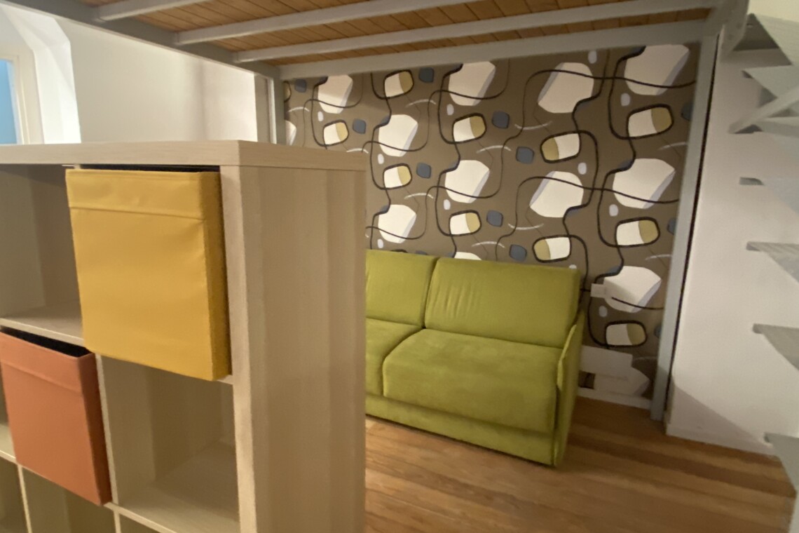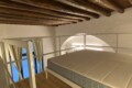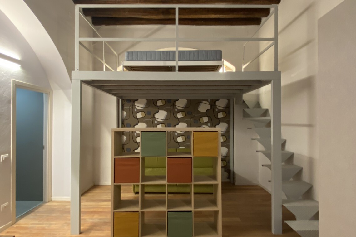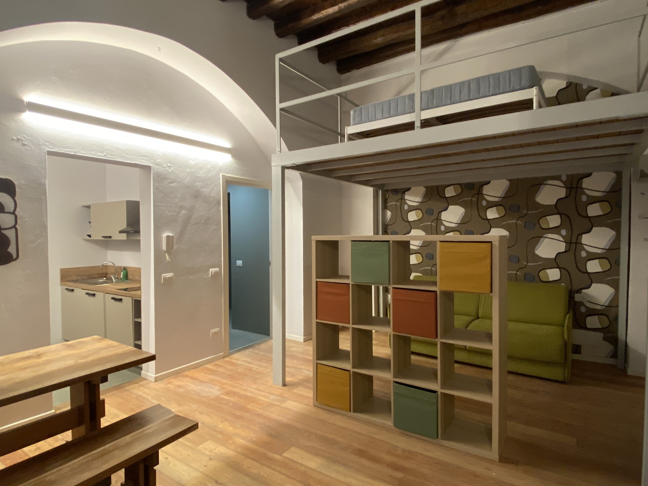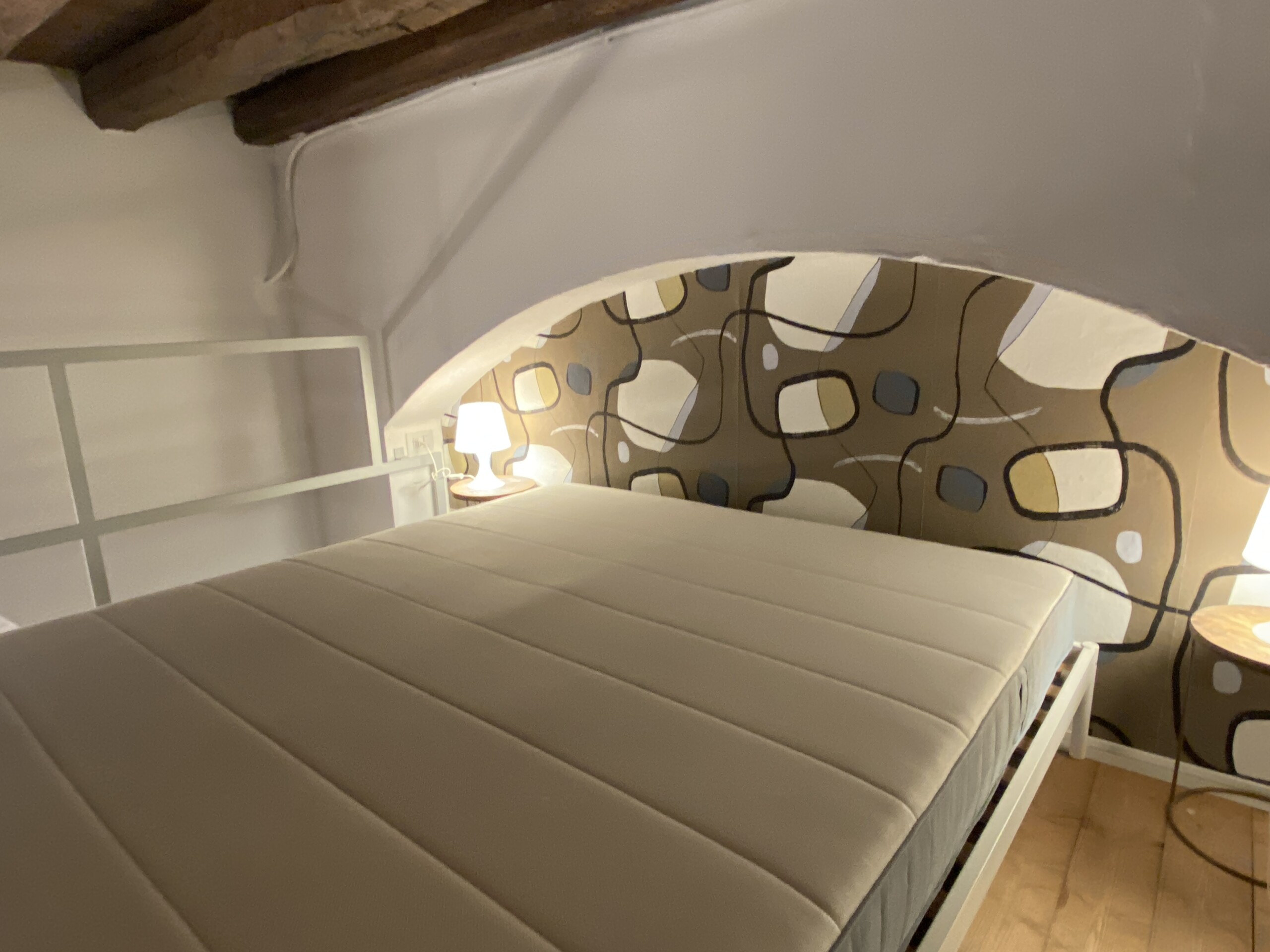 Above the living area, a charming mezzanine level hosts the sleeping area, featuring a double bed and bedside tables. Please note that the height of the loft sleeping area is approximately 1.60 meters. The loft stands out for its character, with a lovely arched detail that preserves the original style of the building, adding warmth and personality to the space. The lighting has been carefully designed throughout the apartment, enhancing both the modern renovation and the architectural features.