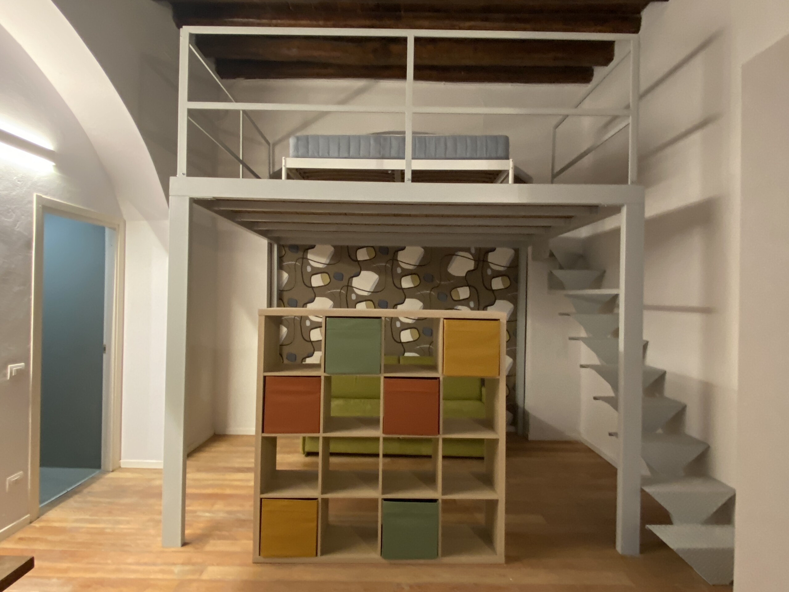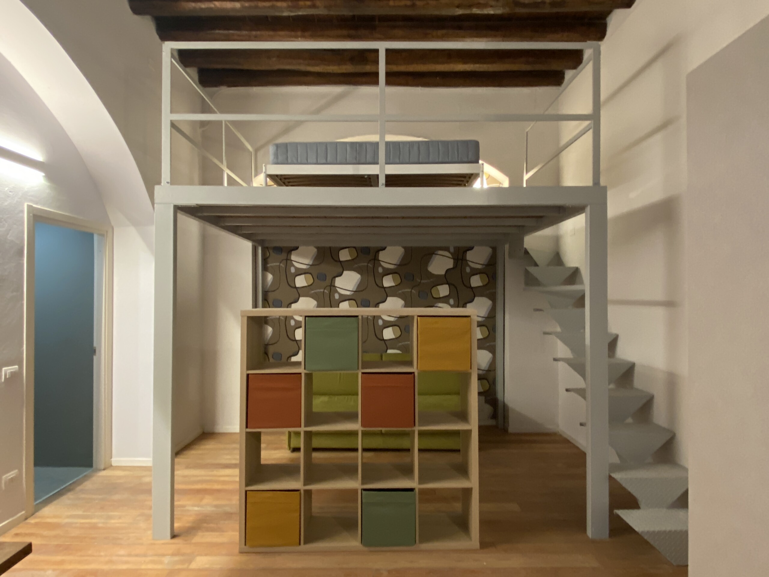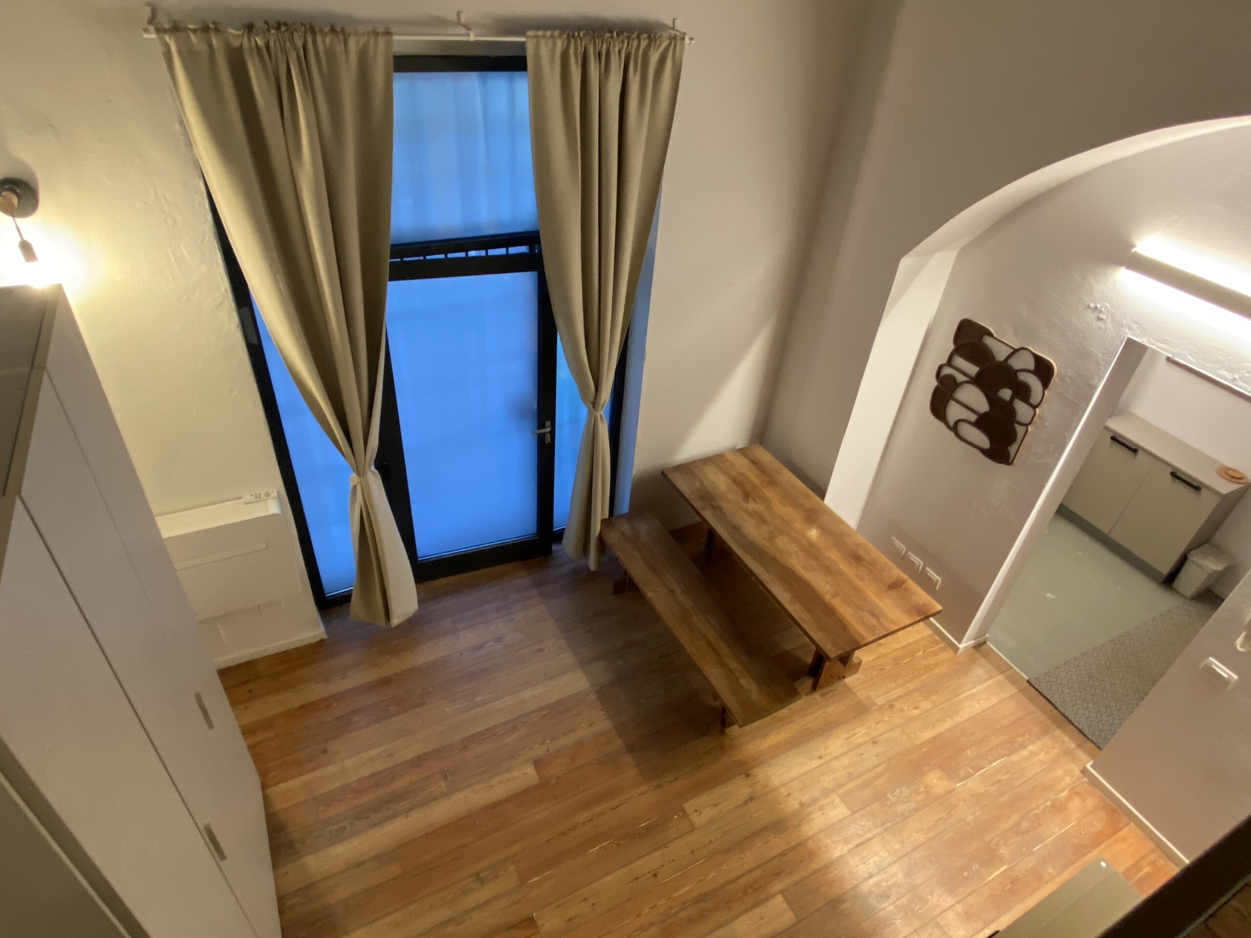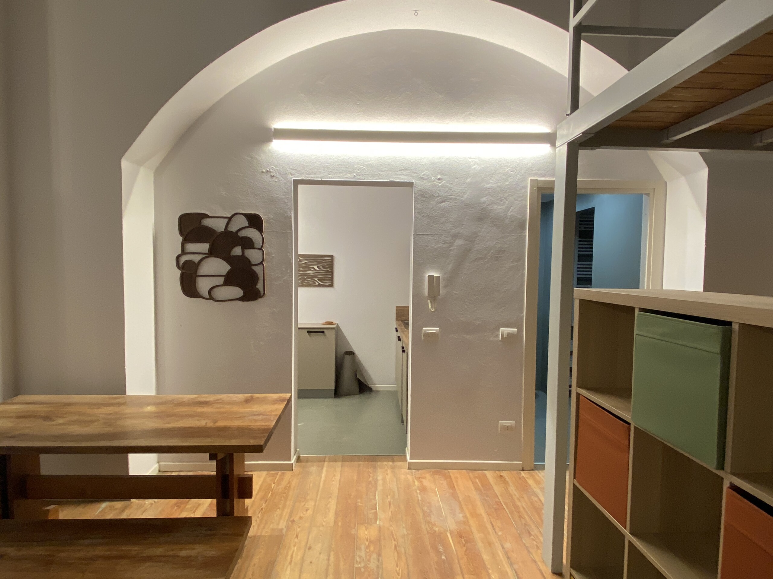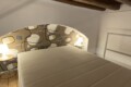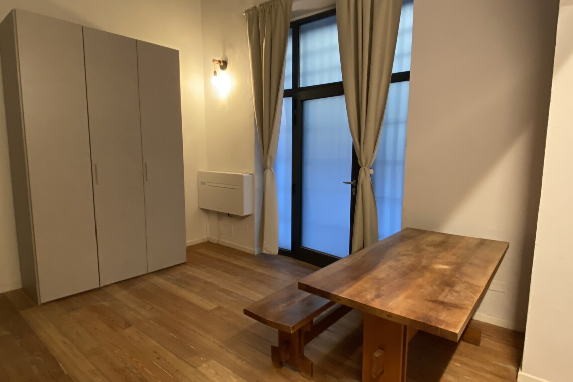 Above the living area, a charming mezzanine level hosts the sleeping area, featuring a double bed and bedside tables. Please note that the height of the loft sleeping area is approximately 1.60 meters. The loft stands out for its character, with a lovely arched detail that preserves the original style of the building, adding warmth and personality to the space. The lighting has been carefully designed throughout the apartment, enhancing both the modern renovation and the architectural features.