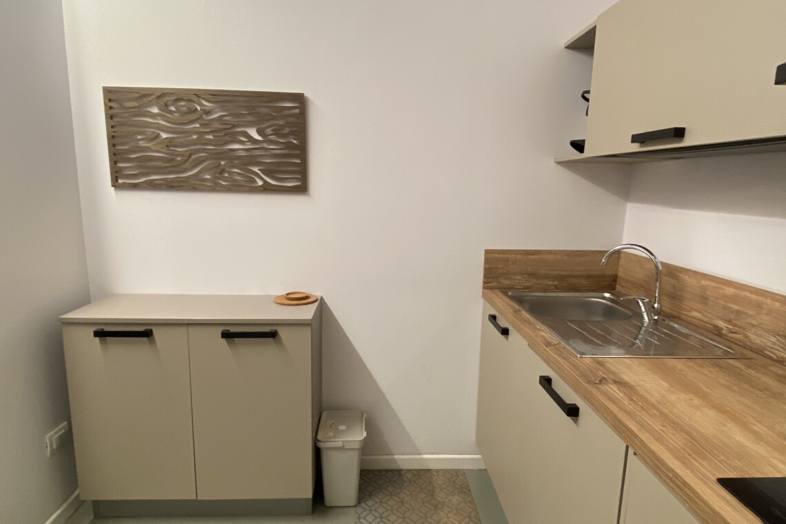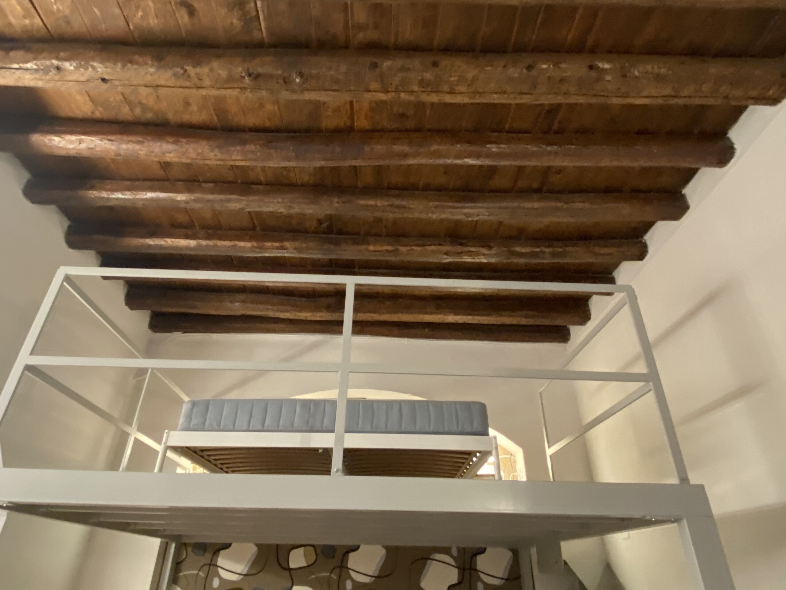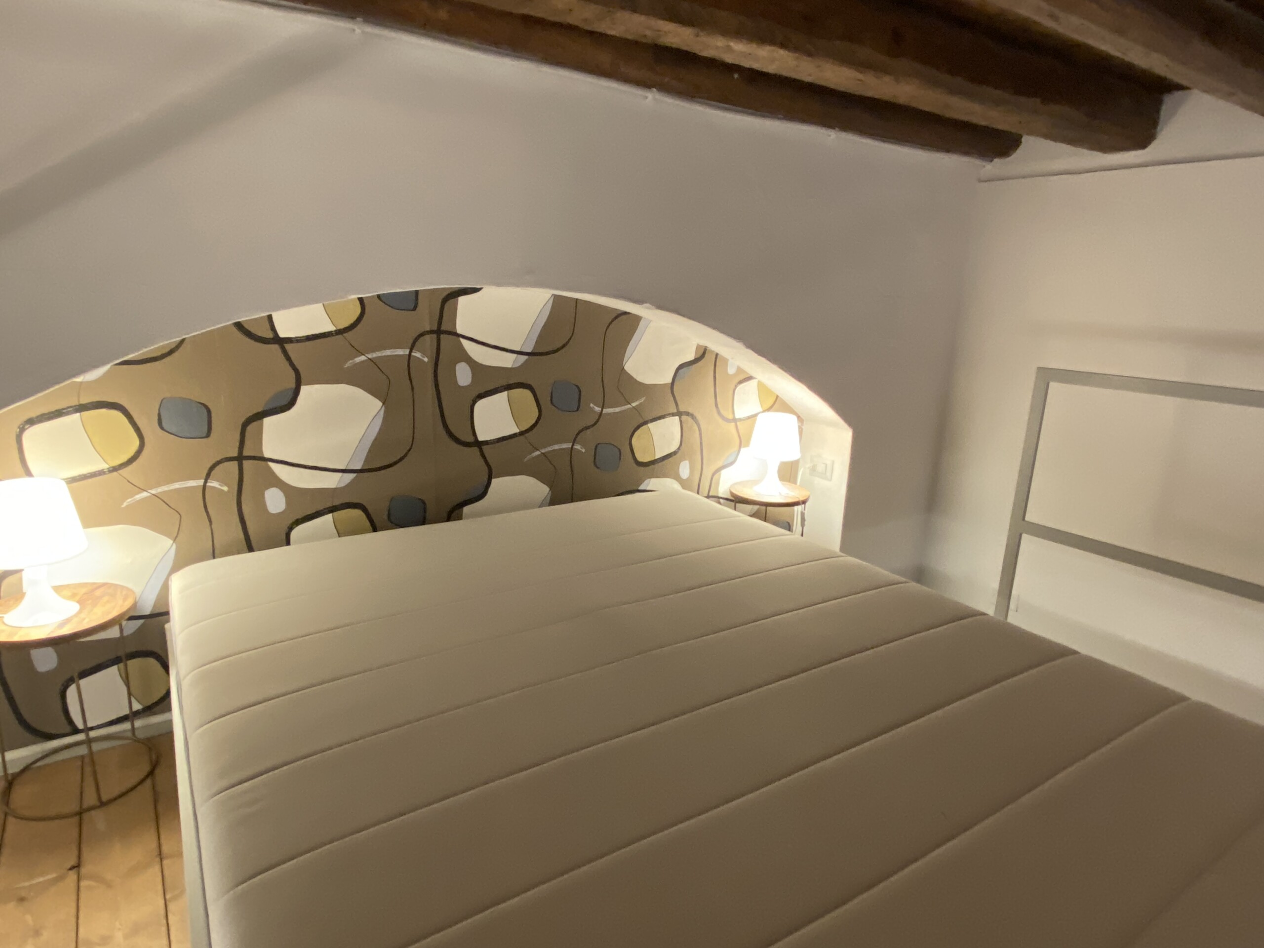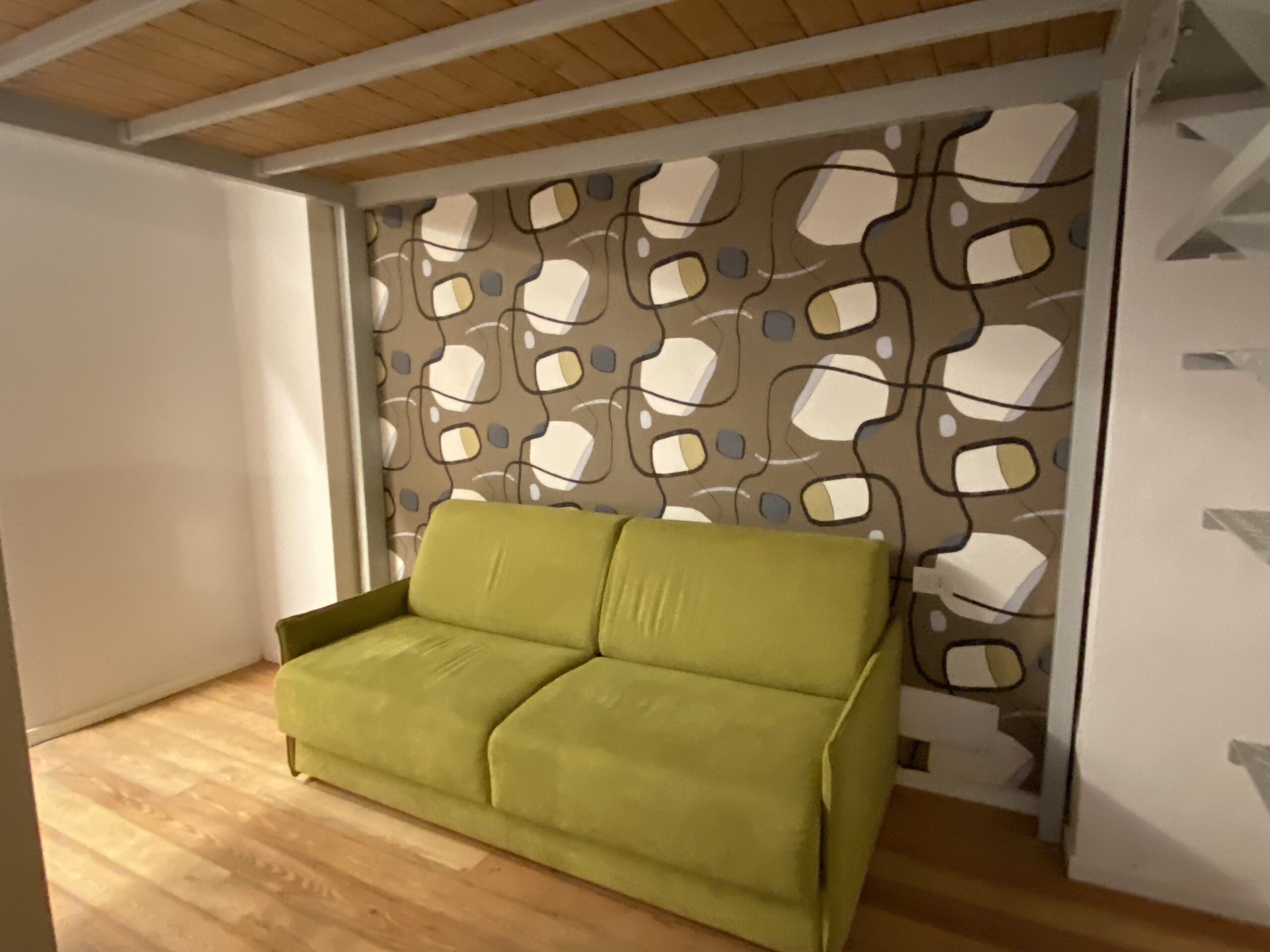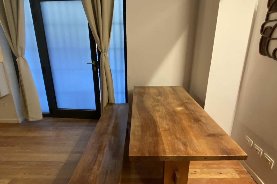 Above the living area, a charming mezzanine level hosts the sleeping area, featuring a double bed and bedside tables. Please note that the height of the loft sleeping area is approximately 1.60 meters. The loft stands out for its character, with a lovely arched detail that preserves the original style of the building, adding warmth and personality to the space. The lighting has been carefully designed throughout the apartment, enhancing both the modern renovation and the architectural features.