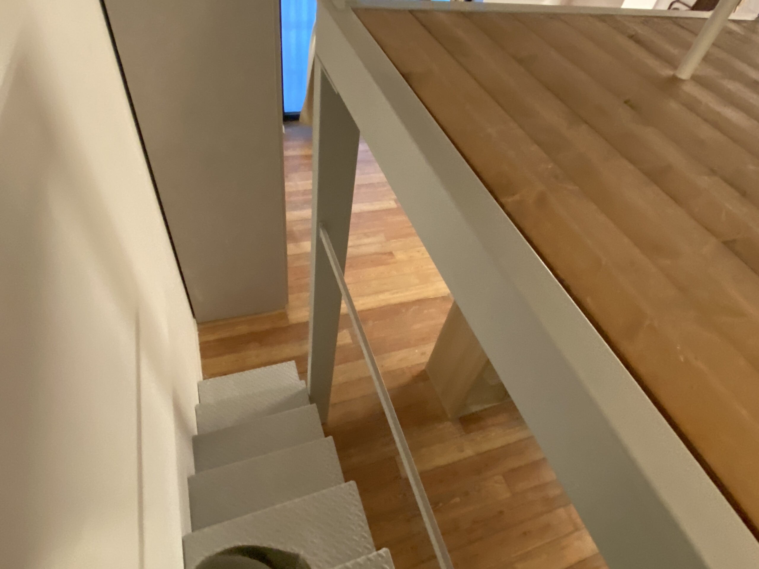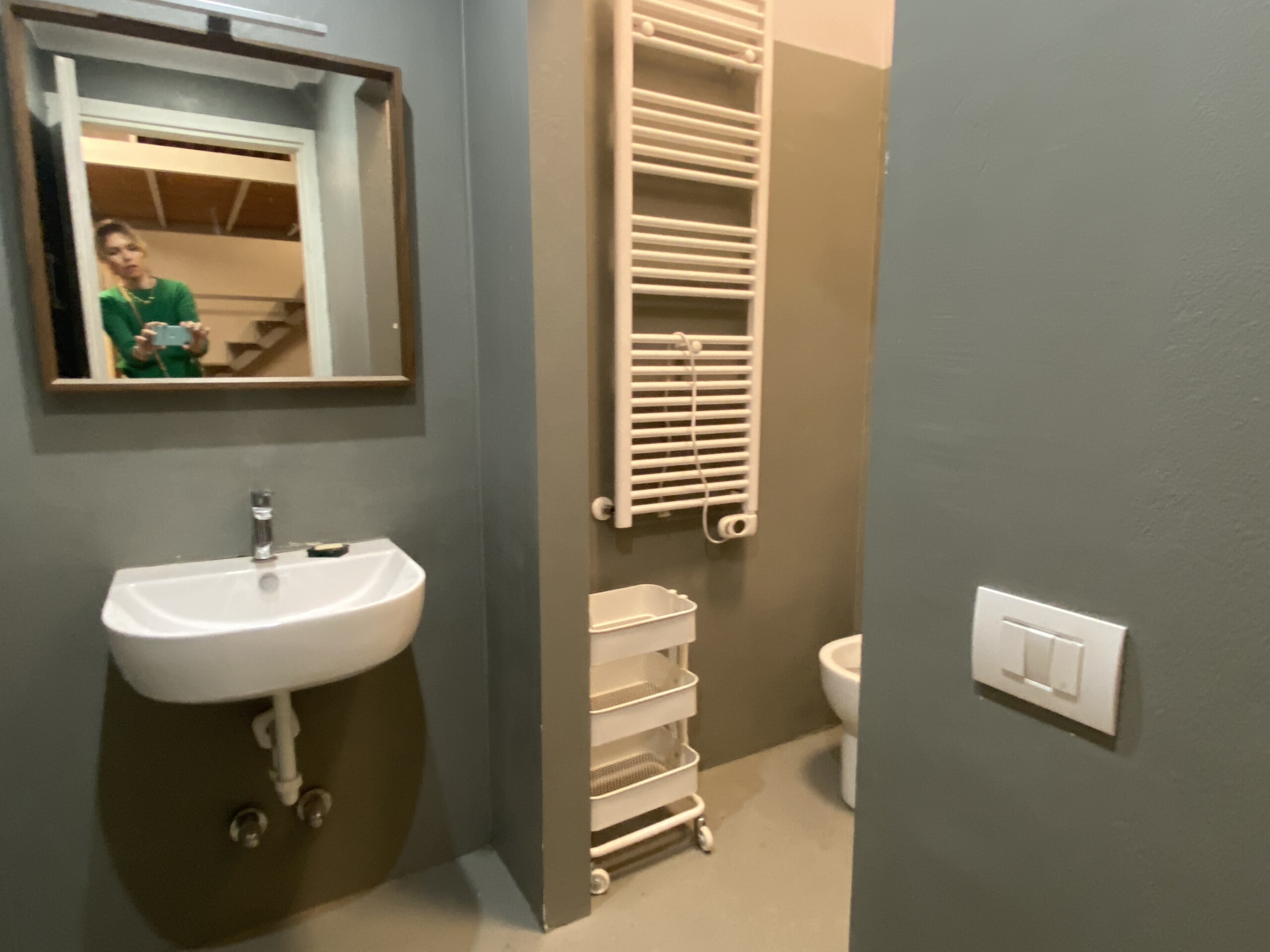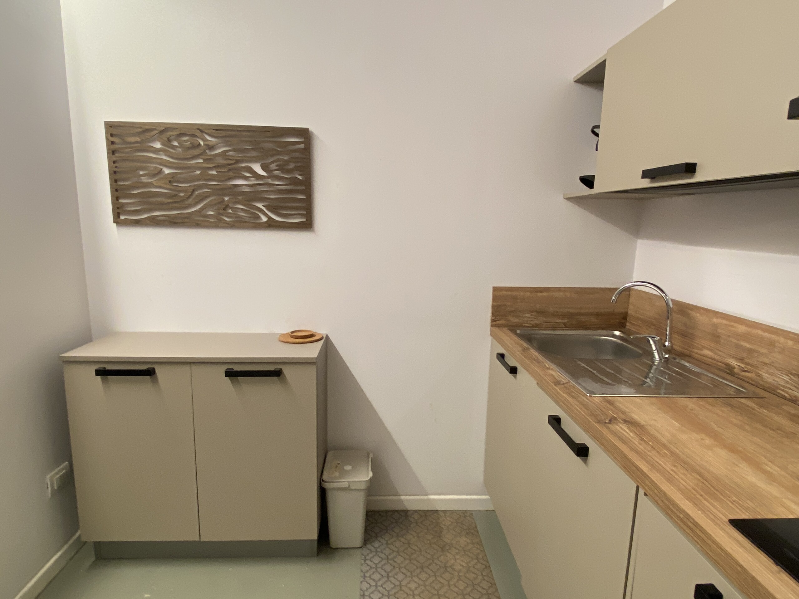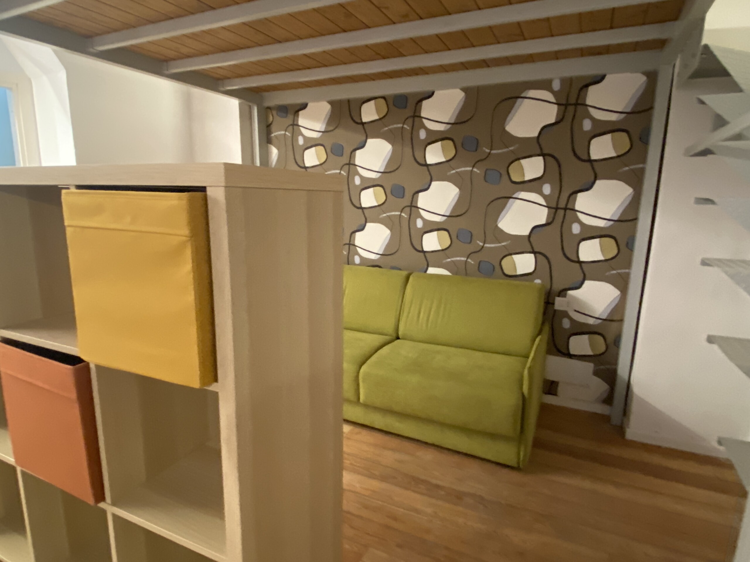 Above the living area, a charming mezzanine level hosts the sleeping area, featuring a double bed and bedside tables. Please note that the height of the loft sleeping area is approximately 1.60 meters. The loft stands out for its character, with a lovely arched detail that preserves the original style of the building, adding warmth and personality to the space. The lighting has been carefully designed throughout the apartment, enhancing both the modern renovation and the architectural features.