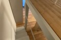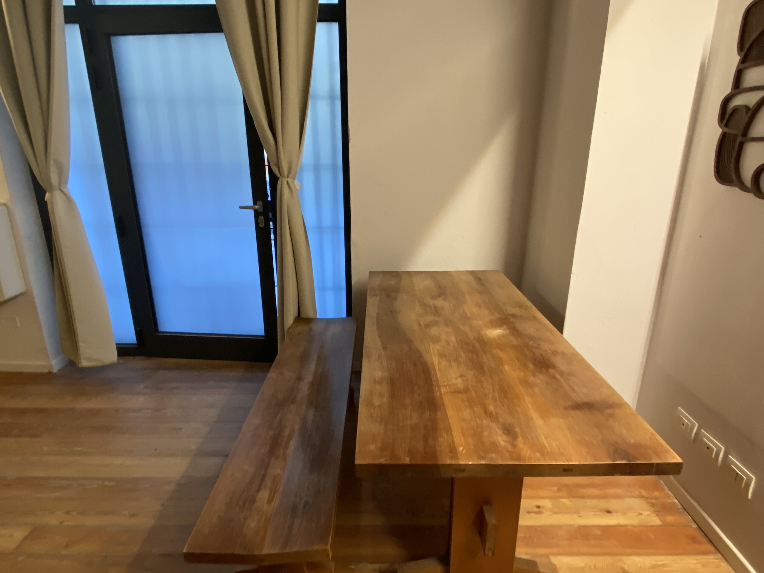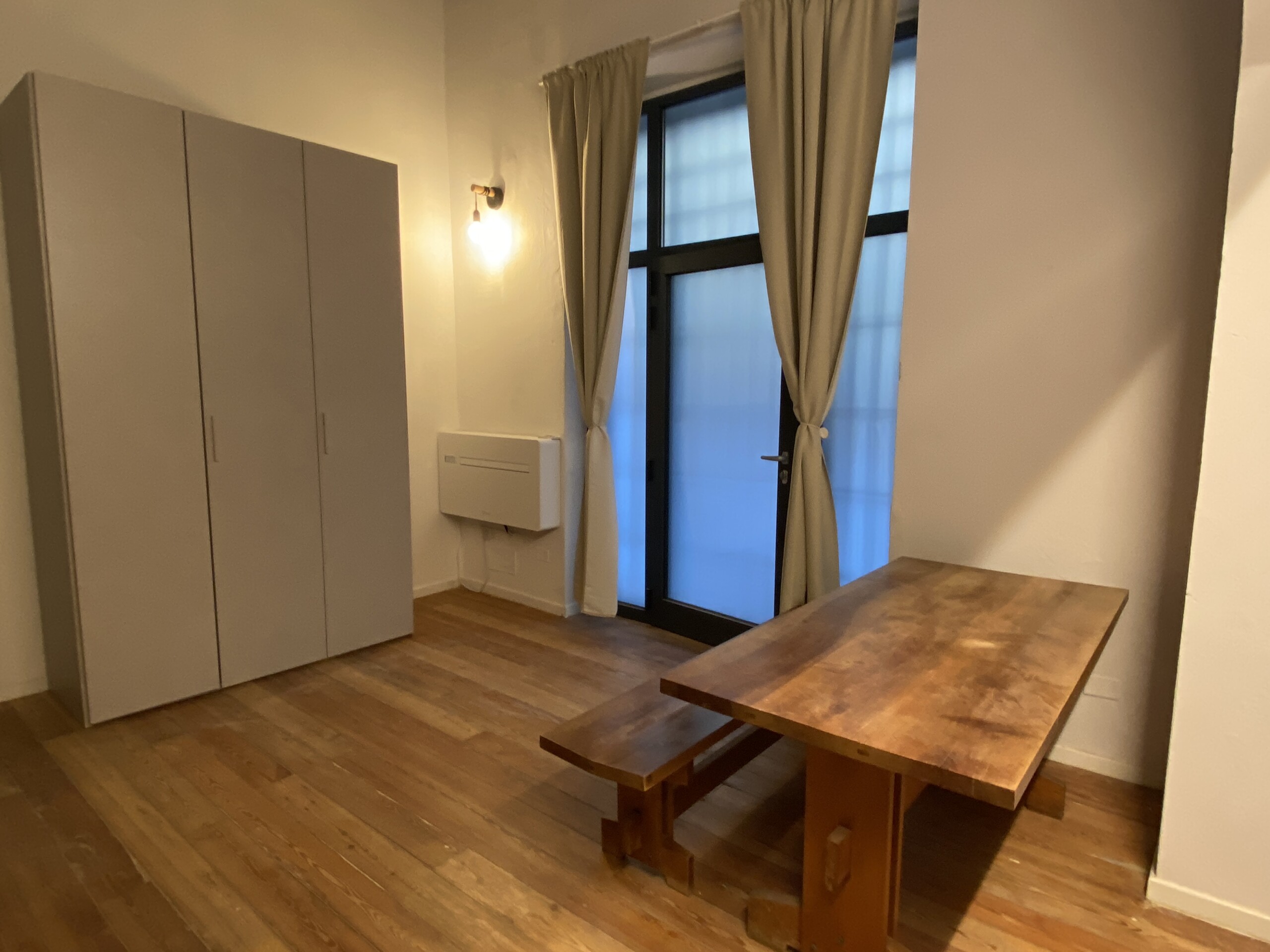 The apartment has been recently renovated and is equipped with air conditioning. The entrance door features frosted glass, allowing natural light to filter in while maintaining privacy. The same detail is repeated above the door, further enhancing the brightness of the space.