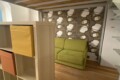 Upon entering, you are welcomed into a spacious and modern open-plan living area. The layout is thoughtfully designed, with a colorful bookshelf acting as a subtle divider between the different spaces. Behind it, you’ll find a comfortable sofa area (sofa-bed), while on the left there is a wooden dining table with chairs, and on the right a TV corner.