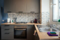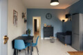 This modern one-bedroom apartment is recently renovated, very cozy, bright, and extremely quiet. It features a comfortable living room with an open-plan kitchen, equipped with a sofa and a TV. The kitchen is fully furnished with all necessary appliances, a dining table, and chairs.