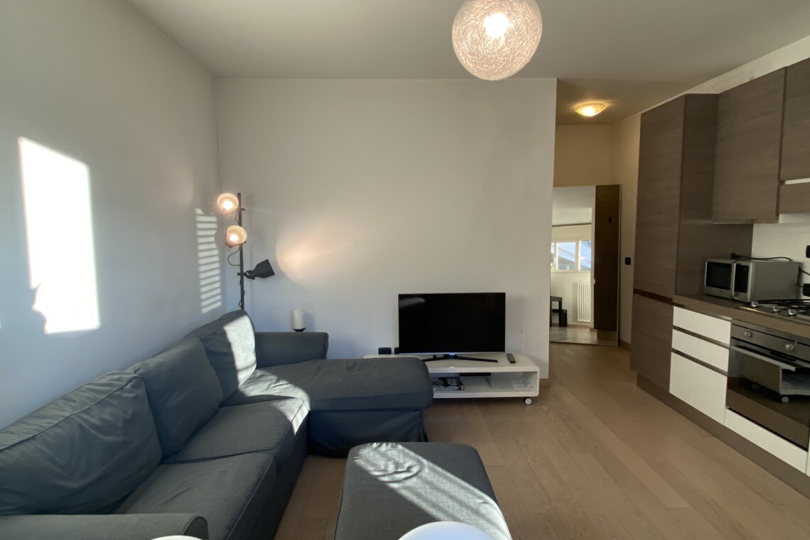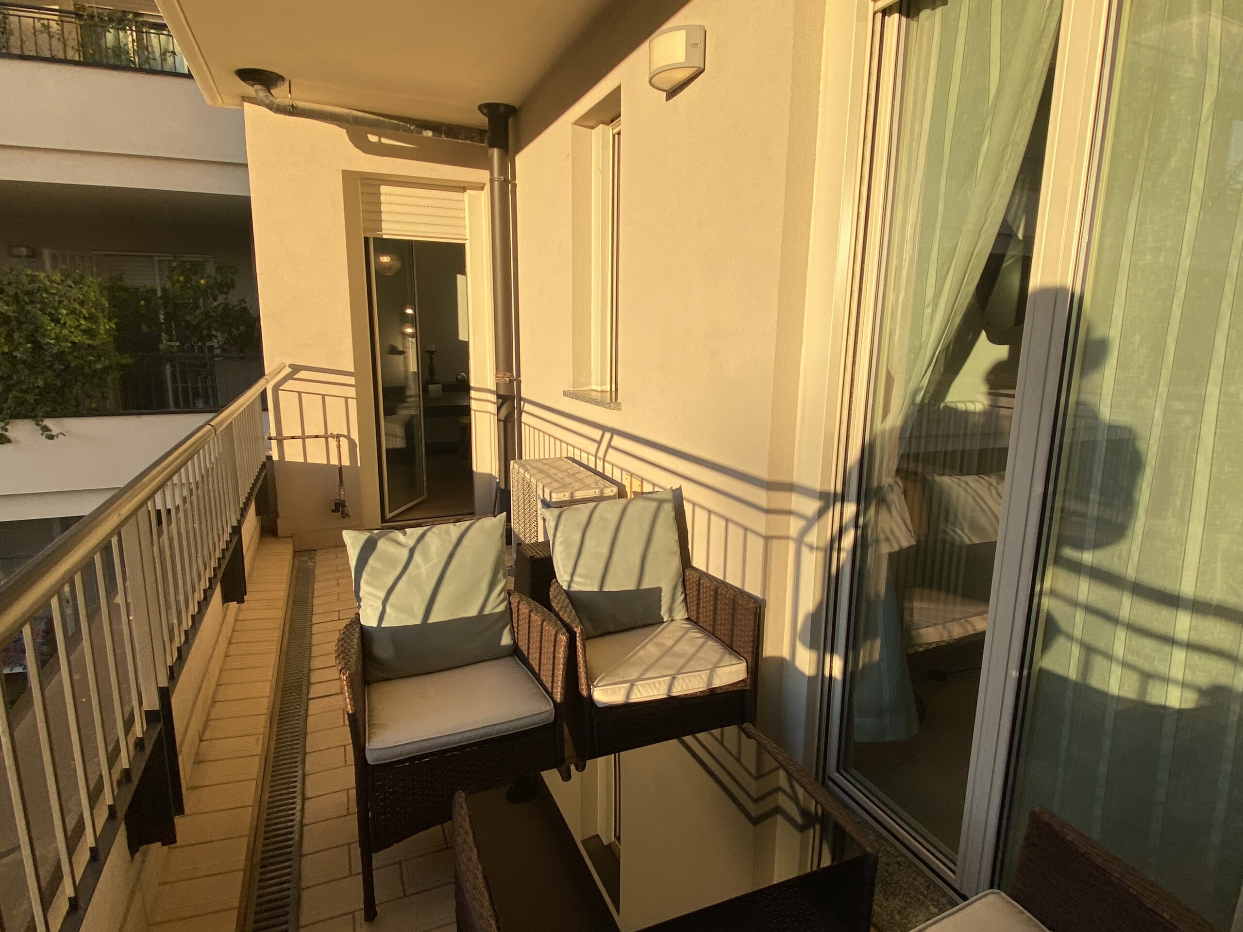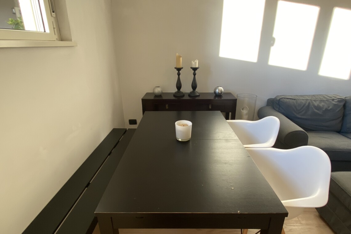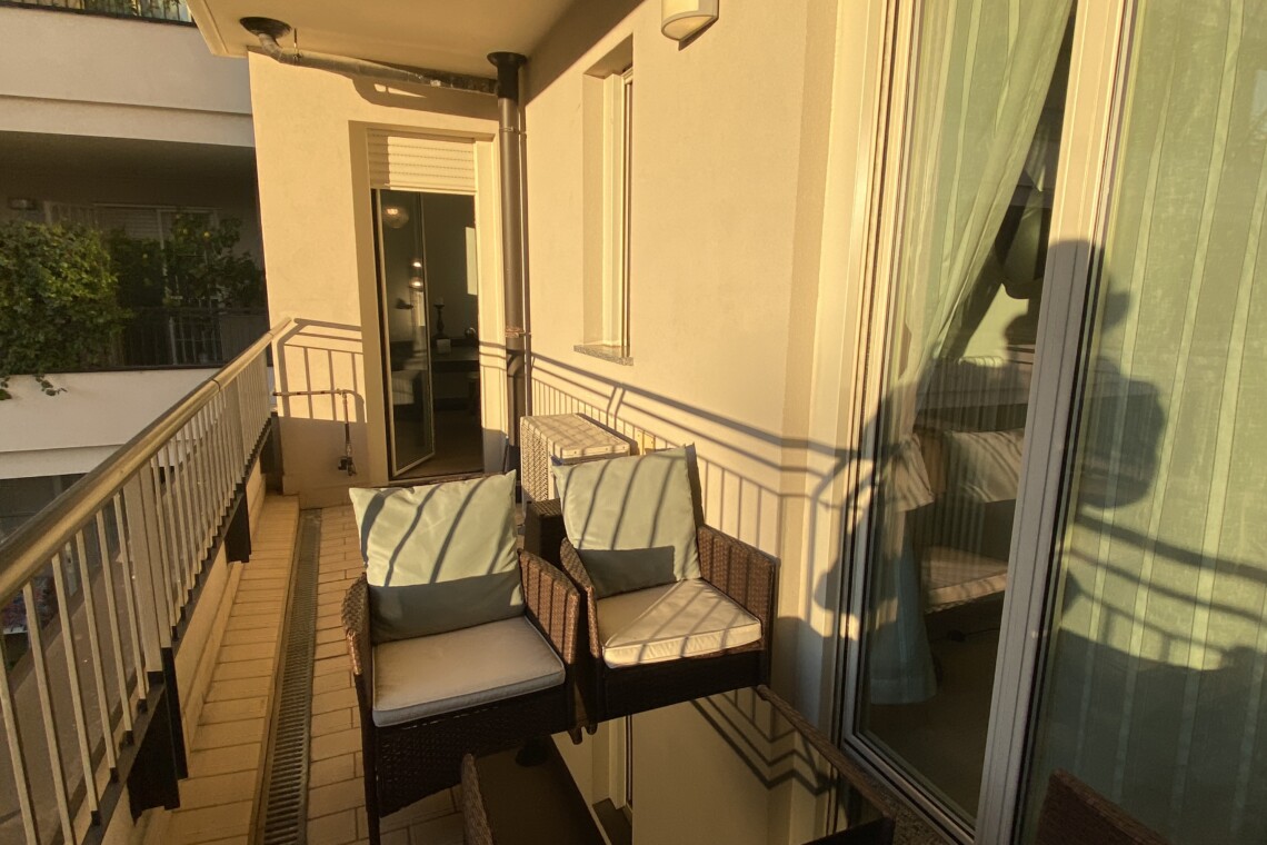 As you enter, a welcoming hallway opens on the right into the living room. The living area includes a modern fully equipped open-plan kitchen with gas hobs, electric oven, microwave, dishwasher, fridge and freezer. The living room is furnished with a large and comfortable L-shaped sofa, a pouf, TV and a dining table with two chairs and a bench. Two windows and a French door bring plenty of natural light and lead to the spacious balcony, furnished with table and chairs. On the balcony you will also find the washing machine and dryer. The view overlooks the quiet and green inner courtyard.