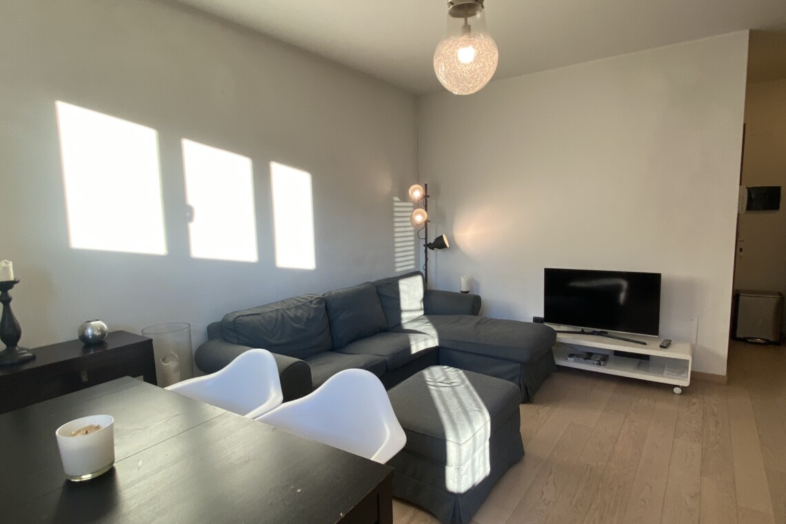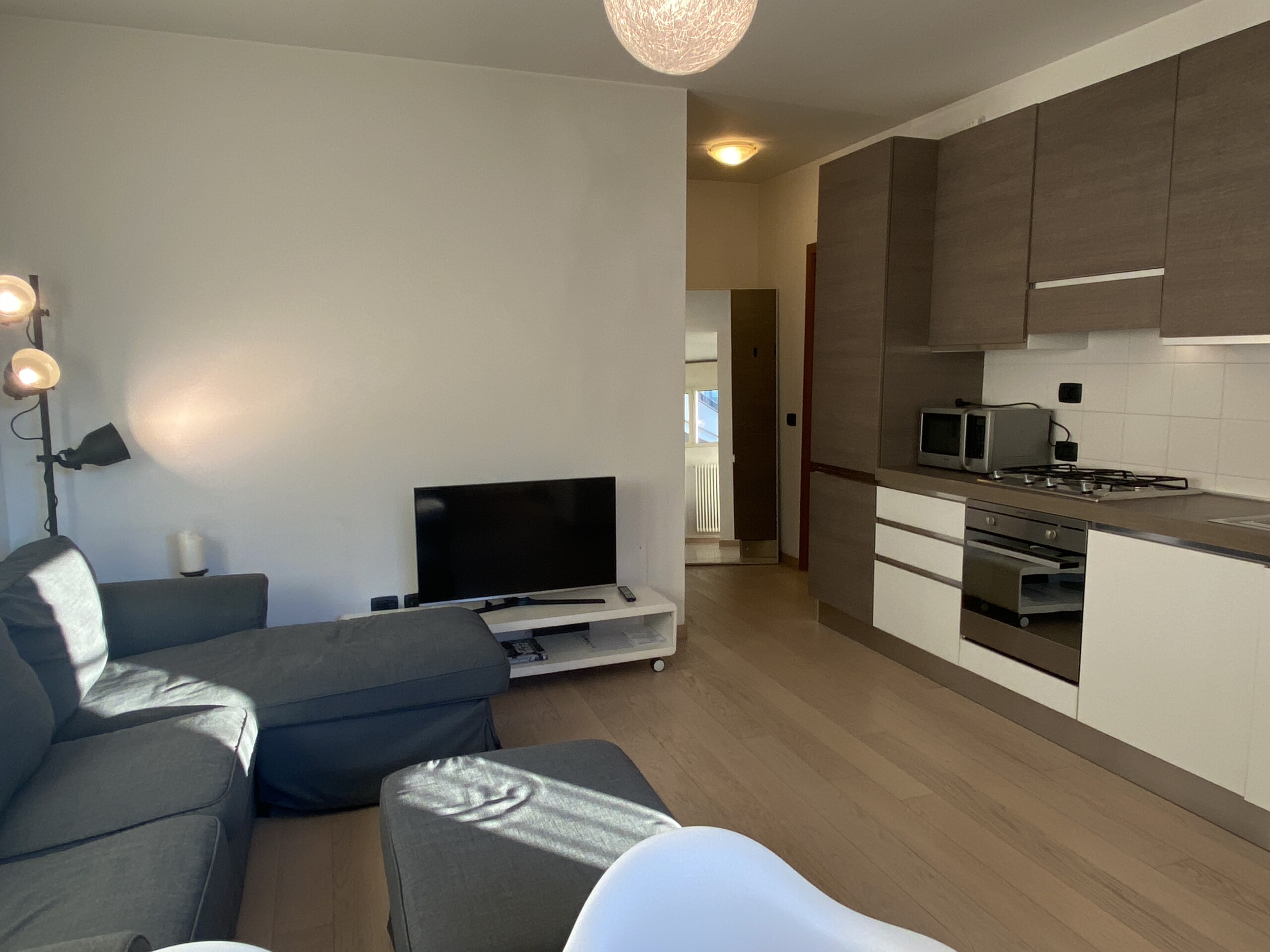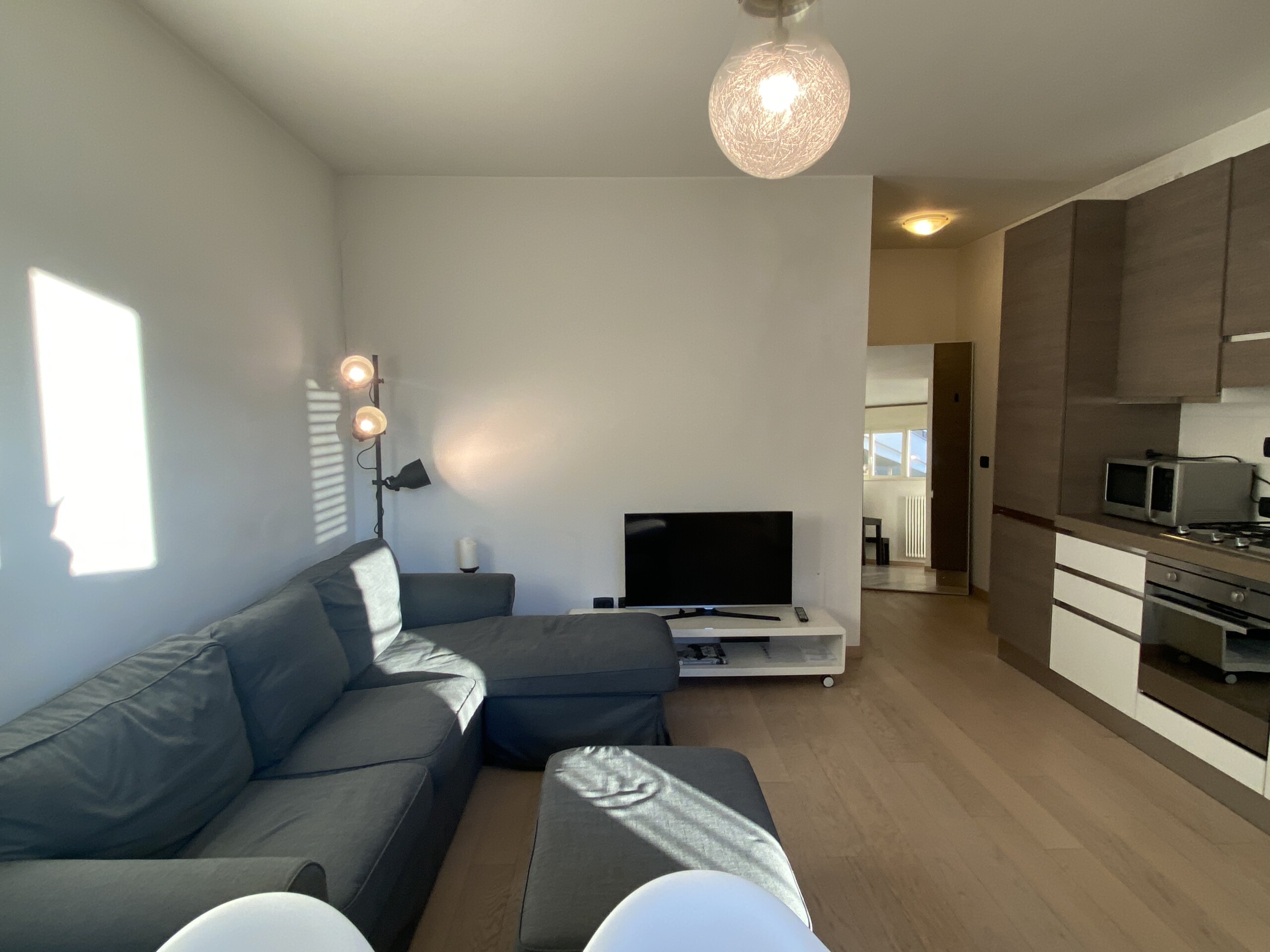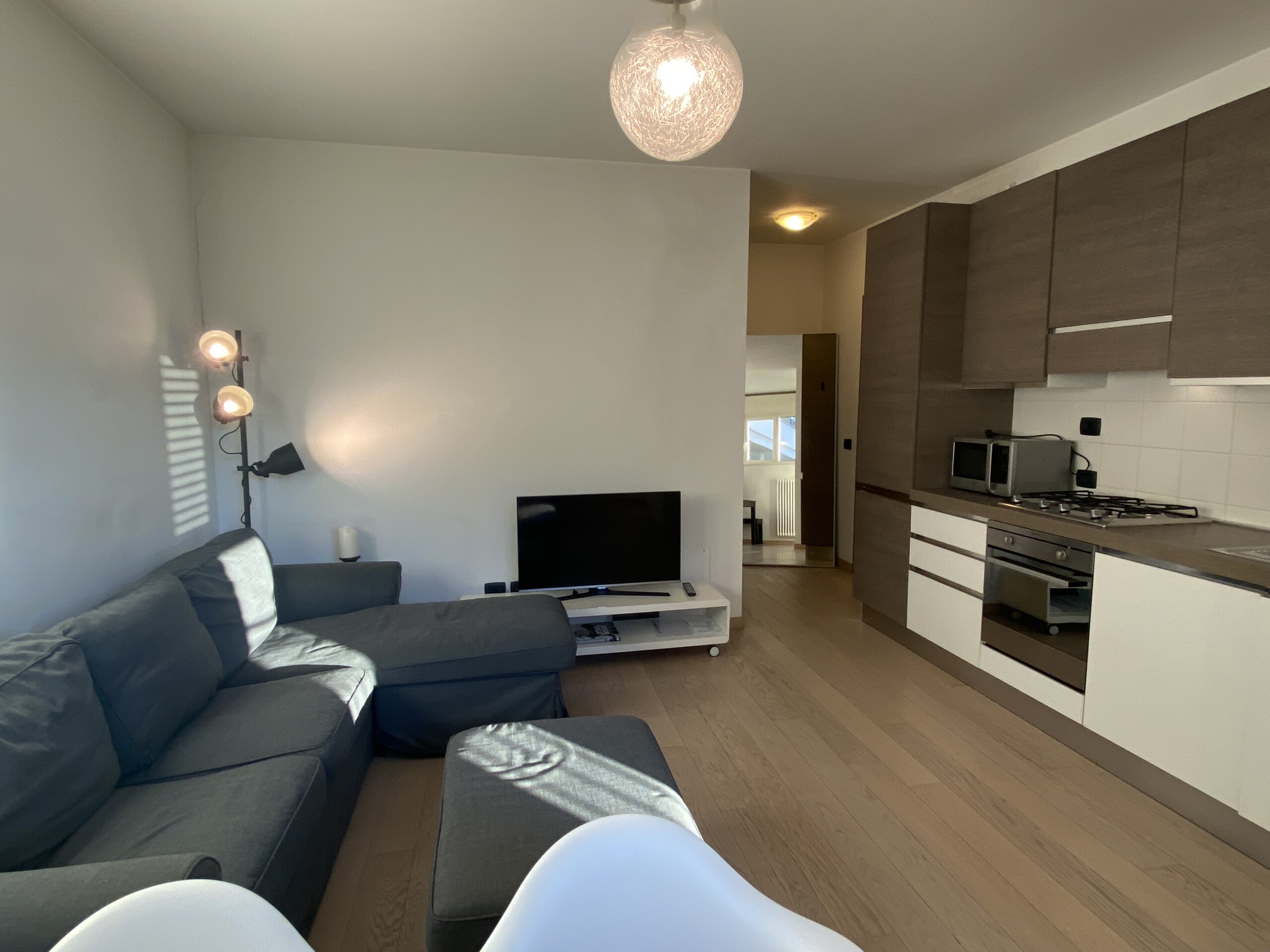 As you enter, a welcoming hallway opens on the right into the living room. The living area includes a modern fully equipped open-plan kitchen with gas hobs, electric oven, microwave, dishwasher, fridge and freezer. The living room is furnished with a large and comfortable L-shaped sofa, a pouf, TV and a dining table with two chairs and a bench. Two windows and a French door bring plenty of natural light and lead to the spacious balcony, furnished with table and chairs. On the balcony you will also find the washing machine and dryer. The view overlooks the quiet and green inner courtyard.