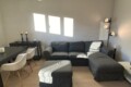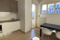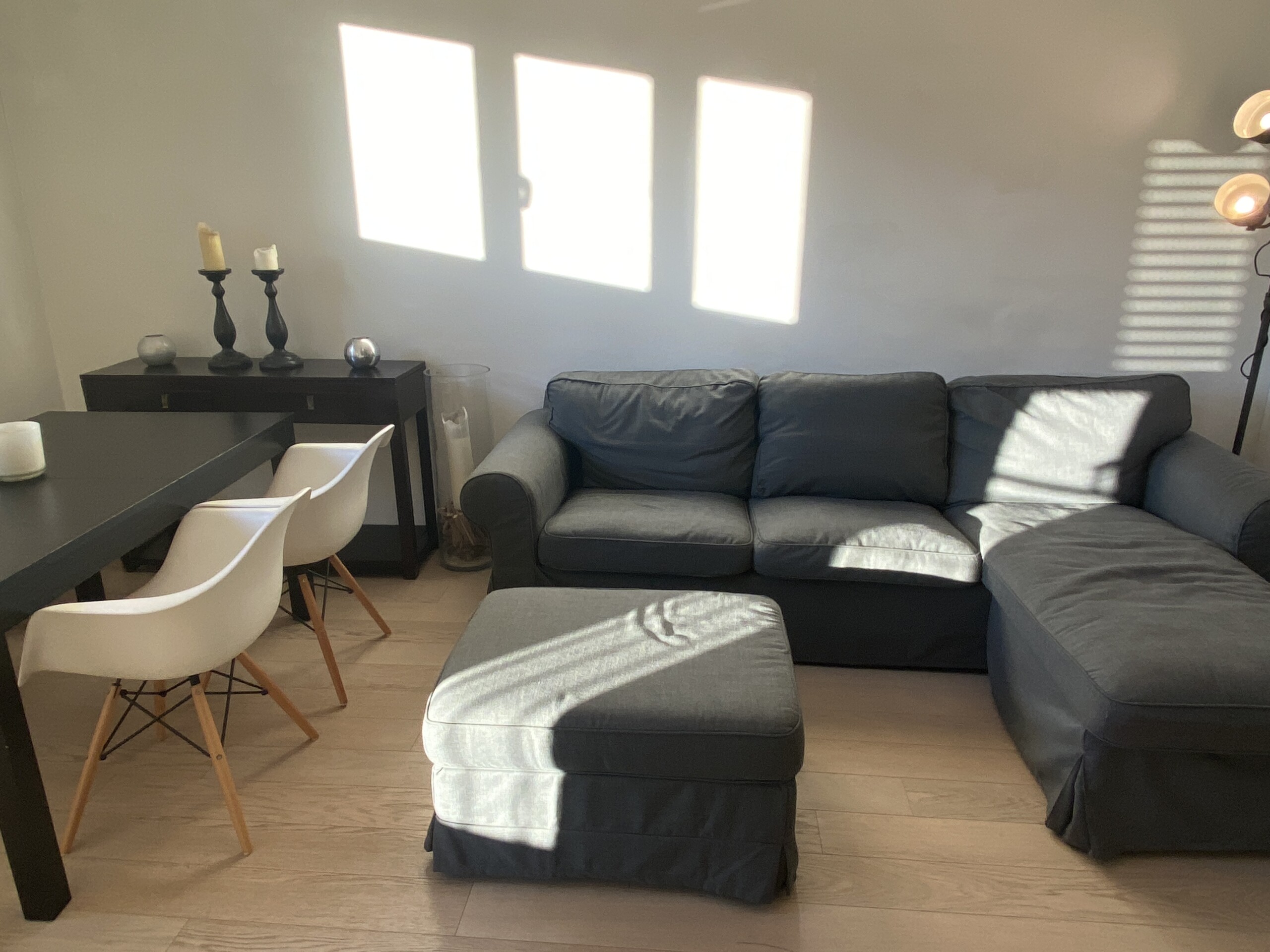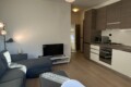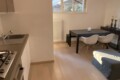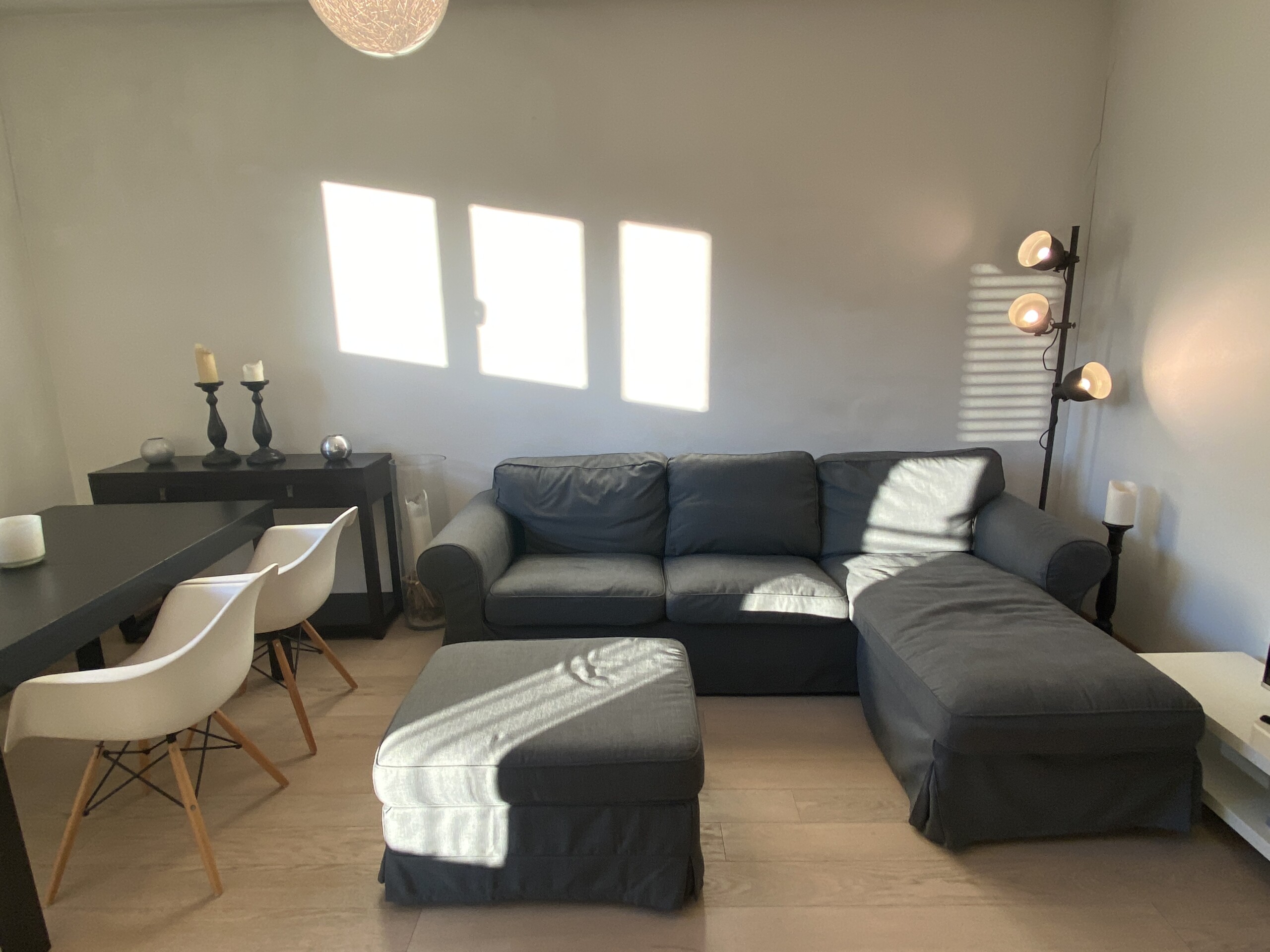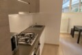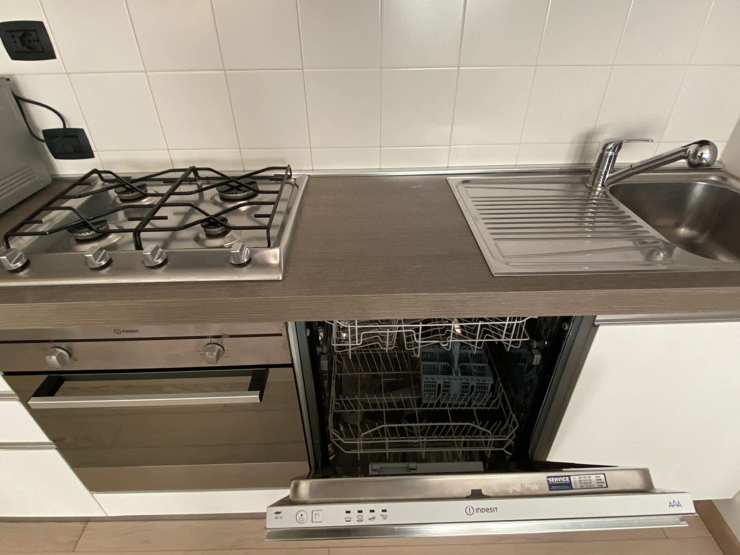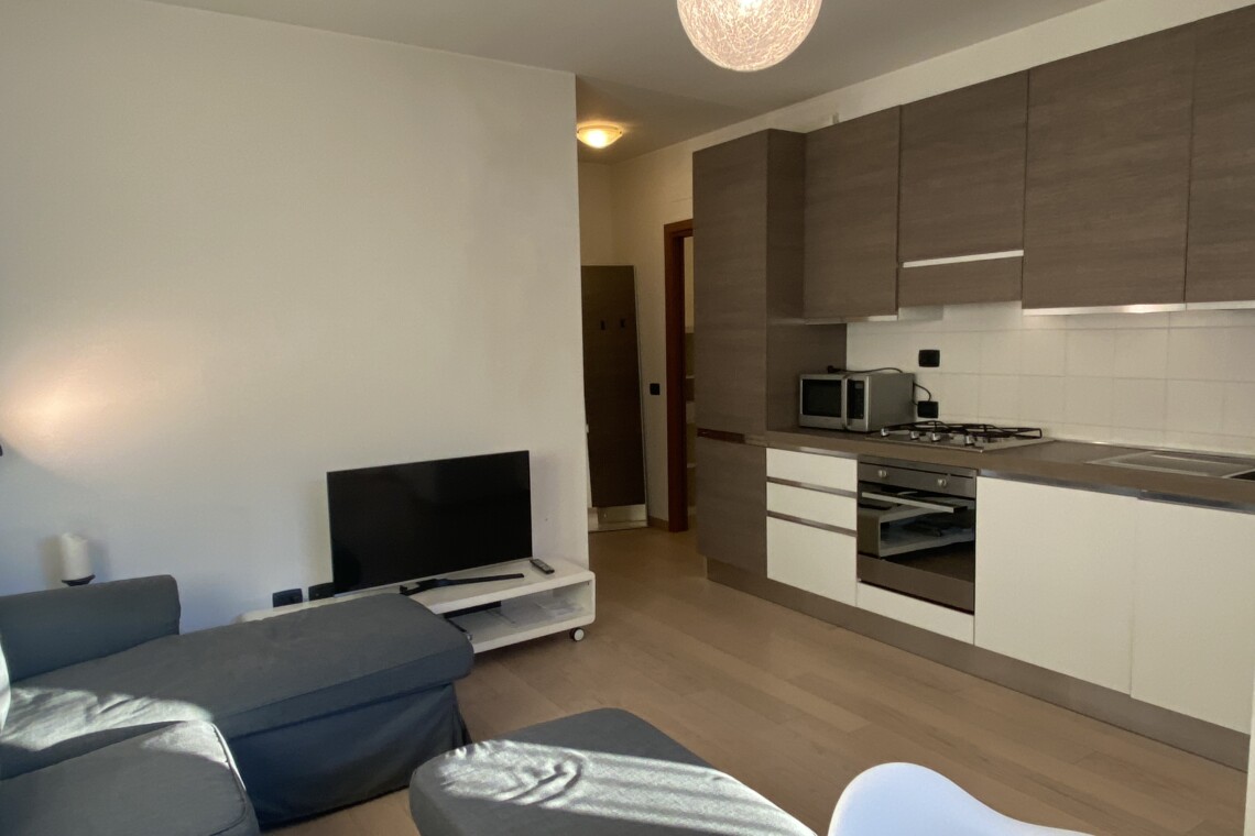 As you enter, a welcoming hallway opens on the right into the living room. The living area includes a modern fully equipped open-plan kitchen with gas hobs, electric oven, microwave, dishwasher, fridge and freezer. The living room is furnished with a large and comfortable L-shaped sofa, a pouf, TV and a dining table with two chairs and a bench. Two windows and a French door bring plenty of natural light and lead to the spacious balcony, furnished with table and chairs. On the balcony you will also find the washing machine and dryer. The view overlooks the quiet and green inner courtyard.