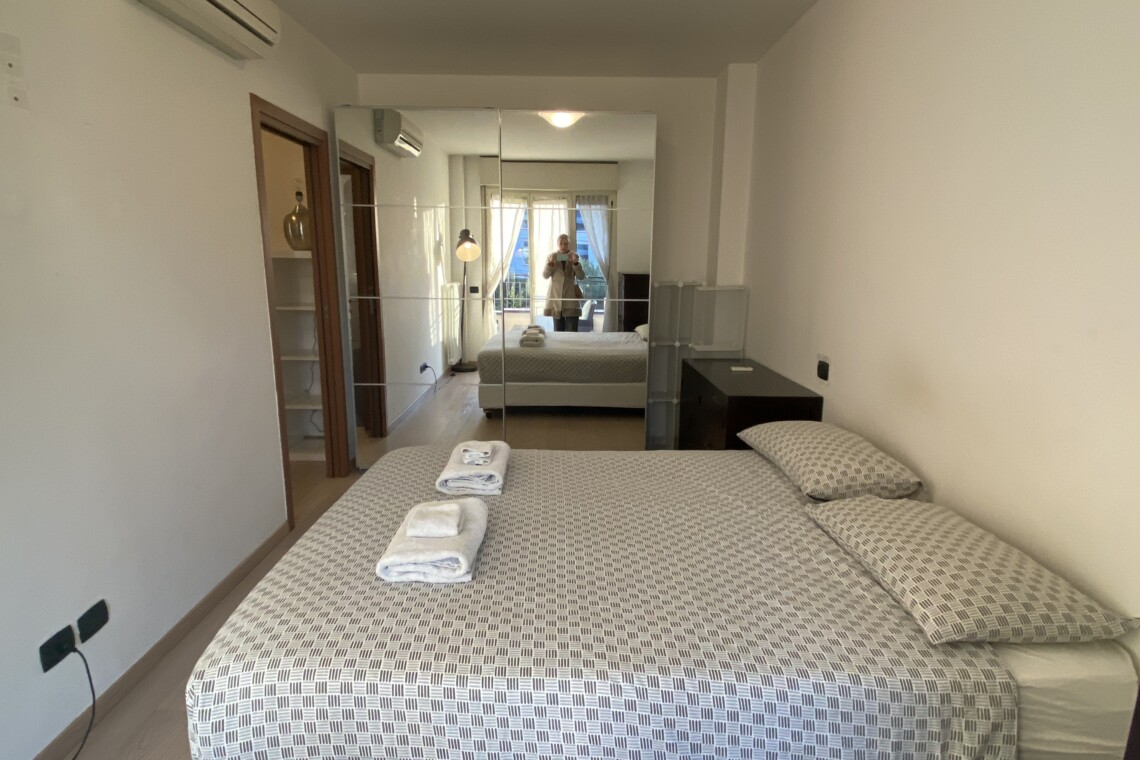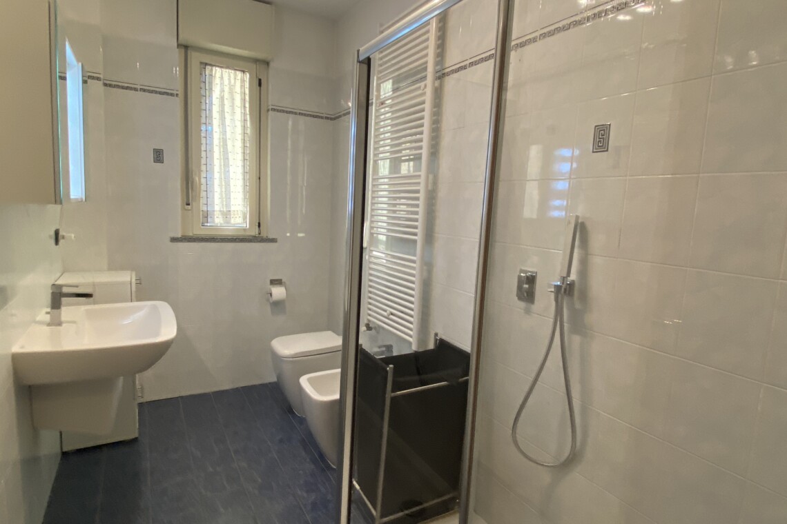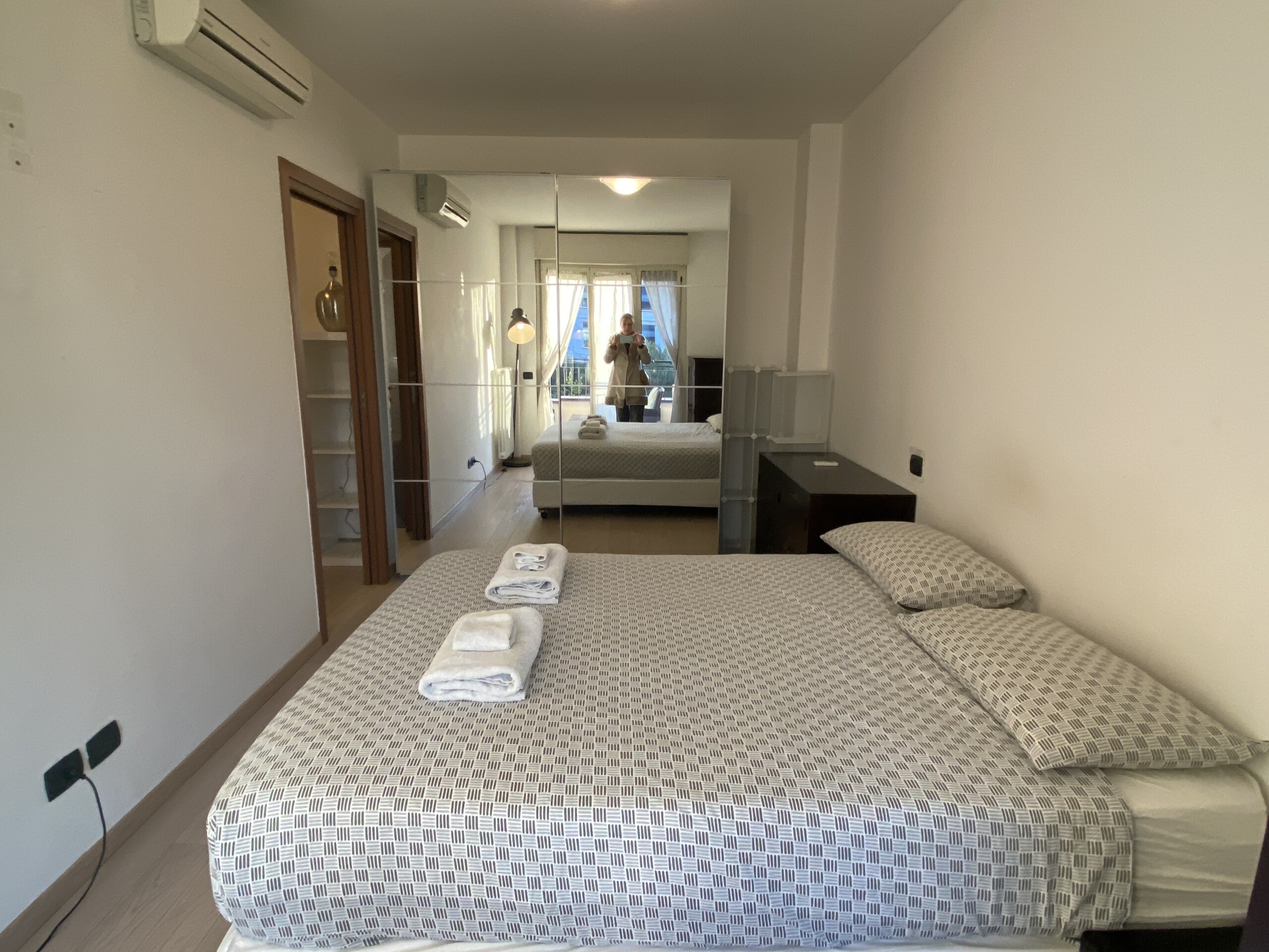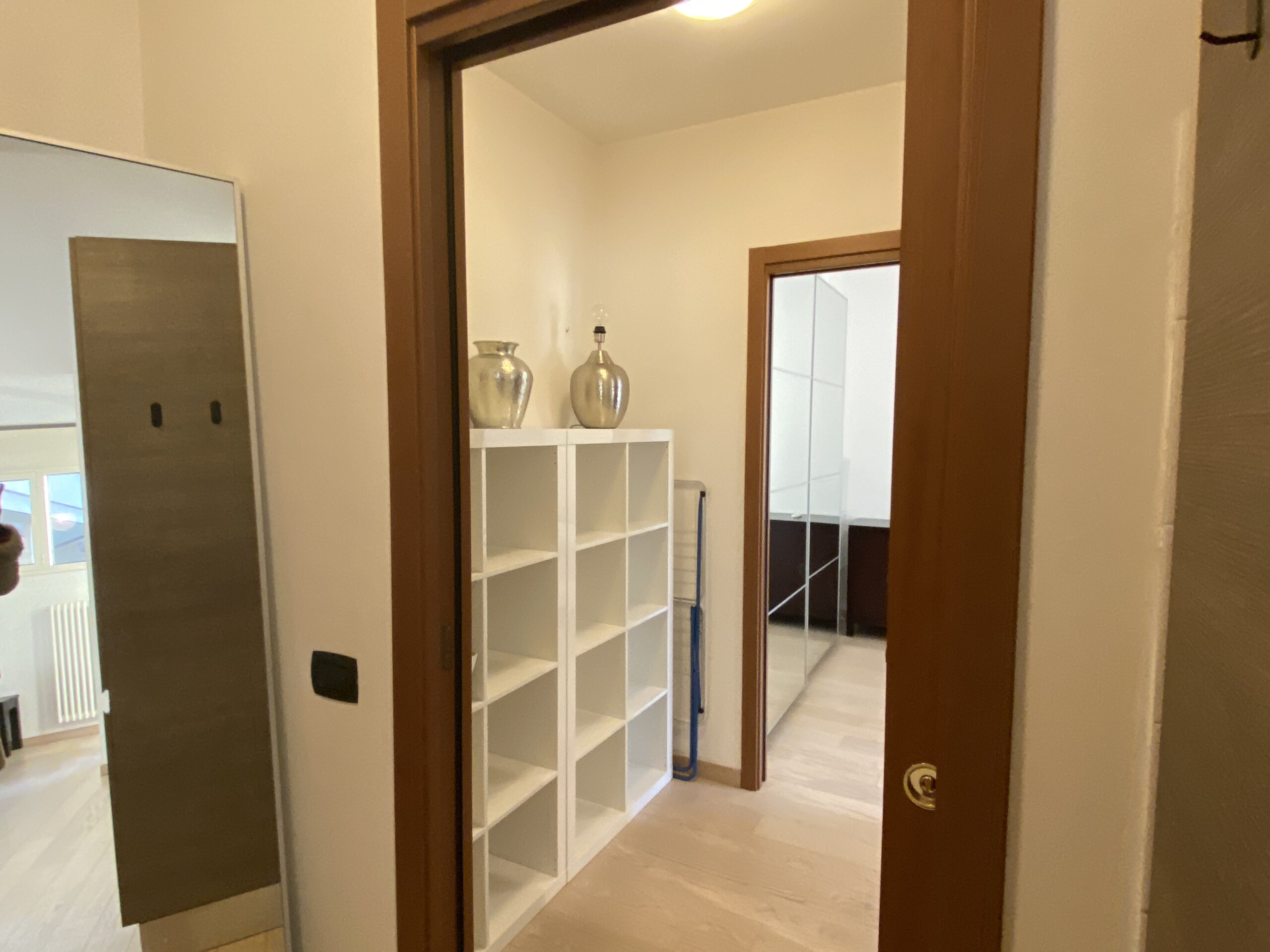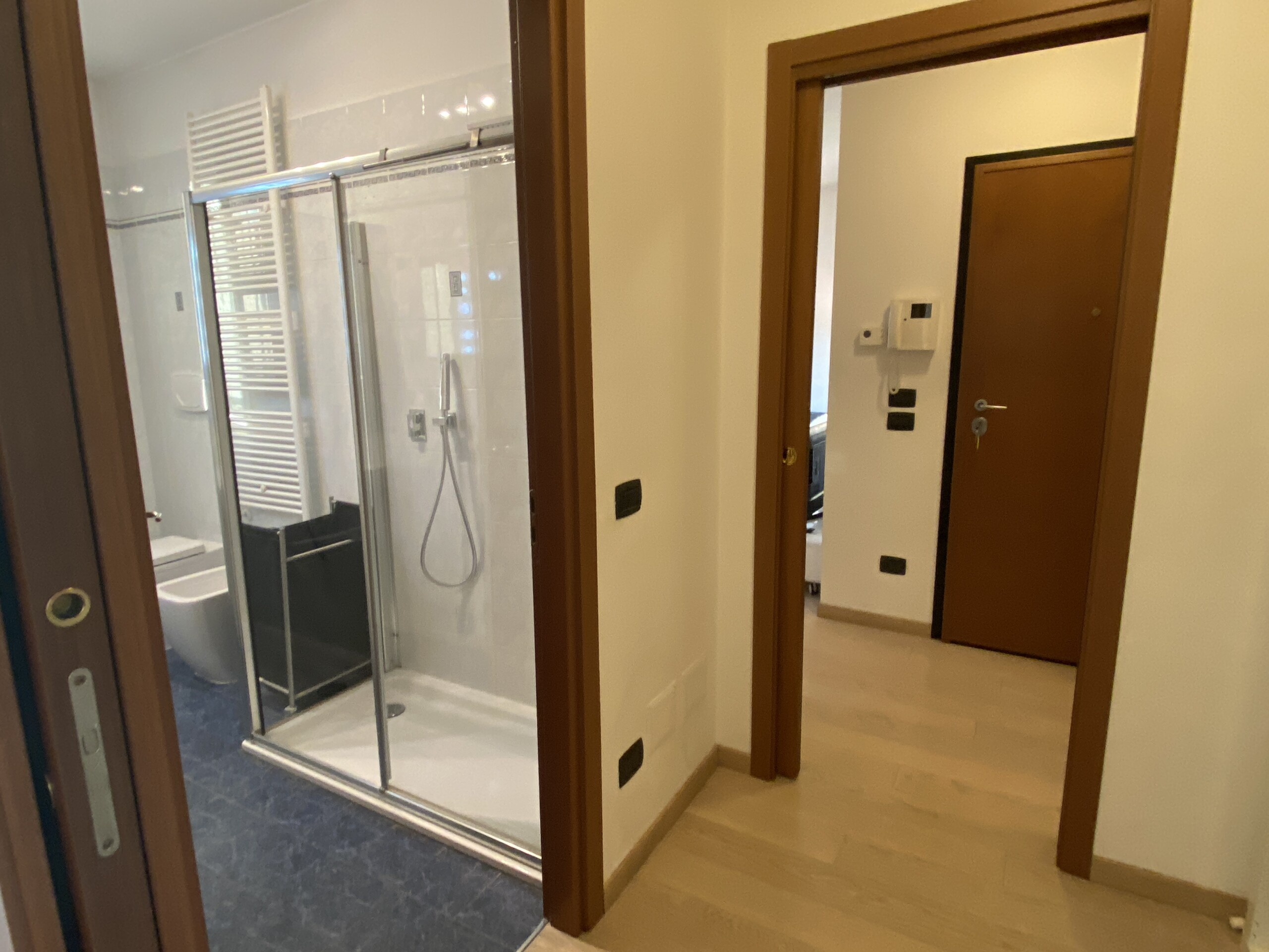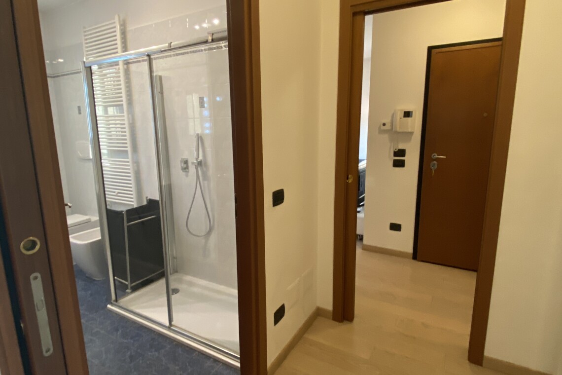 From the entrance you can also access a hallway with shelving, leading to the spacious and bright bedroom with a double bed, large wardrobe and another French door opening onto the balcony. The modern bathroom, located just before the bedroom, includes a wide shower, toilet, bidet and a window facing the balcony.