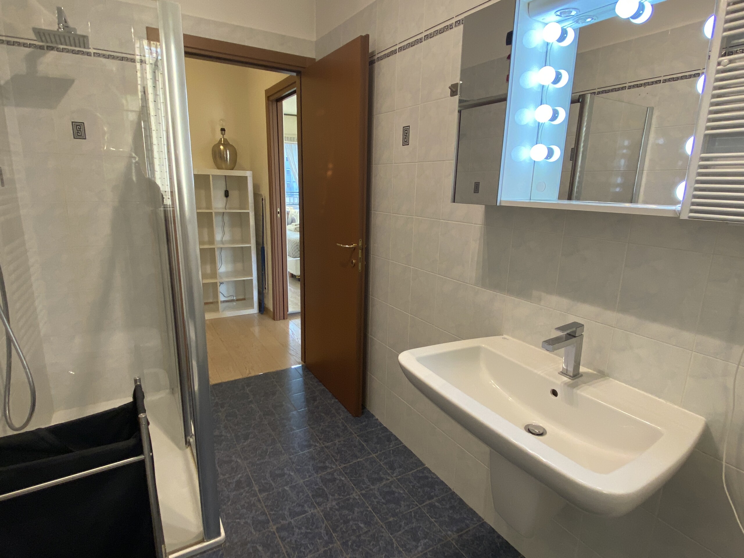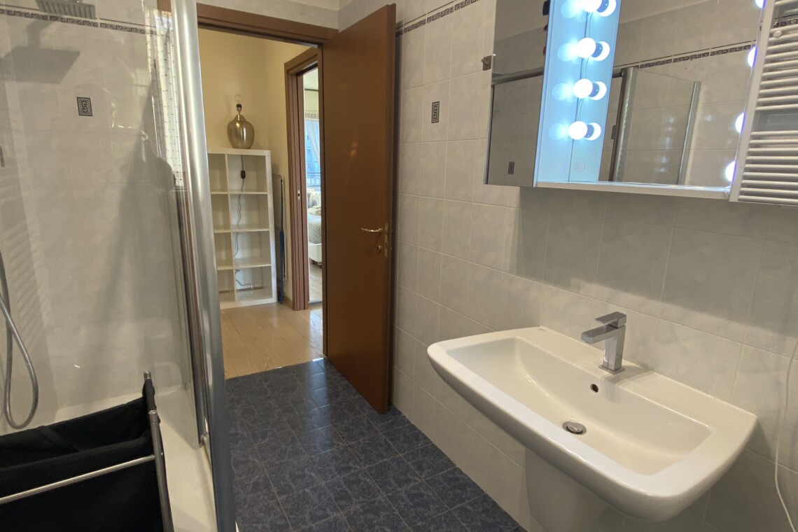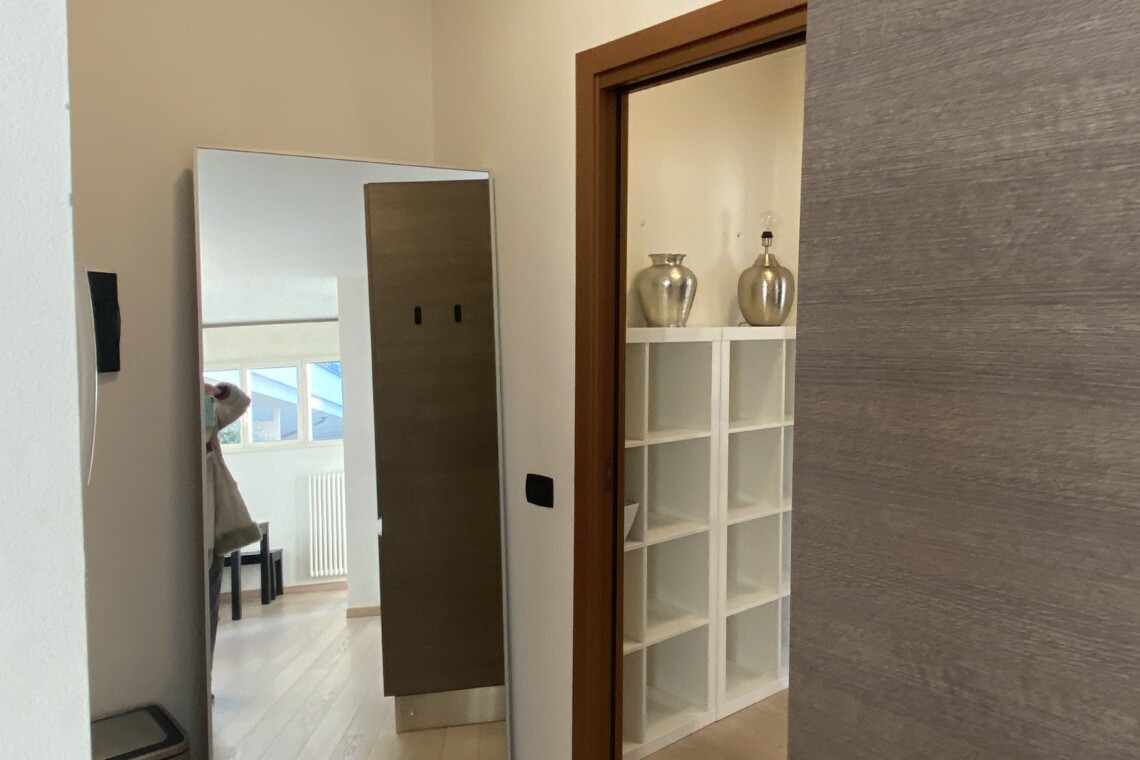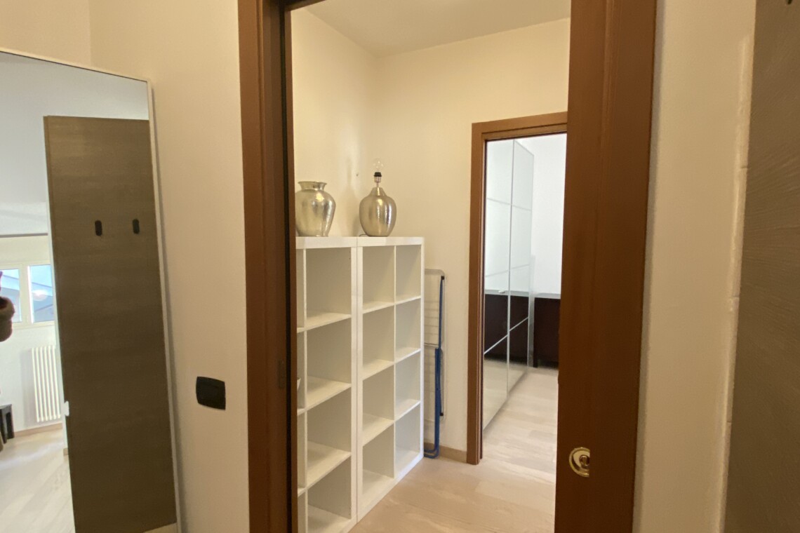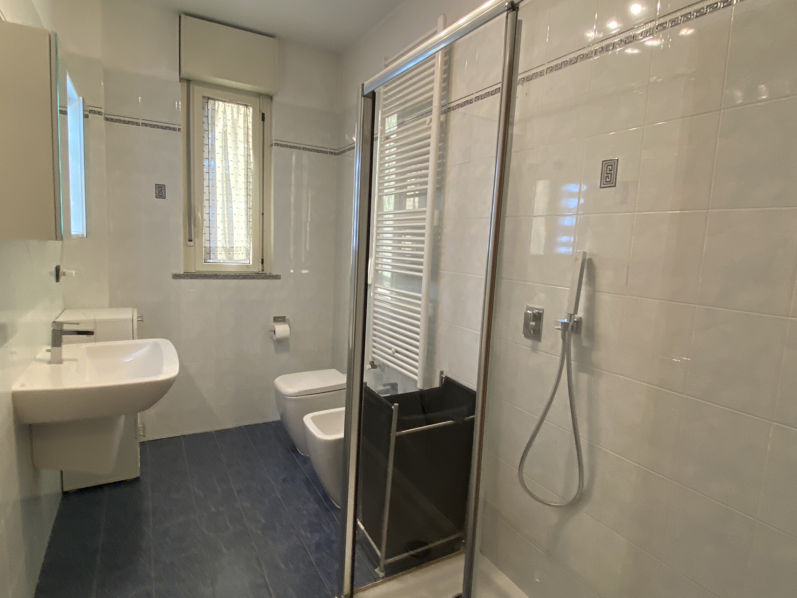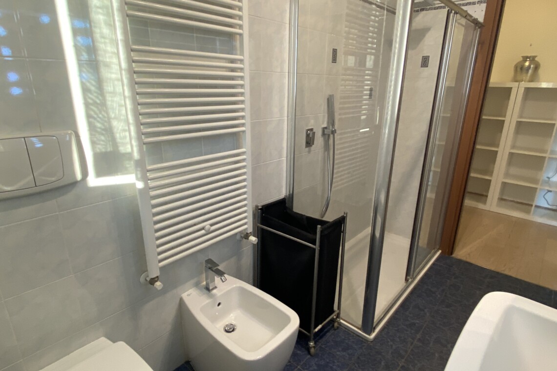 From the entrance you can also access a hallway with shelving, leading to the spacious and bright bedroom with a double bed, large wardrobe and another French door opening onto the balcony. The modern bathroom, located just before the bedroom, includes a wide shower, toilet, bidet and a window facing the balcony.