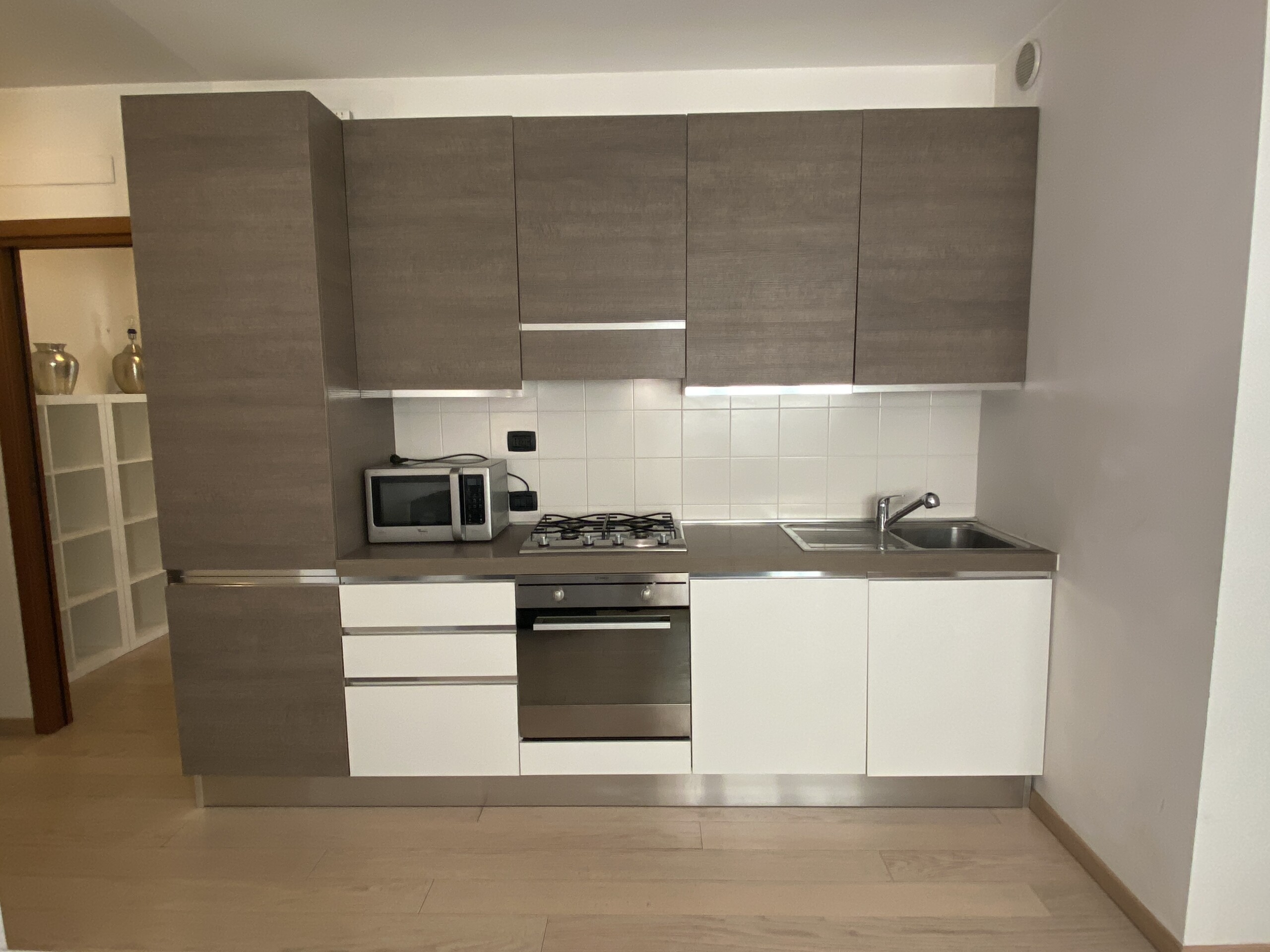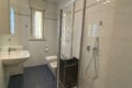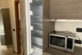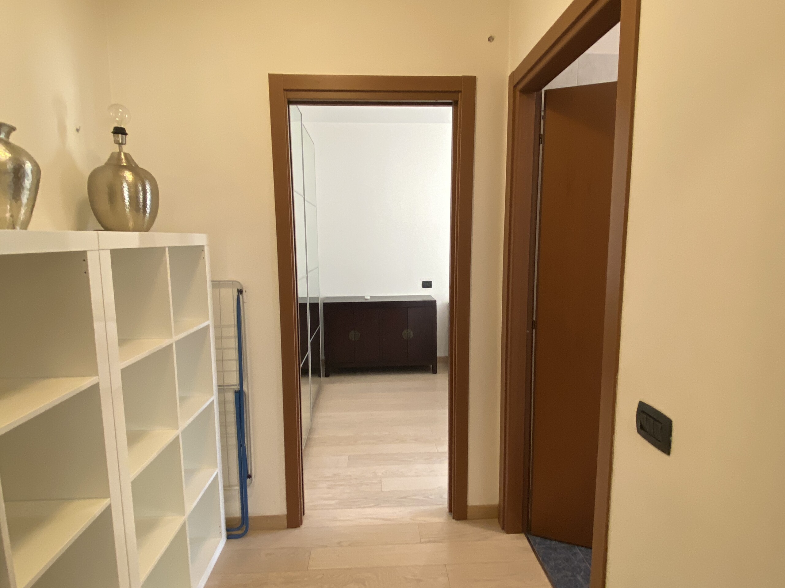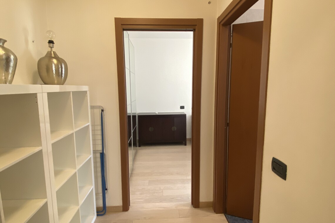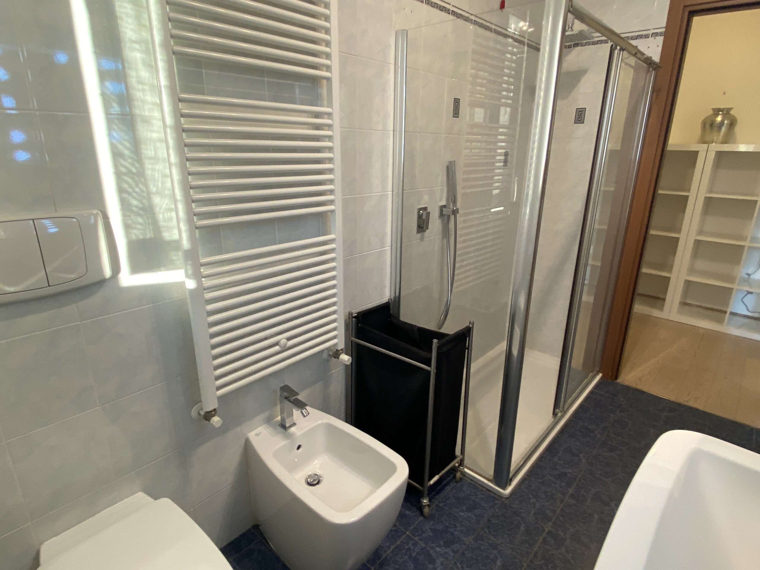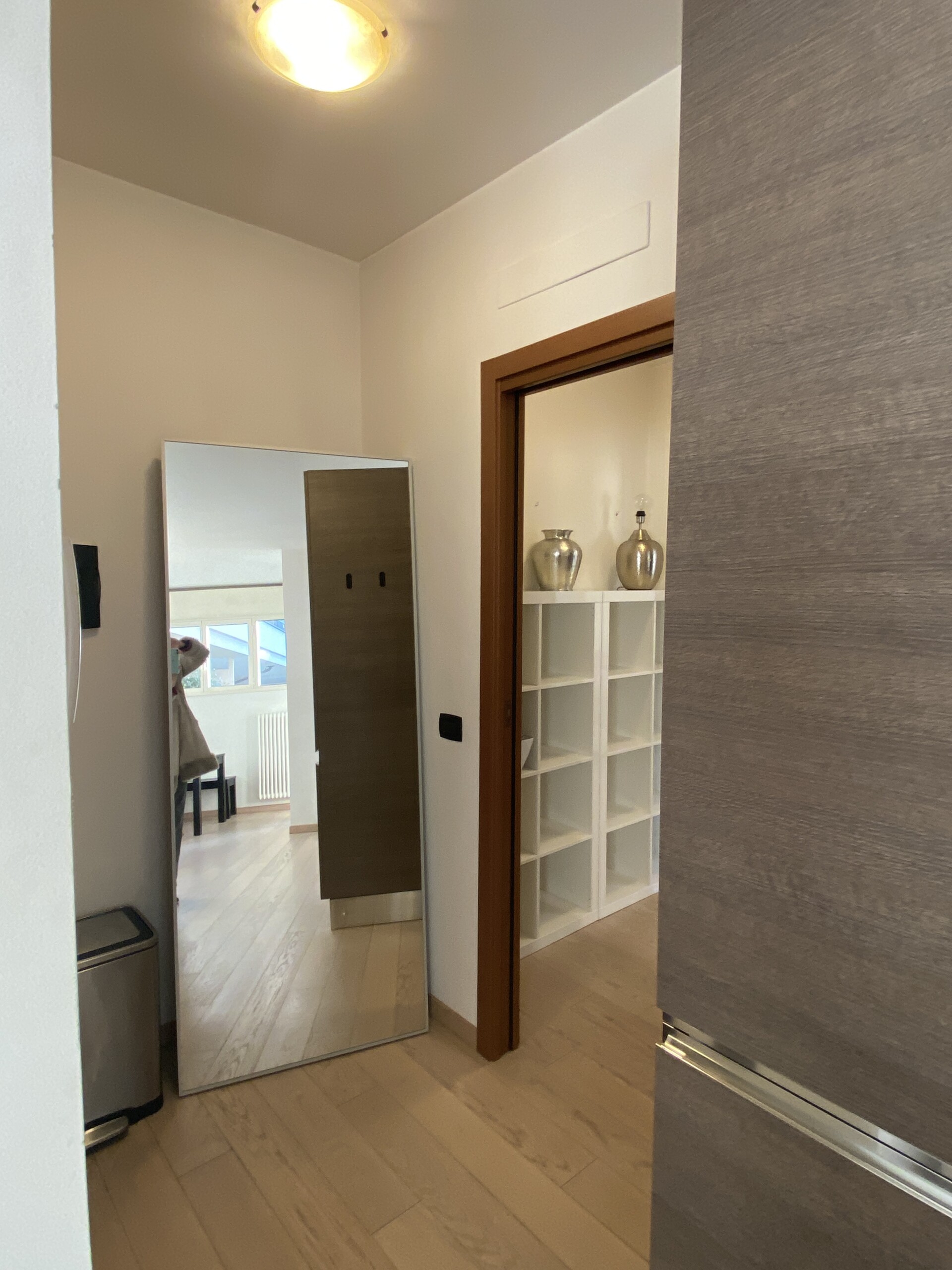 From the entrance you can also access a hallway with shelving, leading to the spacious and bright bedroom with a double bed, large wardrobe and another French door opening onto the balcony. The modern bathroom, located just before the bedroom, includes a wide shower, toilet, bidet and a window facing the balcony.